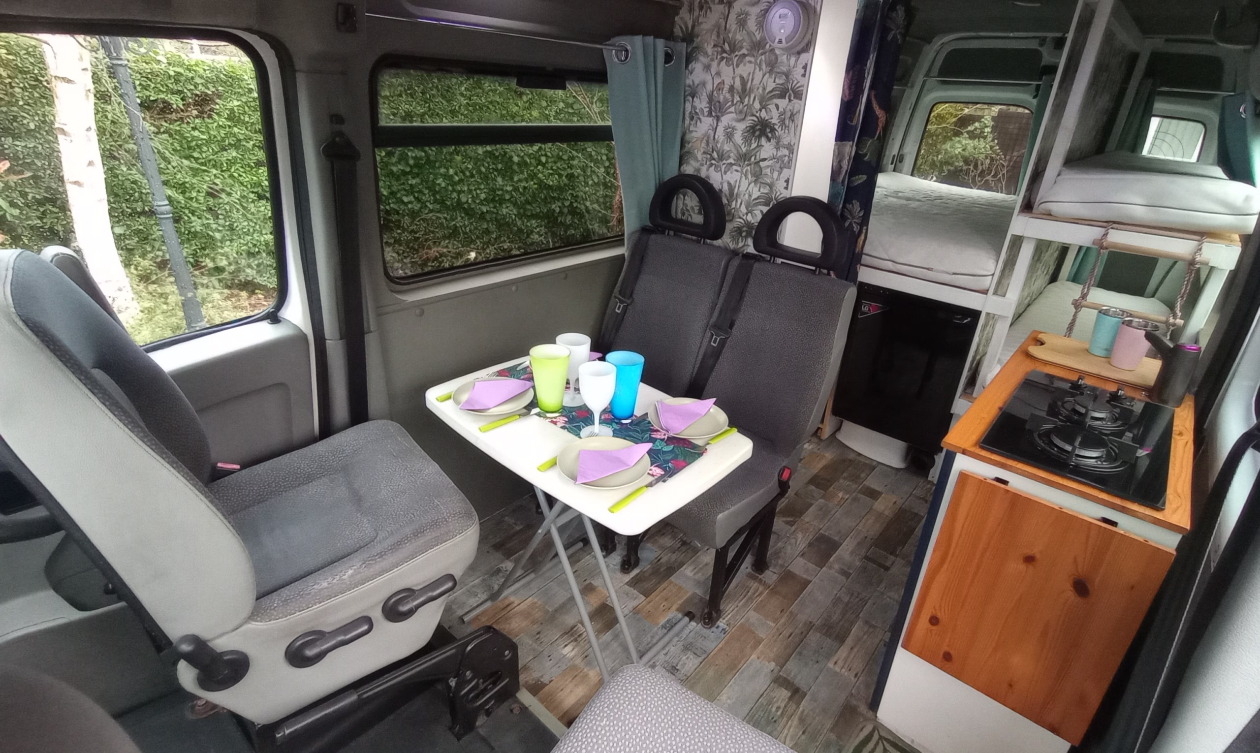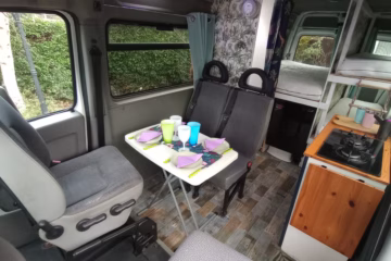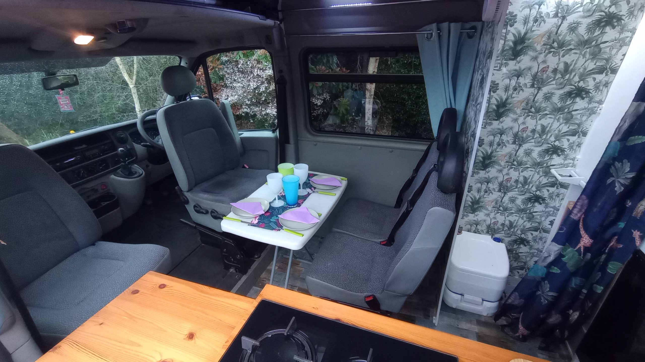 The dining area is created by swivelling both front seats around to face the matching belted rear travelling seats, an adjustable folding table gives flexibility.