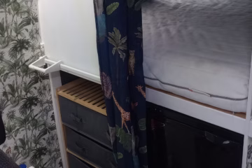 The unique layout allows space for a separate toilet cubicle, which contains a portable chemical toilet and drawers for storage, which we used for clothes.