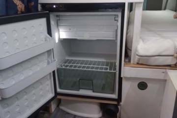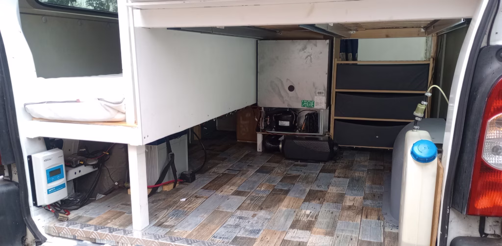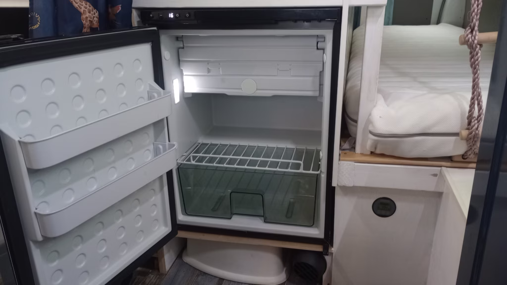 We fitted a large Alpicool 65l fridge freezer which provides space for a week of adventures. The fridge can be controlled by bluetooth and has ample freezer space in the top.