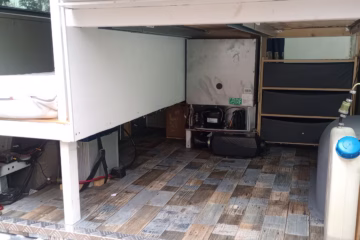 The camper is powered by a 150ah AGM leisure battery, charged by a split charger and 250w of solar on the roof. On a sunny day the MPPT charger replenishes the battery completely during the day. A battery monitor is fitted under the bunk beds for real time updates.