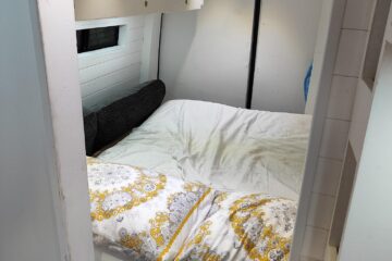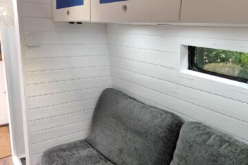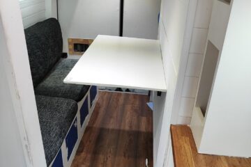 The living area has a Sofa for day time use, and a foldable Murphy fold down bed allows for the living area to be used during the day, the bed will accommodate anyone up to 6ft tall, the underside of the bed houses a large foldable table to be used while on the sofa.