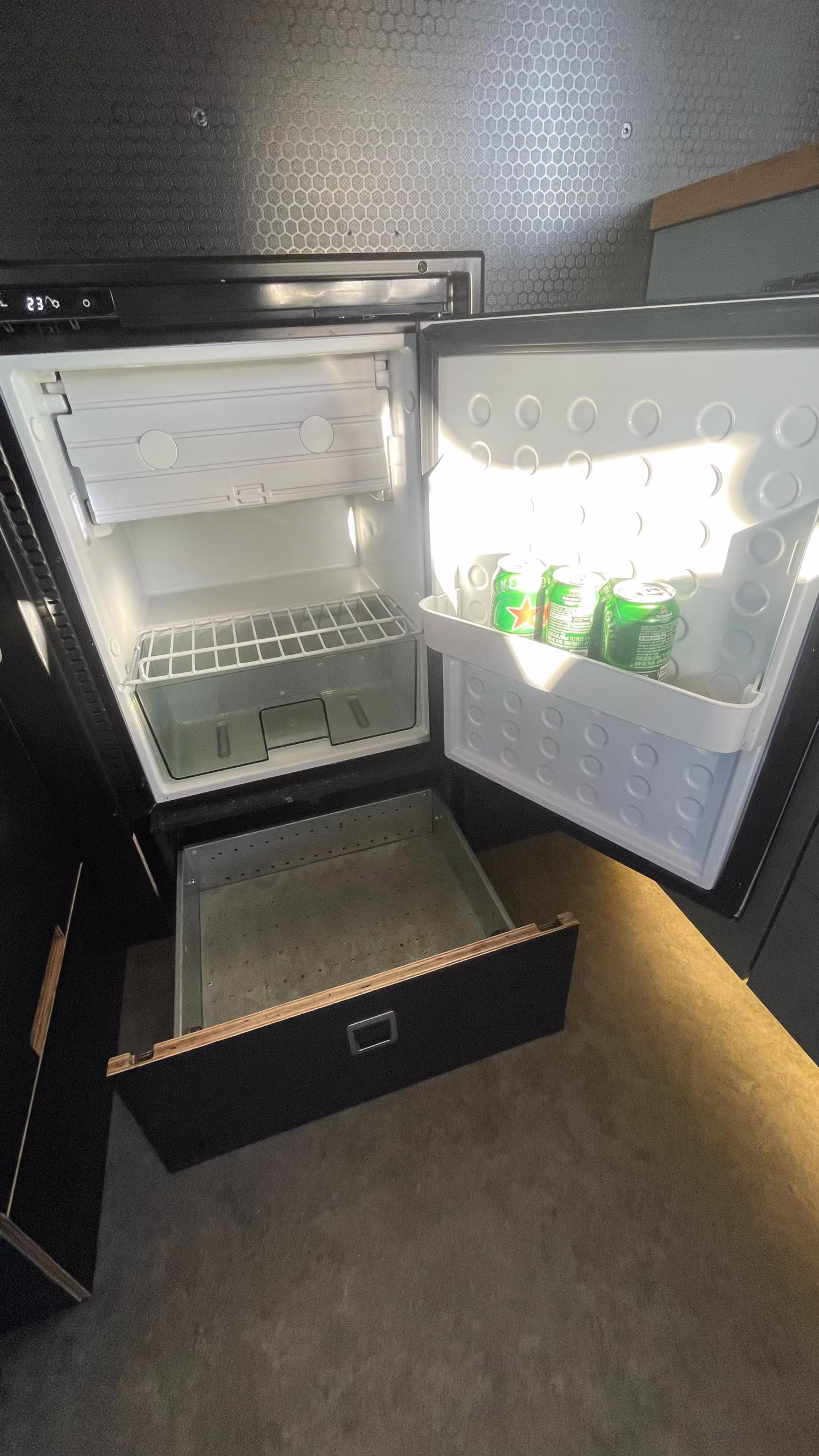 65L 12v alpicool compressor fridge flush mounted into the garage bulkhead.