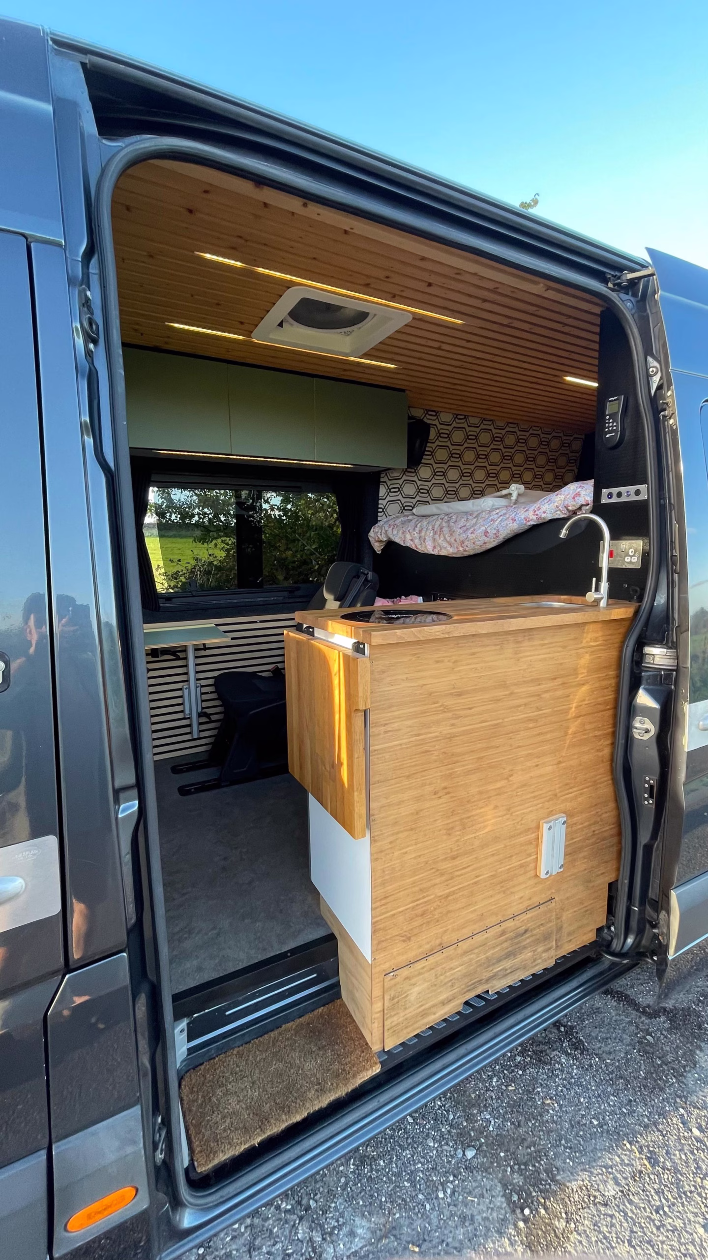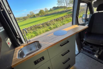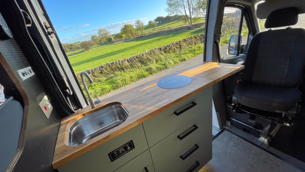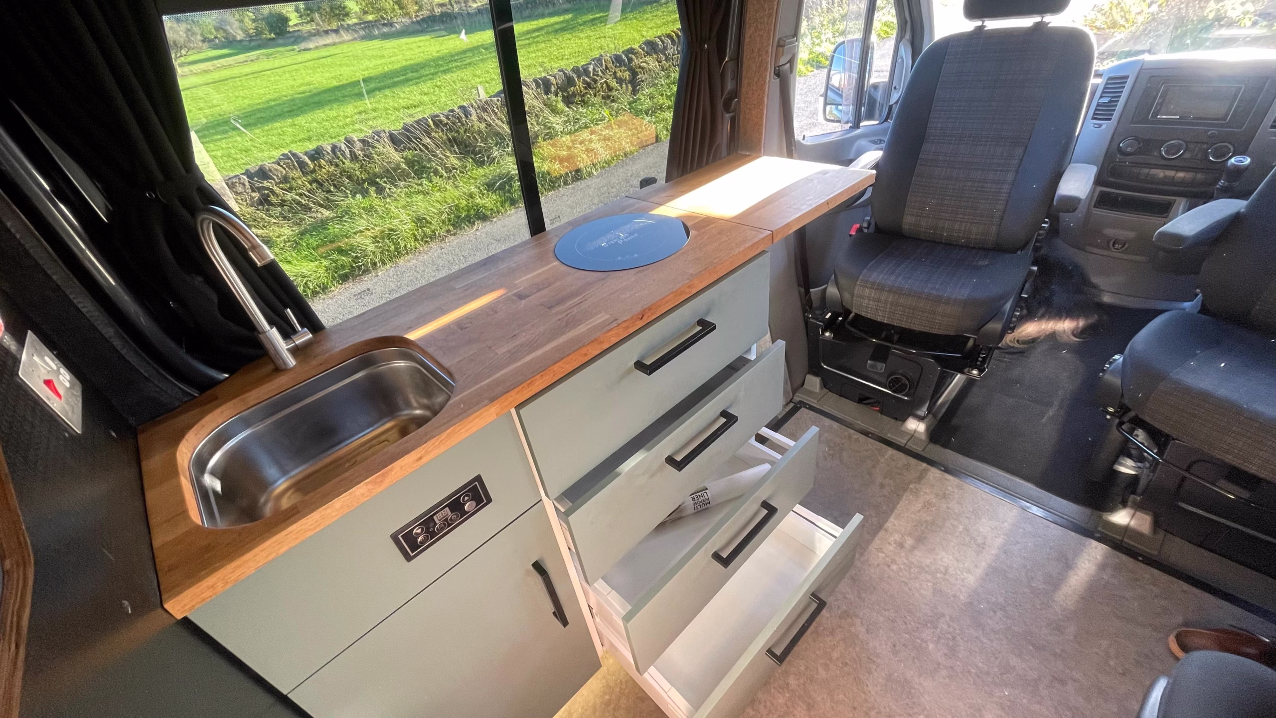 140cm worktop in total including flip up end. 27mm Oak worktop with under mount sink, flush mounted induction hob, plenty of drawers/storage and 25L of onboard drinking water.