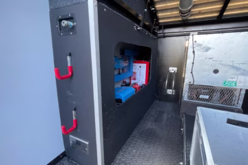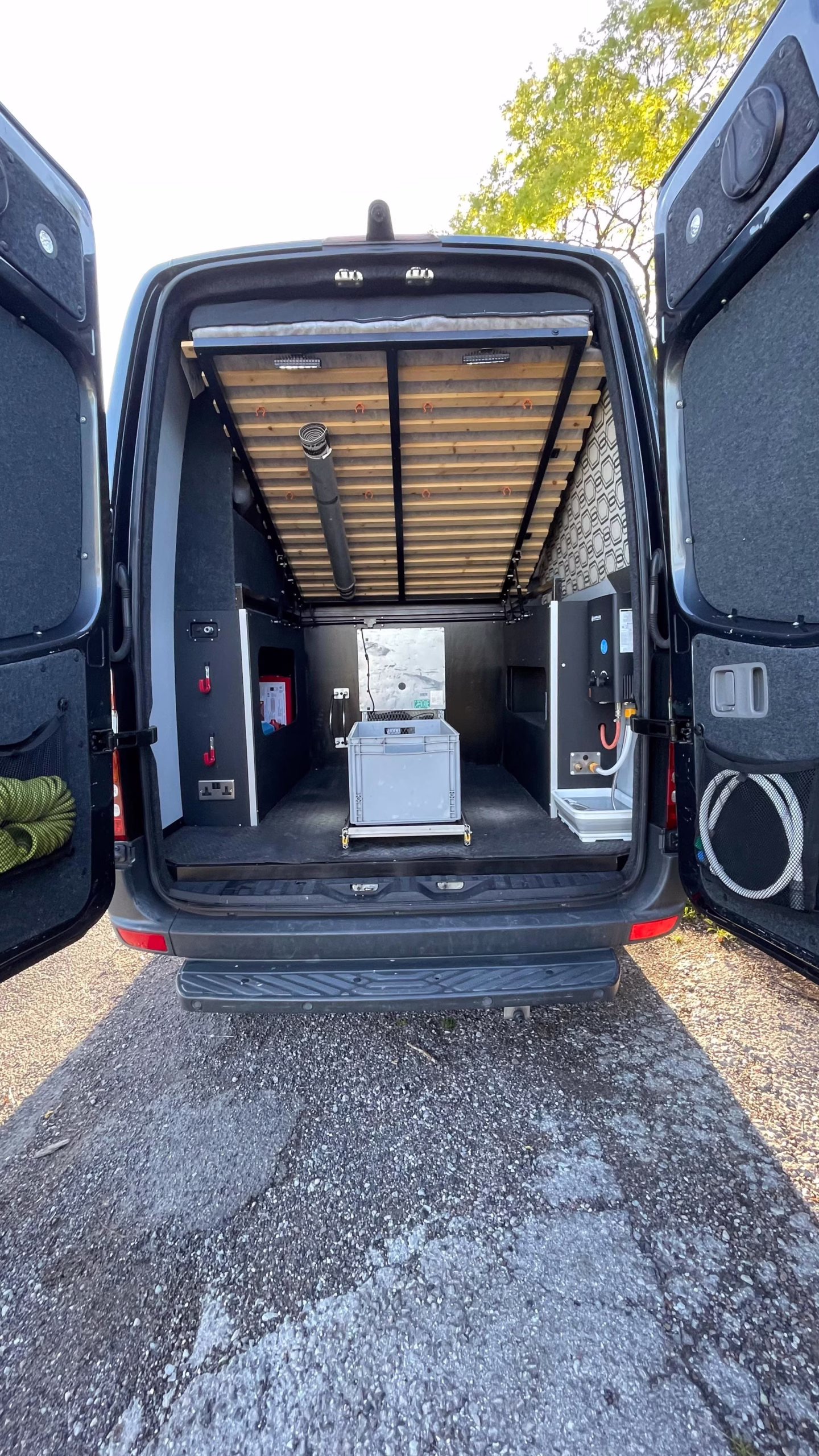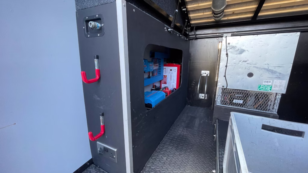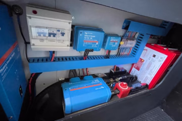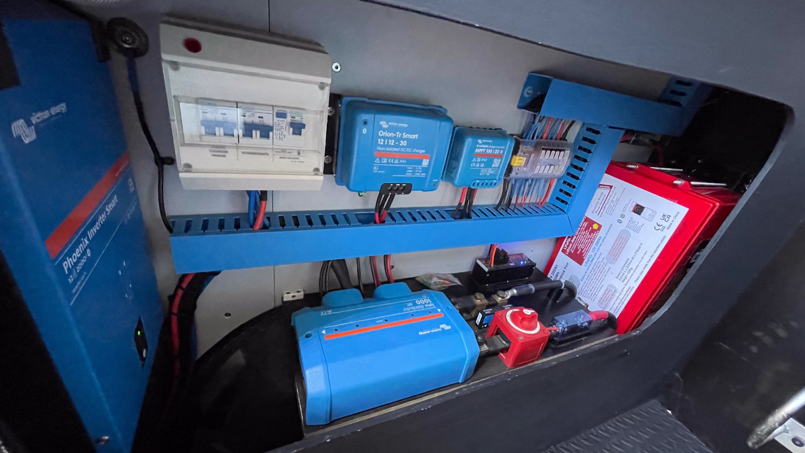 Victron electrical cabinet with a 200ah lithium battery (Sterling) and a 1600w Victron inverter, Victron Orion dc charger and a Victron mppt charge controller for the 280w Victron panels on the roof. Victron smart shunt for monitoring the system.
