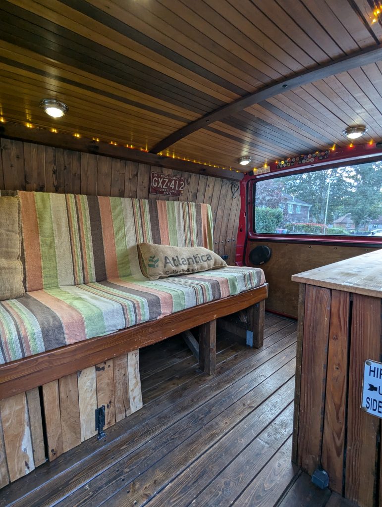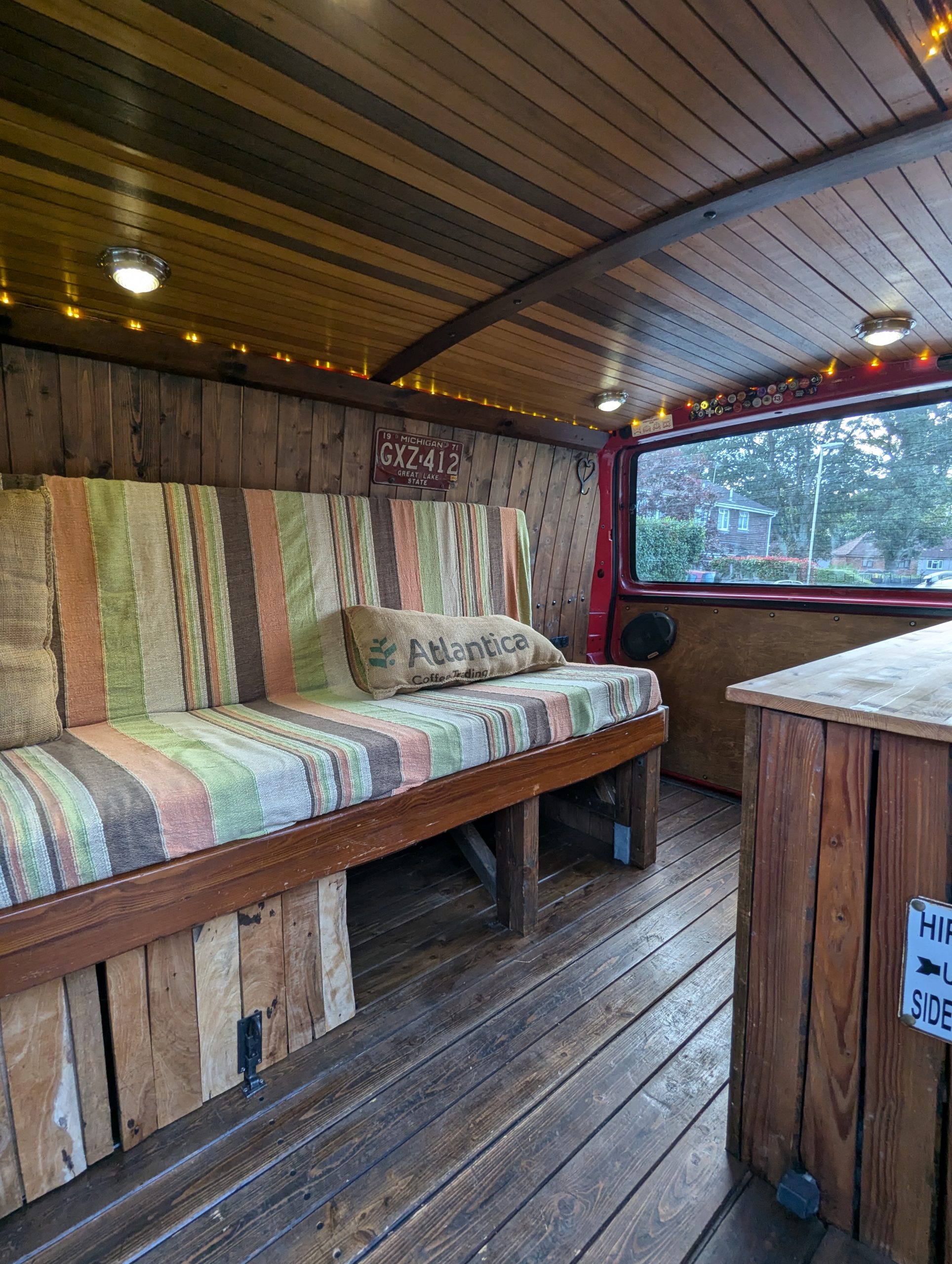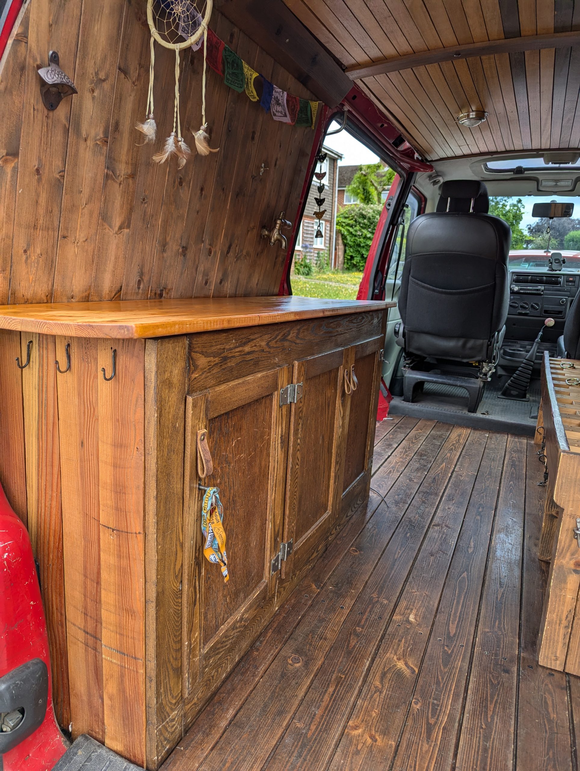 Nelly has been lovingly converted over the last 10 years with lots of unique quirky features such as the hardwood ceiling and upcycled 1950s solid wood kitchen unit with ample storage. she is fully insulated and fitted with a split charge leisure battery system and fusebox controlling the lights, fairy lights, USB sockets and power supply for a fridge. There’s a solar charge controller and portable panel for keeping the battery topped up. The water system runs from a whale foot pump to a vintage restored tap. the bed pulls out from the driver’s side to sleep two it has two handmade wheeled storage boxes underneath, a box for a cooker with a cutlery drawer (cooker not included) and on the end a space for a portable toilet with room behind for camping chairs etc