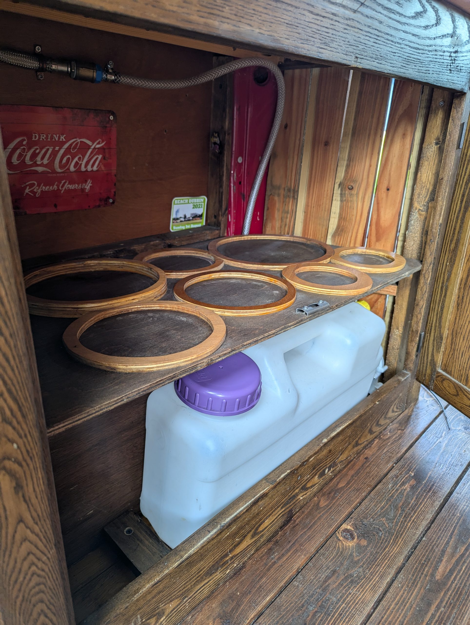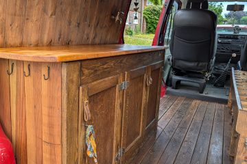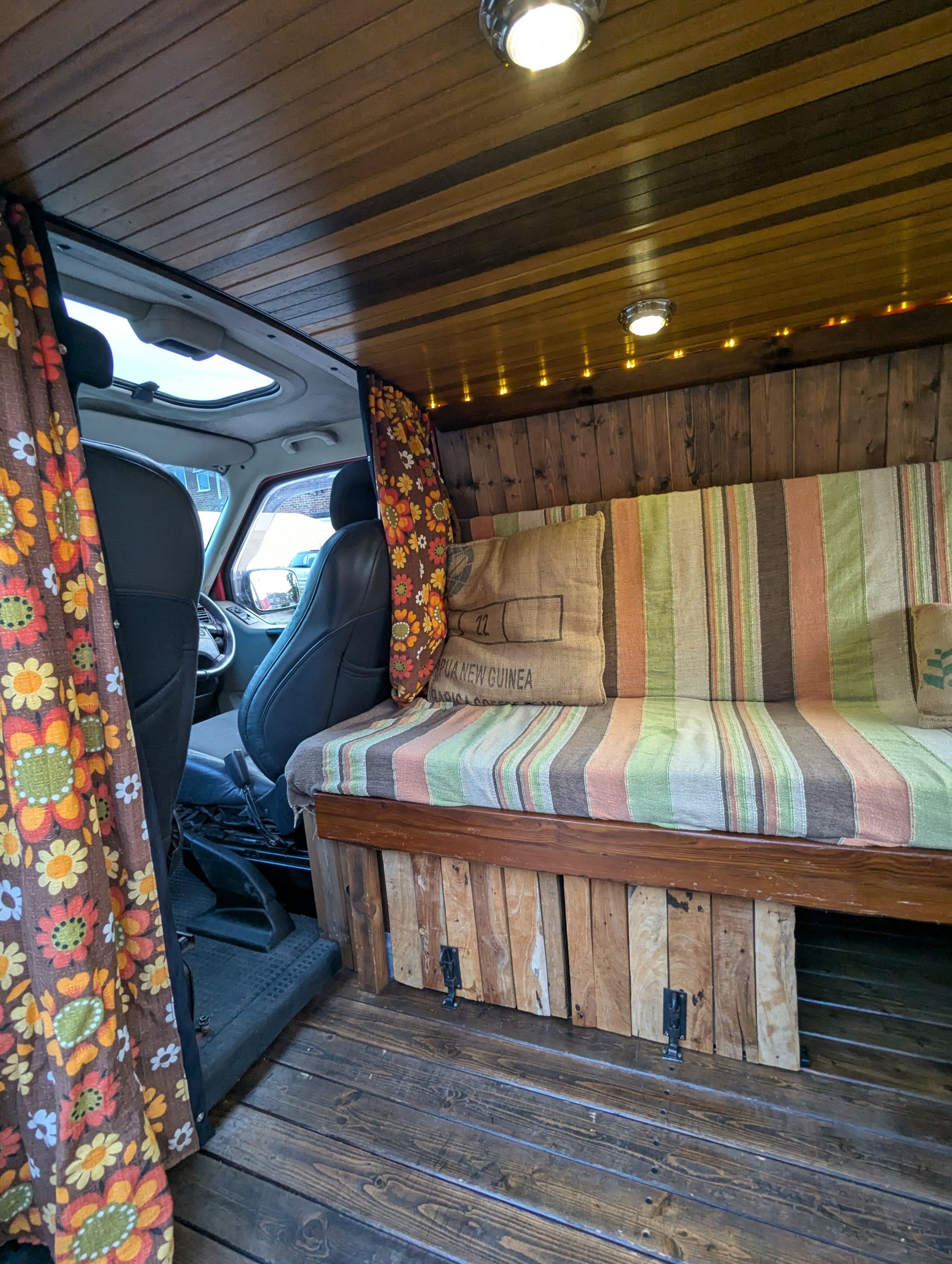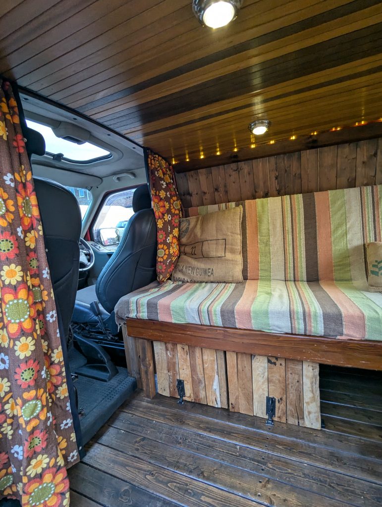 Nelly has been lovingly converted over the last 10 years with lots of unique quirky features such as the hardwood ceiling and upcycled 1950s solid wood kitchen unit with ample storage. she is fully insulated and fitted with a split charge leisure battery system and fusebox controlling the lights, fairy lights, USB sockets and power supply for a fridge. There’s a solar charge controller and portable panel for keeping the battery topped up. The water system runs from a whale foot pump to a vintage restored tap. the bed pulls out from the driver’s side to sleep two it has two handmade wheeled storage boxes underneath, a box for a cooker with a cutlery drawer (cooker not included) and on the end a space for a portable toilet with room behind for camping chairs etc