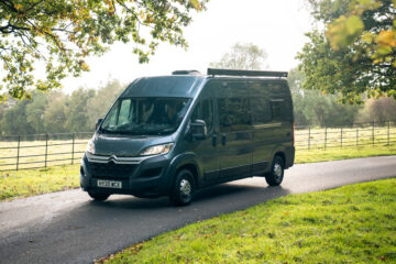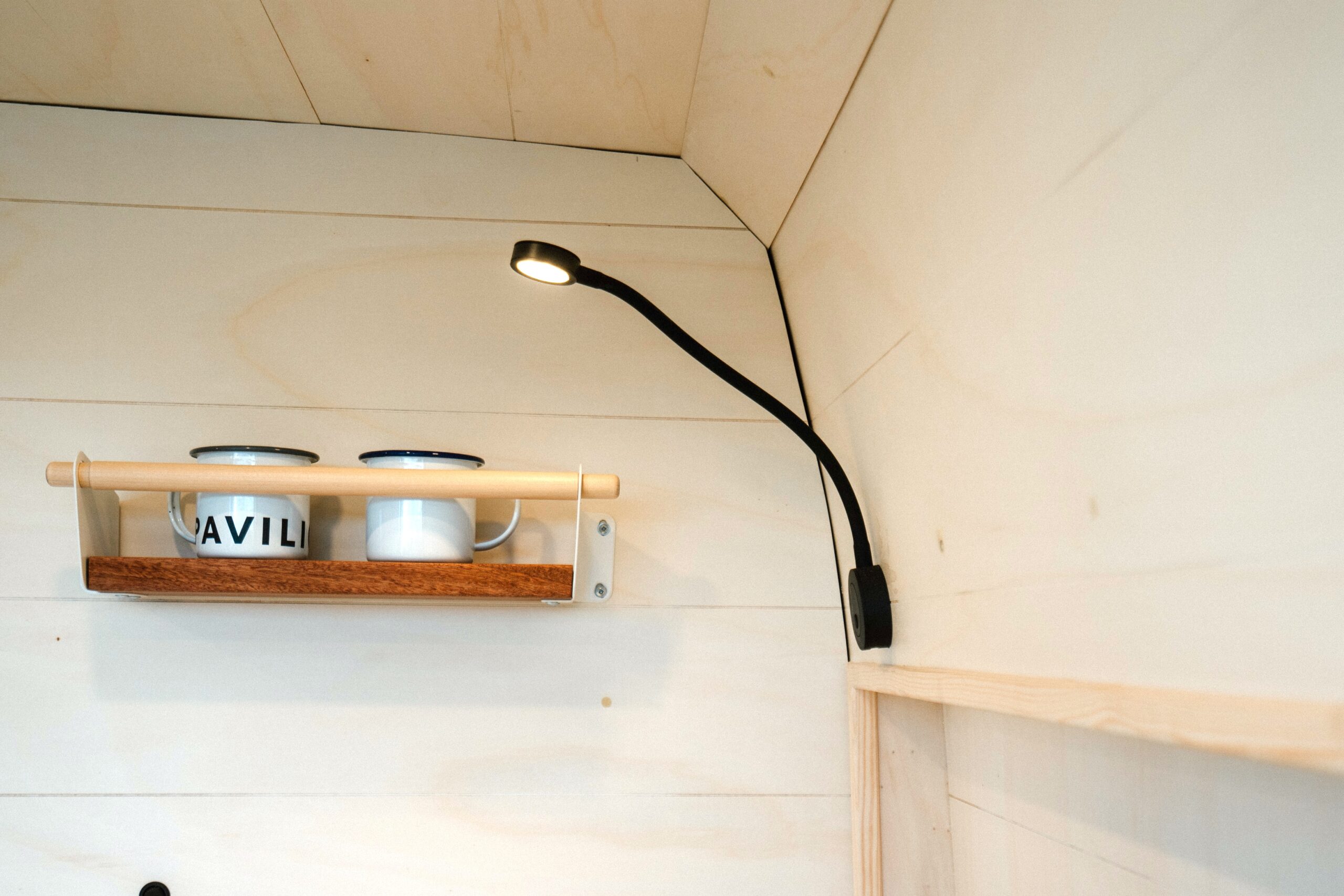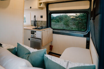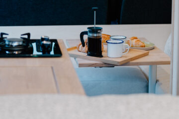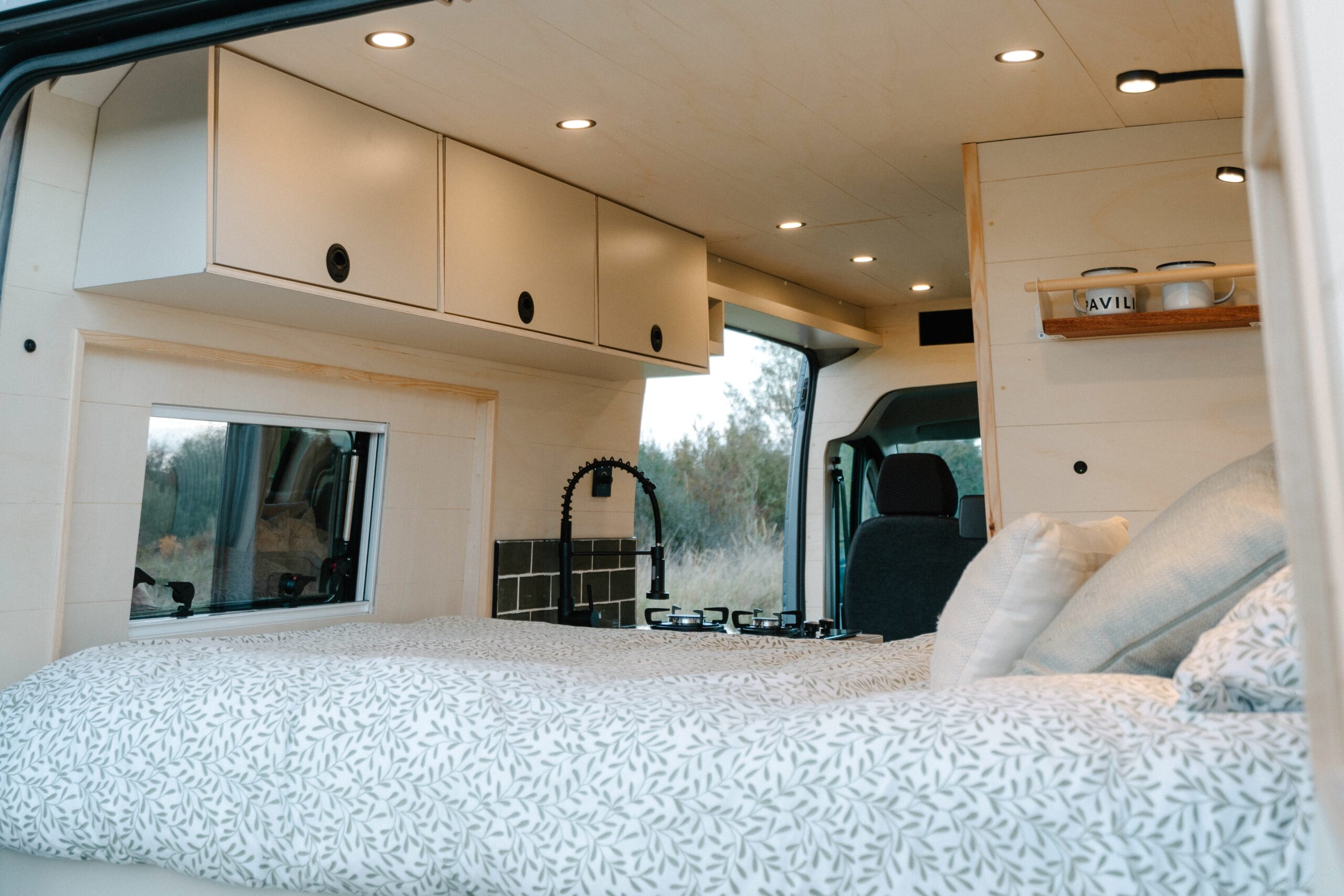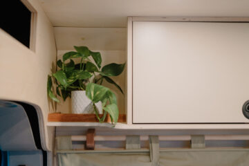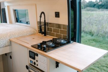 The van feels light and airy when you’re in it, with lots of natural light flowing through the windows and Maxxair fan, while the 10 spotlights will brighten up the van even when it’s gloomy outside. Natural wood clad walls and raw ply edges on the furniture give the van a soft and inviting finish, while the HPL laminated surfaces of the furniture and the LVT wood-effect flooring mean it is hard wearing and easily wiped clean after any adventures or spills.
