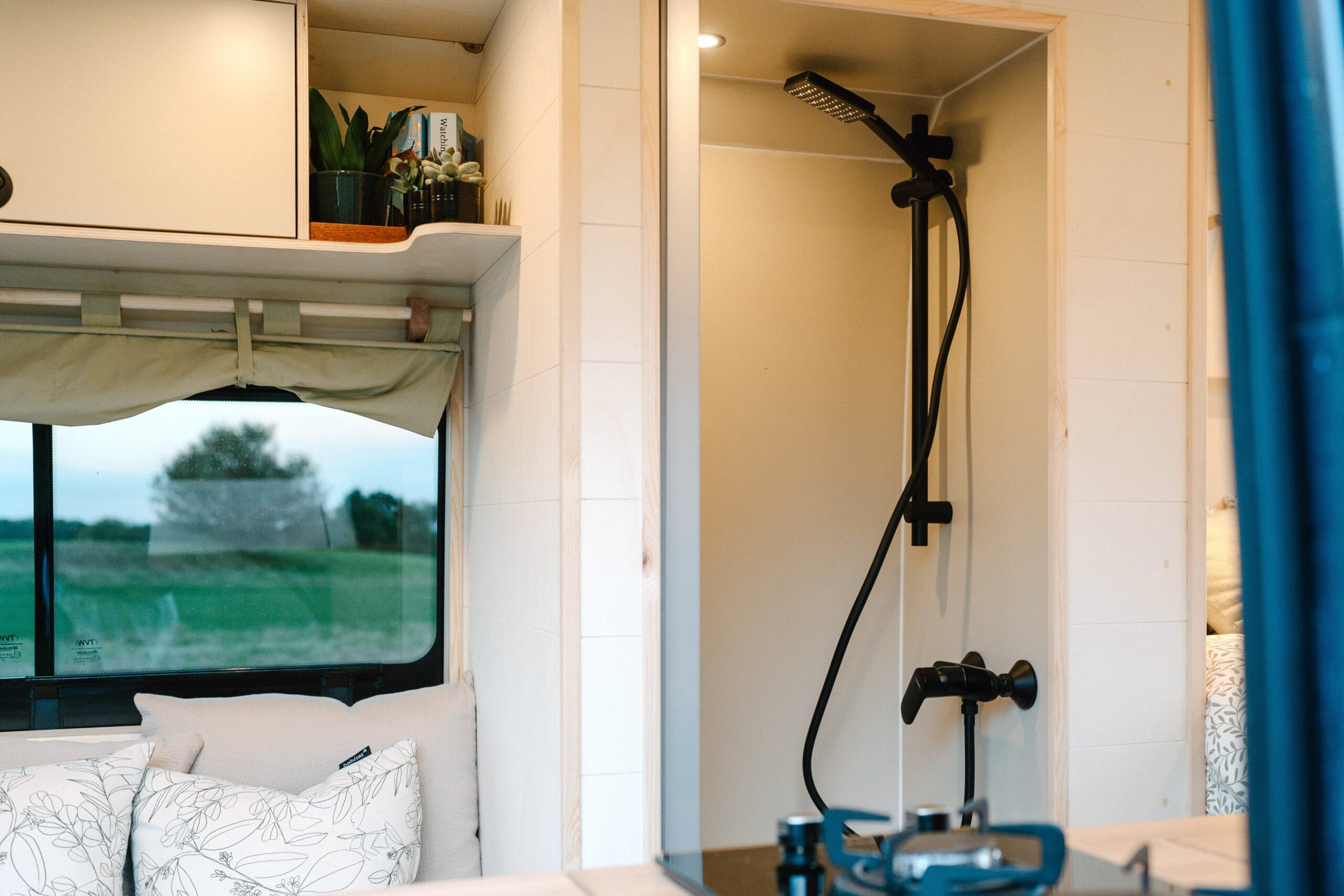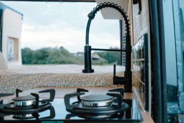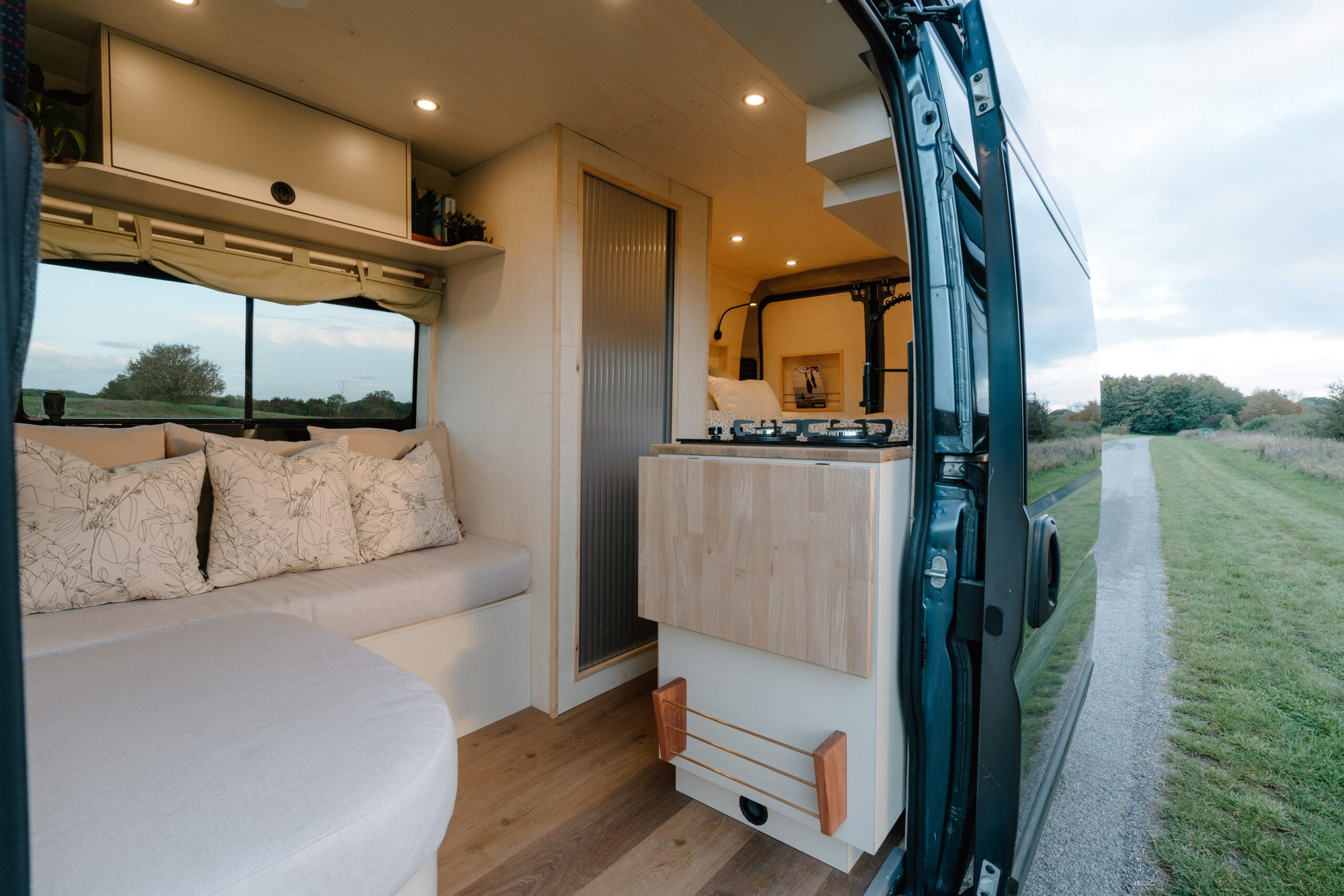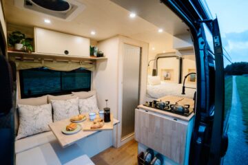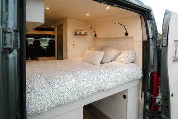Perry is a fully off-grid cosy campervan designed to take you on any adventure in style. On entering the van, you’ll see the comfy lounge area designed to put your feet up while taking in the view. The kitchen area provides plenty of home comforts for cooking up a feast while on the move. We’ve provided a full-sized inset sink and dual burner LPG hob. The worktop is extendable with the side flap in order to provide ample prep space for your meals. There’s also a 50L 12v Dometic compressor fridge. For storage, there’s ample room under the sink, a pull-out pantry, and overhead cupboards. Perry also comes equipped with an internal shower and a removable Porta Potti that can either be stored in the shower or under the seating.