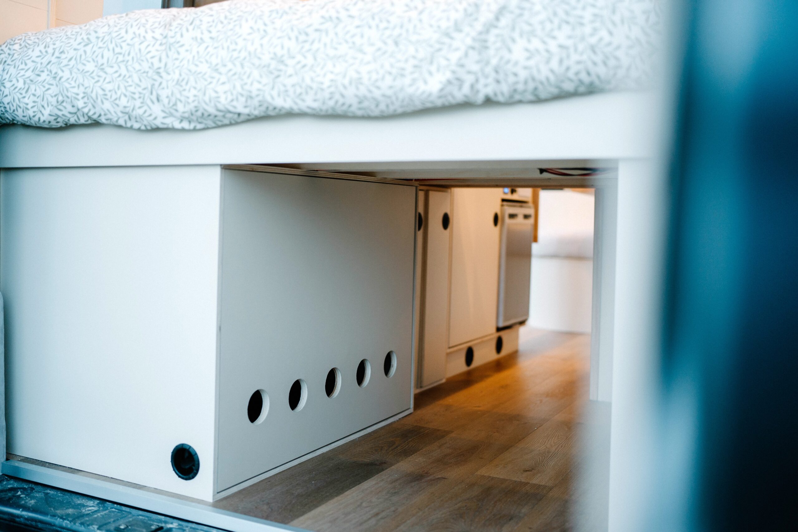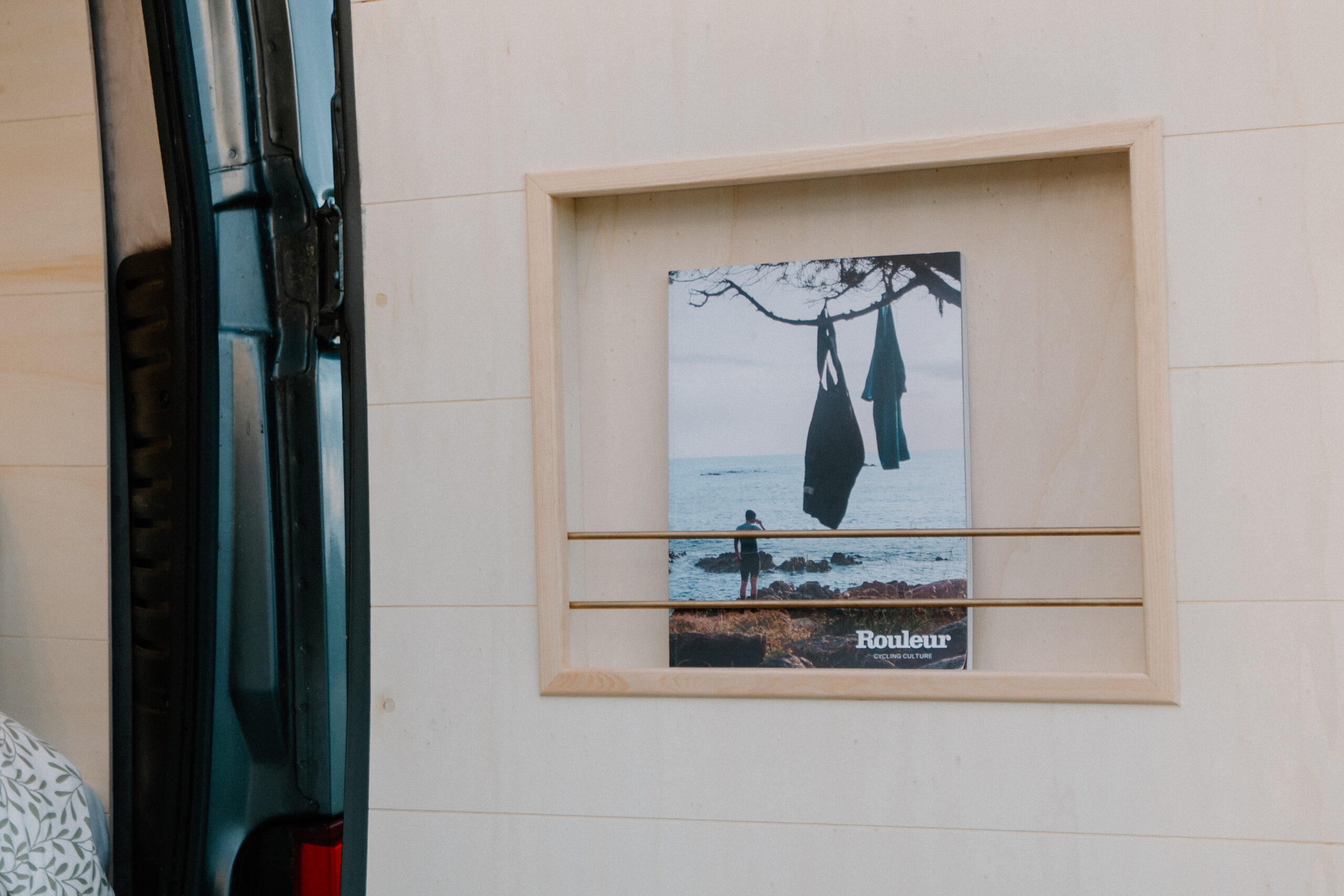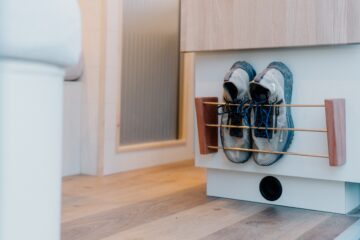 Shoe rack by entrance to the van