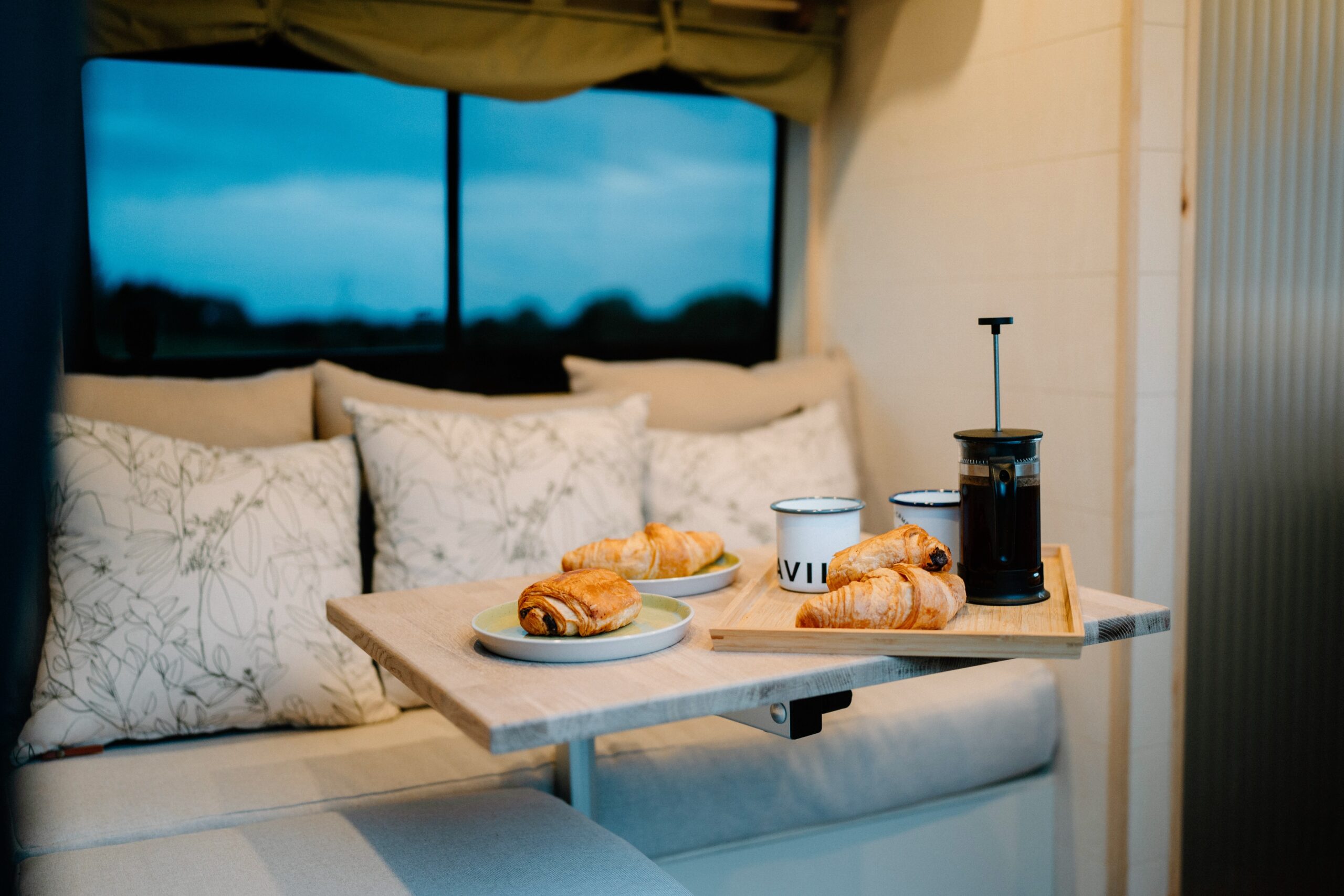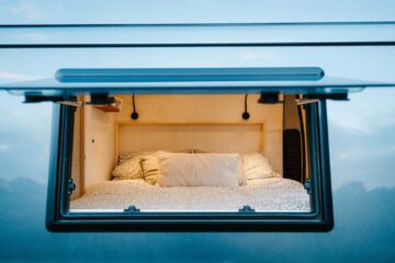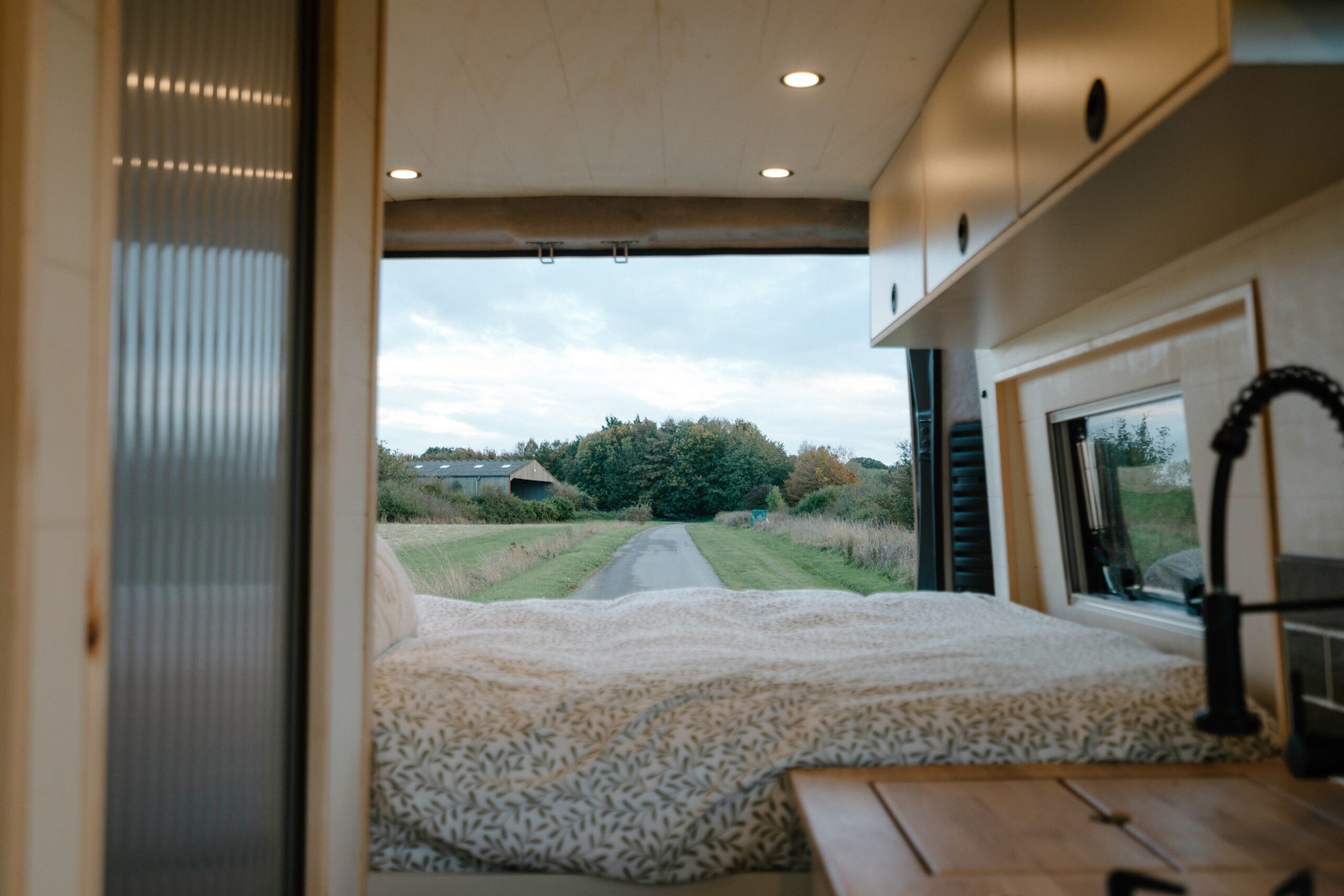 The full-sized fixed double bed at the rear of the van provides an excellent night sleep with its super comfy 6″ memory foam mattress, and at 6’4″ in length it’s longer than your standard double mattress and suitable for taller travelers. Enjoy amazing views from the van while lying in bed with a 500×700 window at the foot of the bed (but rest assured that the built-in blind will black-out the world when you’re trying to get some shut eye!). The bed is also equipped with 2 dimmable reading lights with USB sockets, and a shelf and cubbies for storing your things by your bed. The L shaped sofa at the front can be comfortably used as a child’s bed, though even adults might find themselves drifting off with their feet up as they relax with a cup of tea or glass of wine!