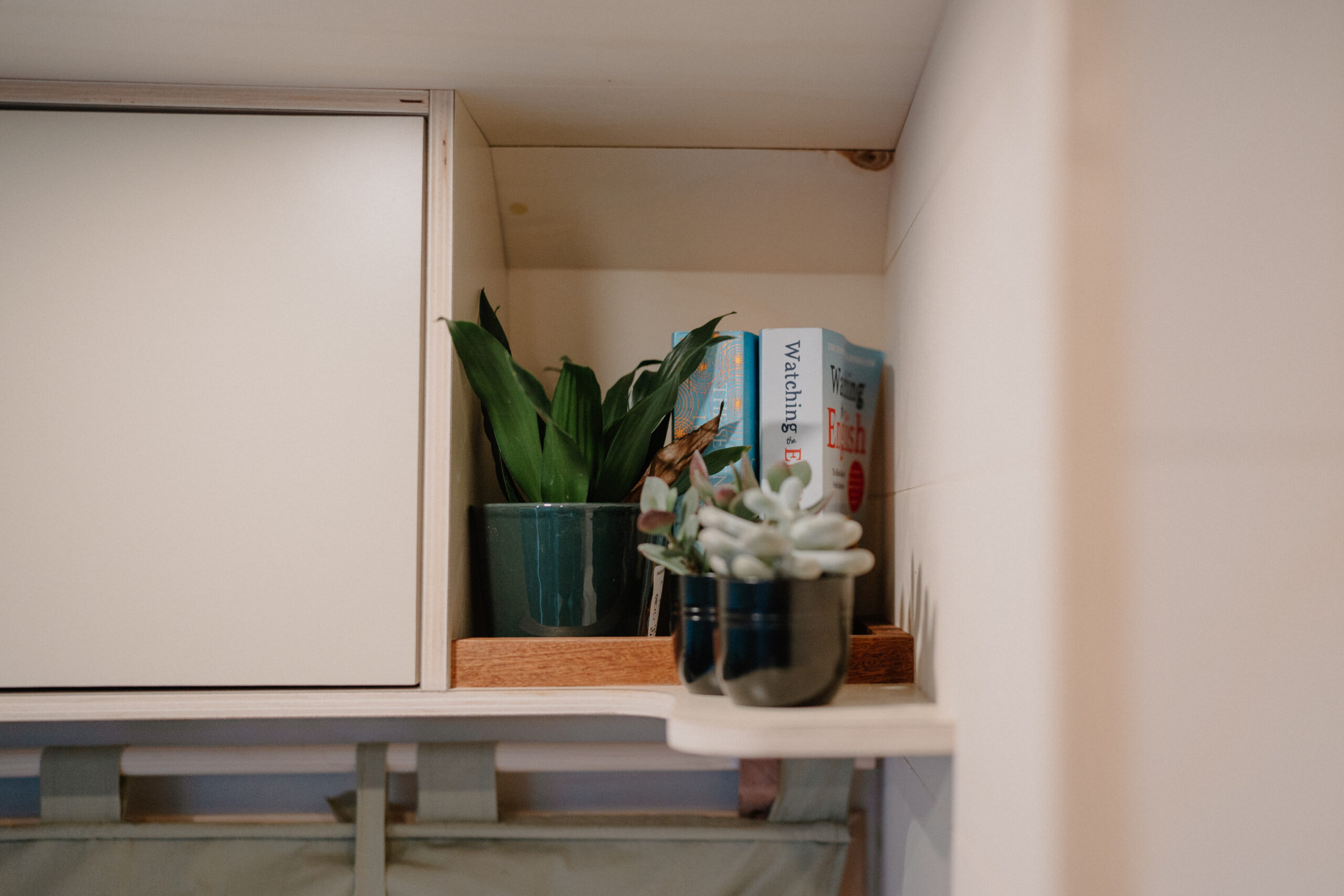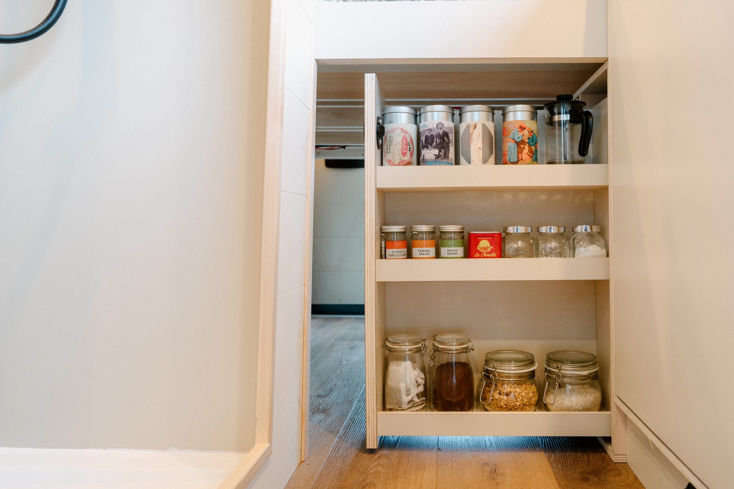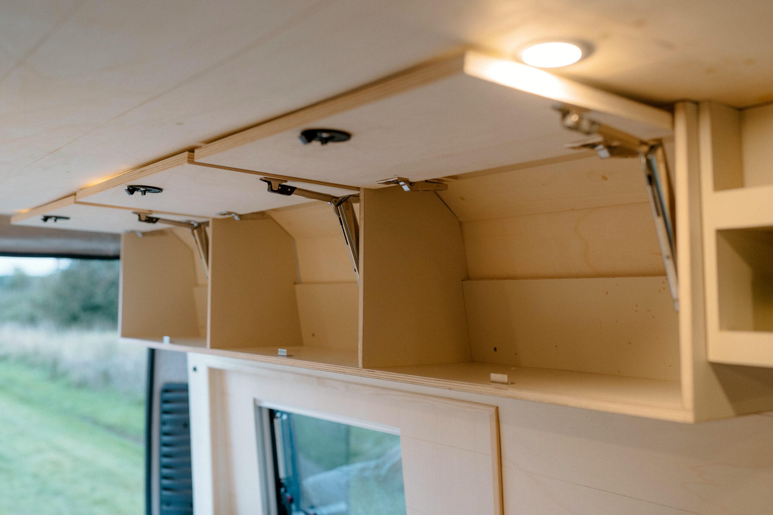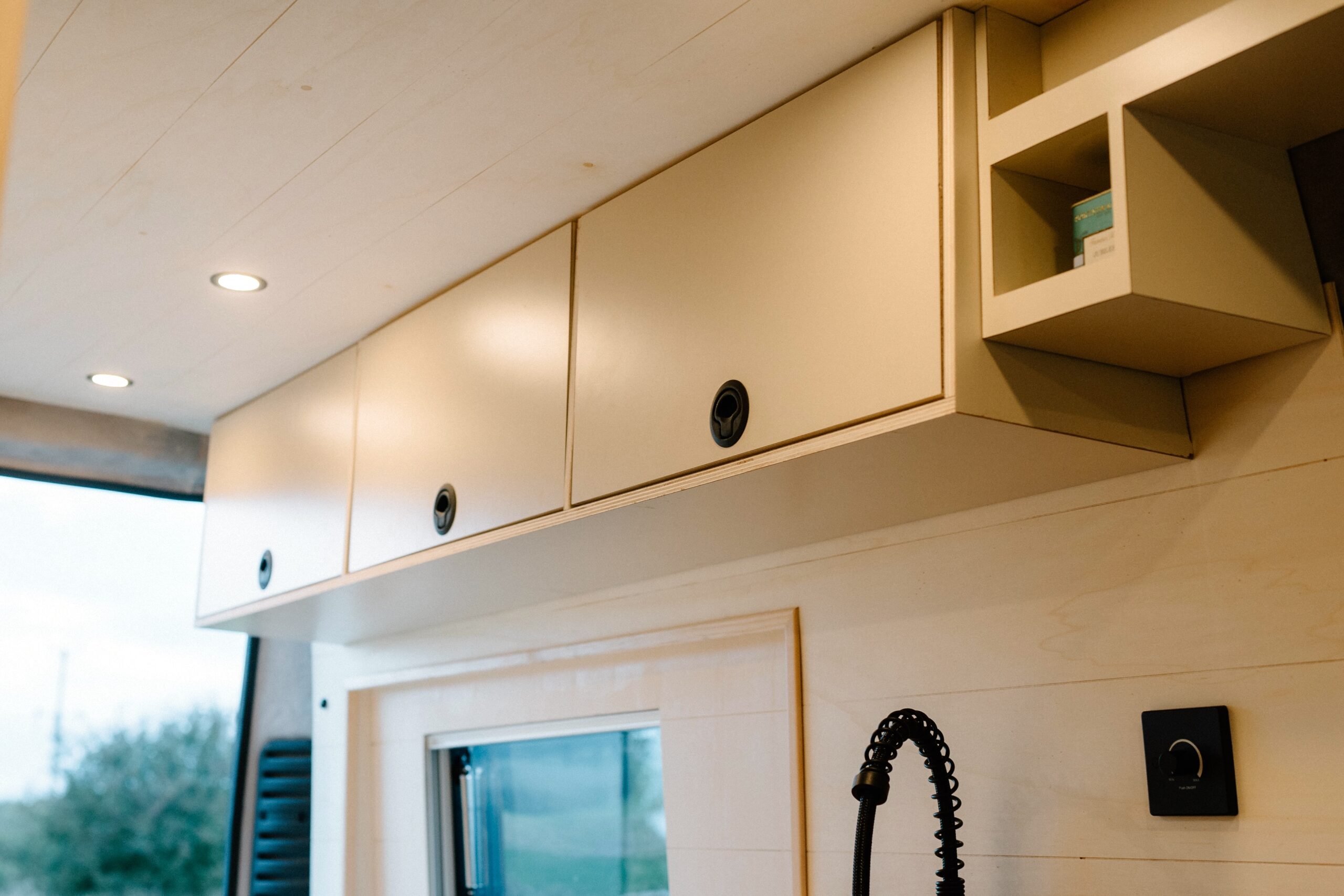 All cabinets are made from 12mm lightweight poplar ply, laminated with Polyrey HP Laminate and raw ply edge. Doors are secured with slam latches, making sure they remain shut even during transport. We have used high quality soft close hinges throughout.