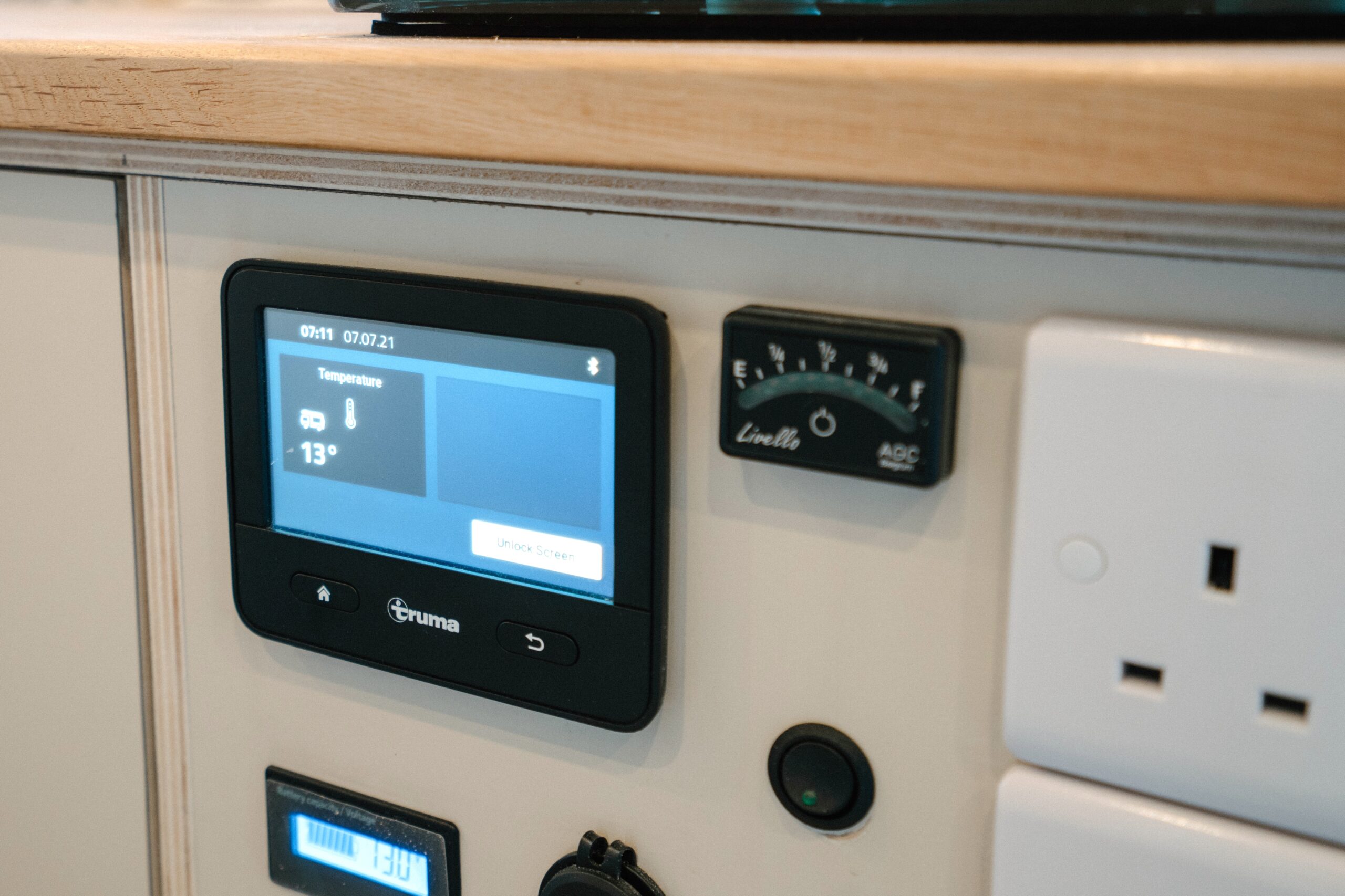 Control panel including battery monitor, LPG tank level, Truma heating control panel (iNET), USB outlet and water pump switch