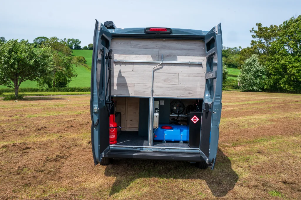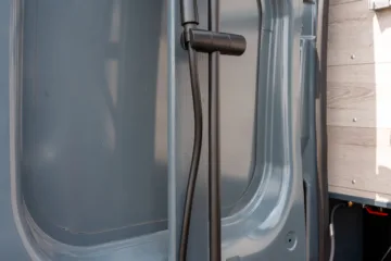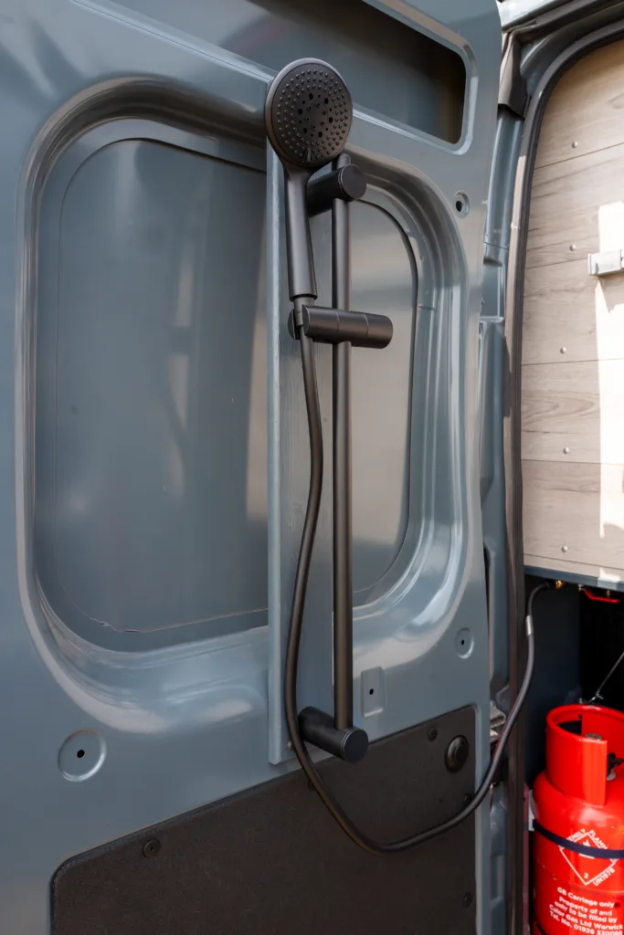 The Bobil Vans water heater can heat from 230v hookup OR from the diesel heater if you are off grid. Meaning that you have constant access to hot water for the sink and rear door shower.