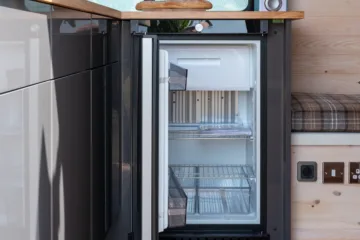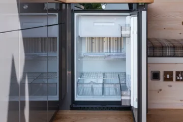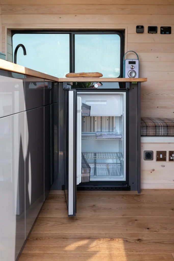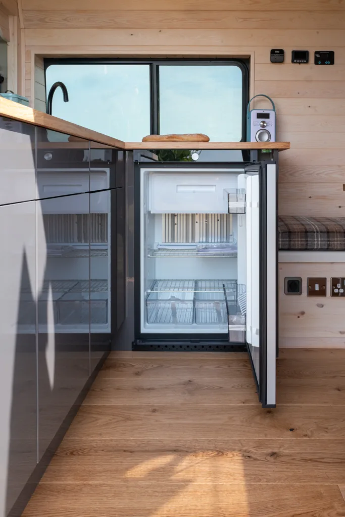 The Dometic 3 way heat exchange double hinged door fridge is the best option for off grid camping. It runs from 2 6kg Calor cylinders, meaning that you do not have to worry about running down your leisure battery or how much sun there is. It is also silent, compressor fridges can be noisy in a camper