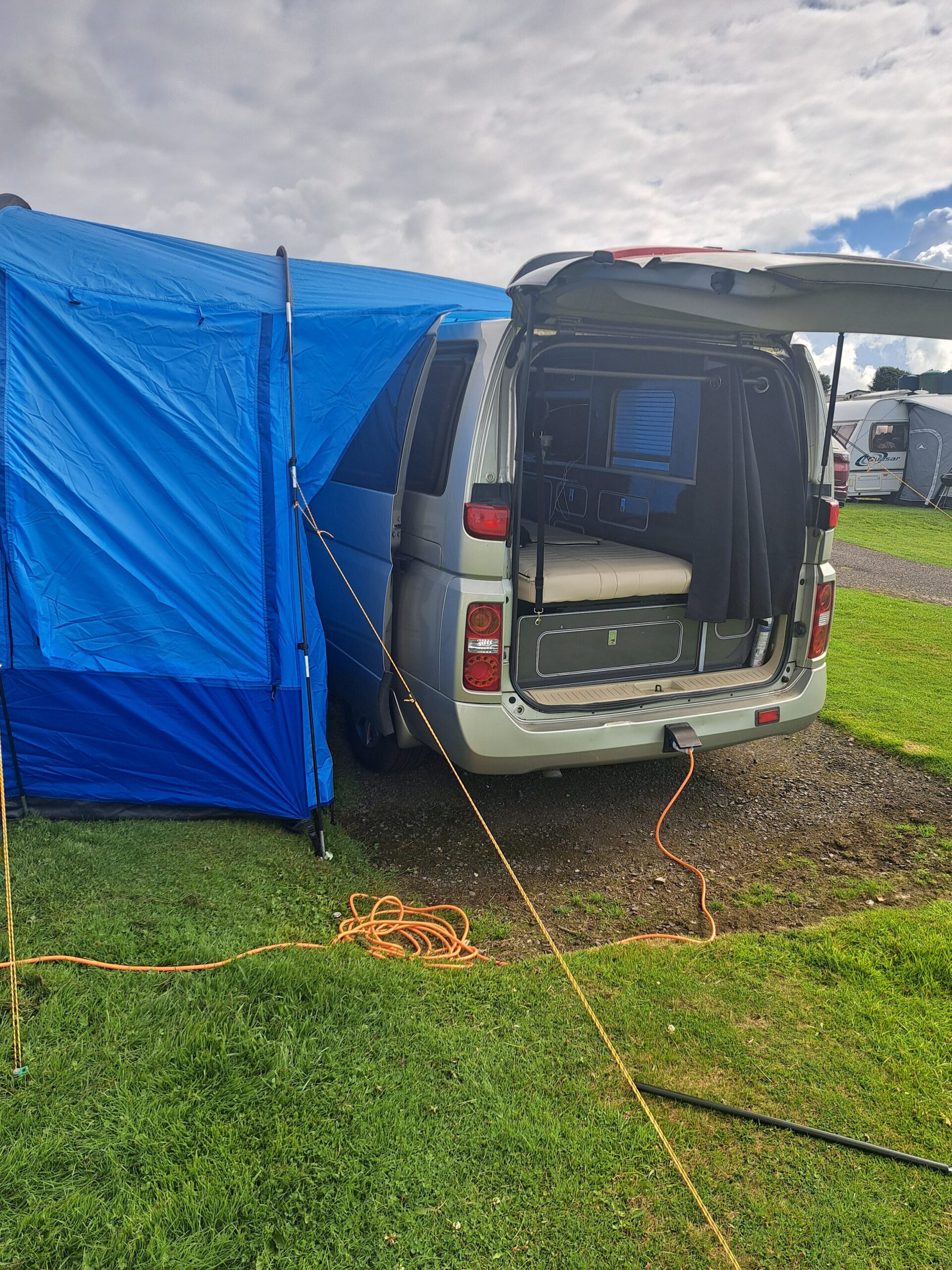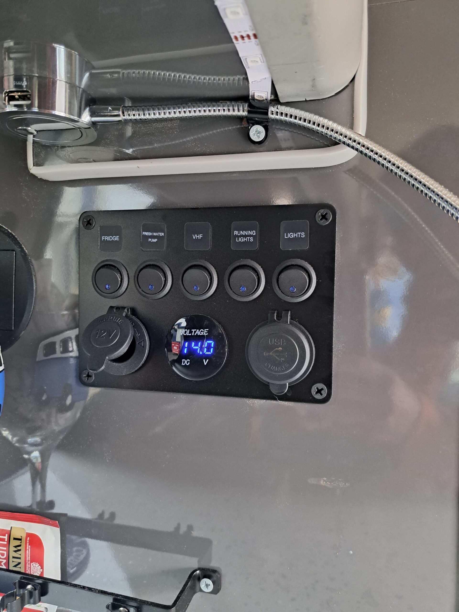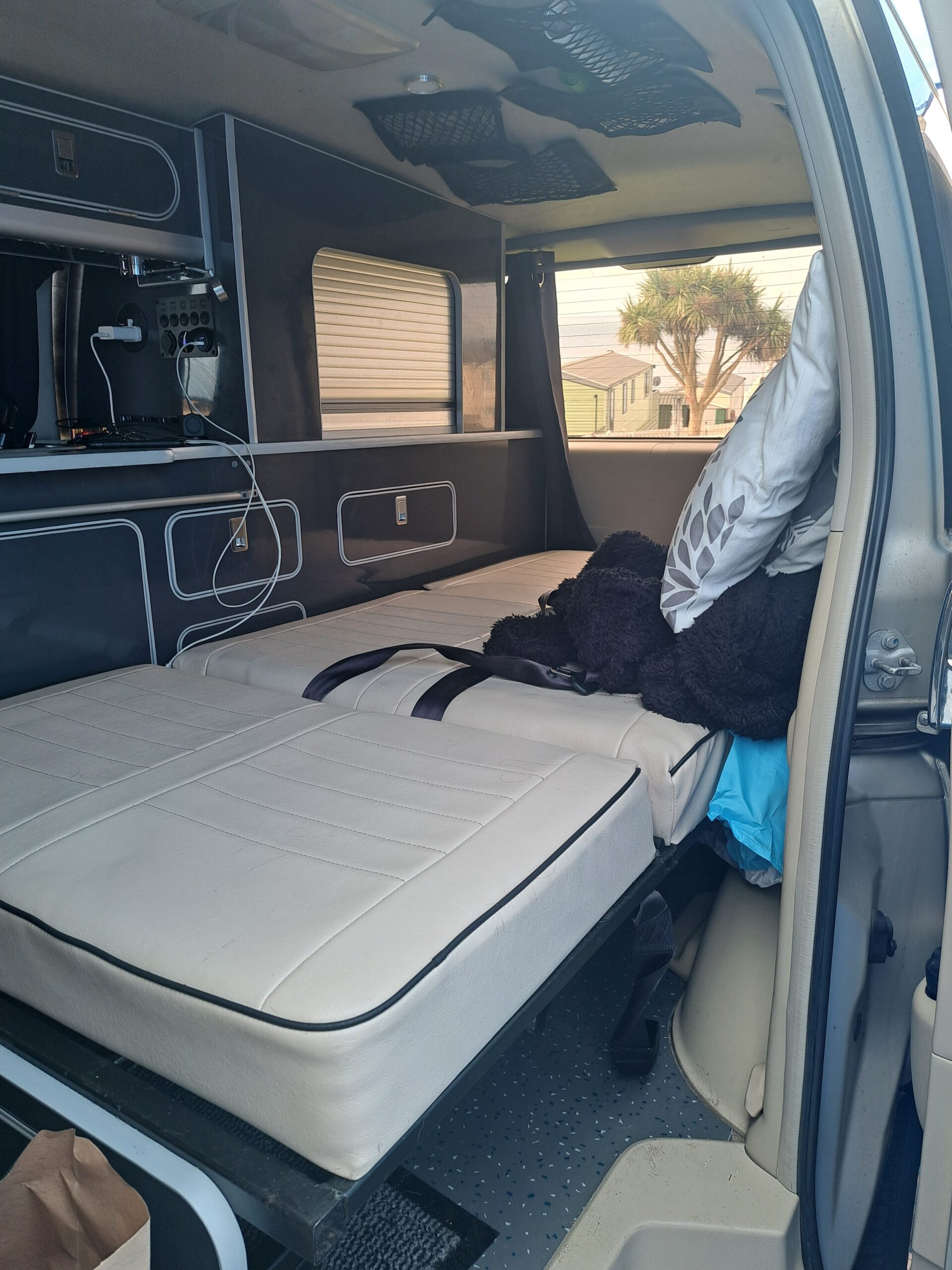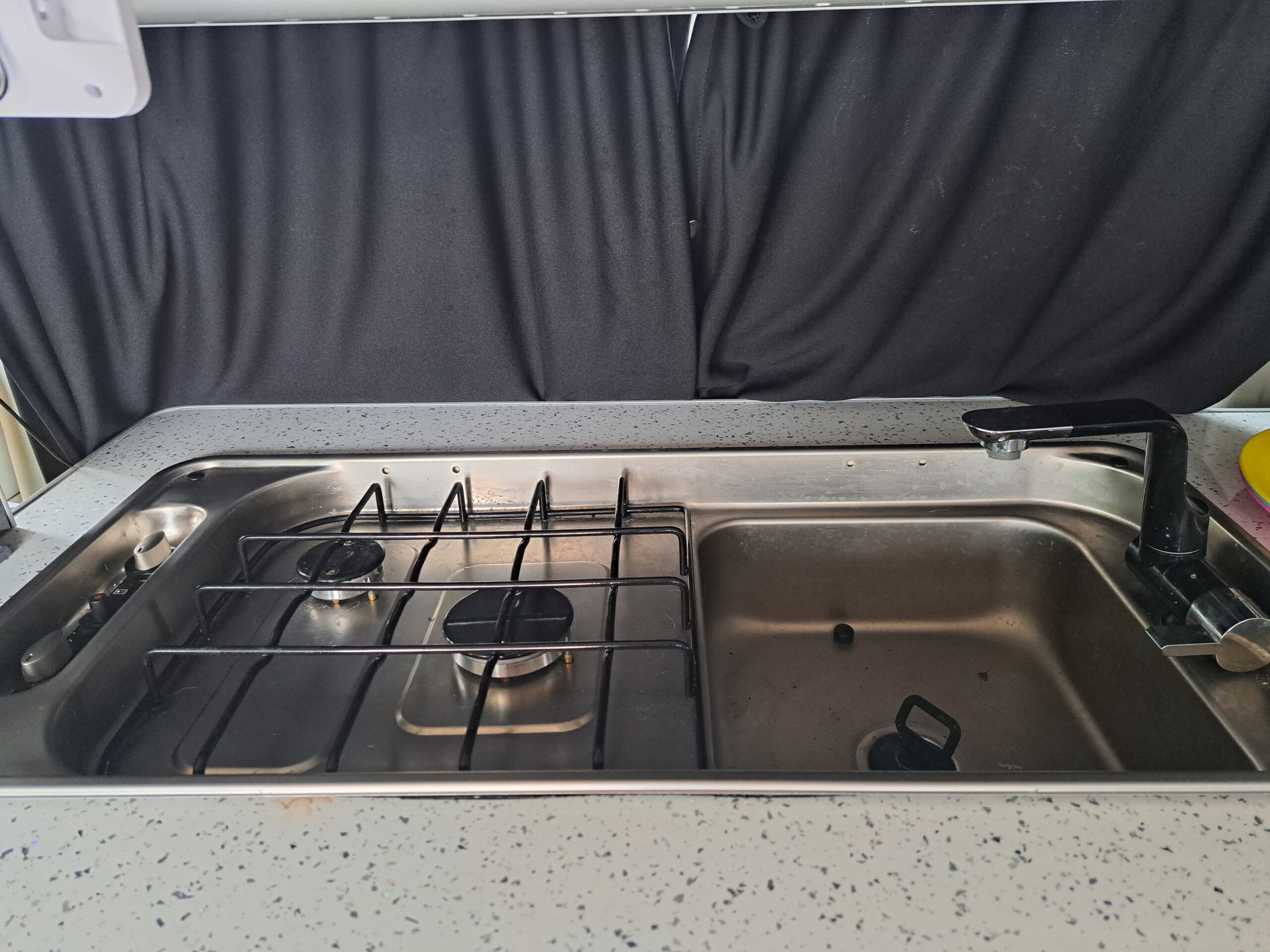 Double hob, fridge, TV, cd, radio, Bluetooth, USB and mains sockets, storage, sink and waste, privacy windows. Led lights.detachable table. Rear view parking camera.