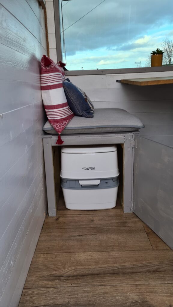 The seat cushions and fabrics are neutral grey, the blinds all custom made to fit the 2 port holes, side windows and hatch between the living area and the cab. There is a removable pine table, lots of wall shelf storage, a fixed wall mirror, carbon monoxide detector and 2 roof vents. The Porta Potti is stored under one of the bench seats, with more storage under the other.