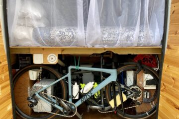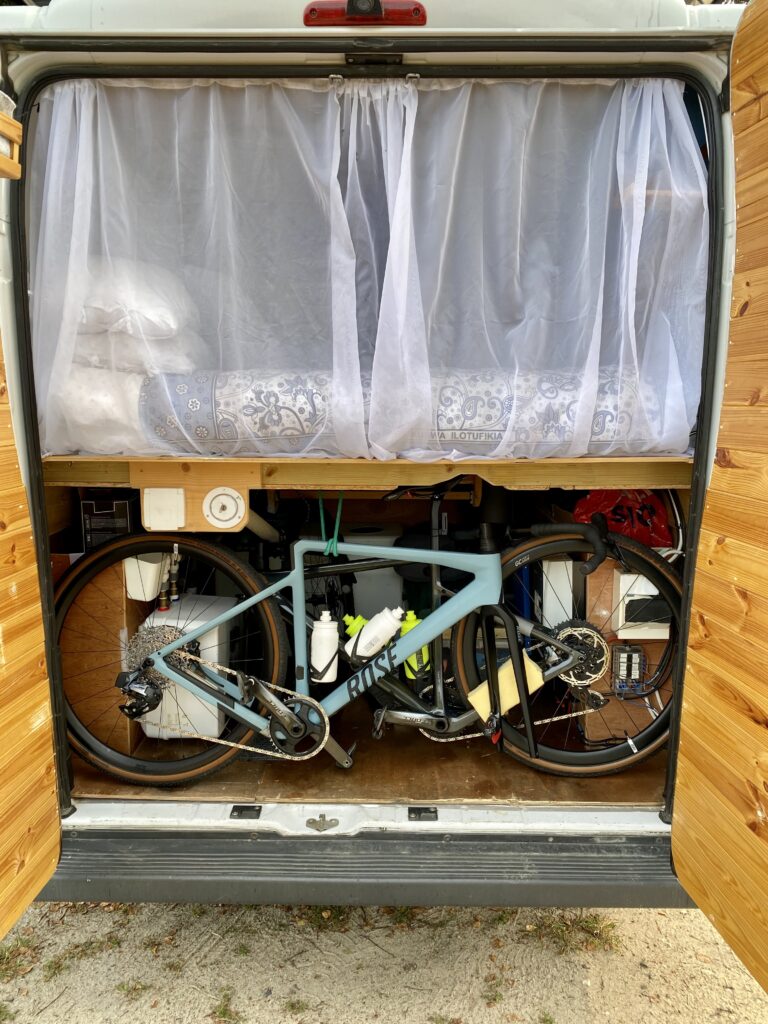 Rear garage storage, we fit two road bikes, two outdoor chairs, levelling blocks, wetsuit box, running shoes, cycle gear, yoga mat… the list goes on. For the compact size of the van, there is a lot of space for your stuff!