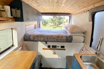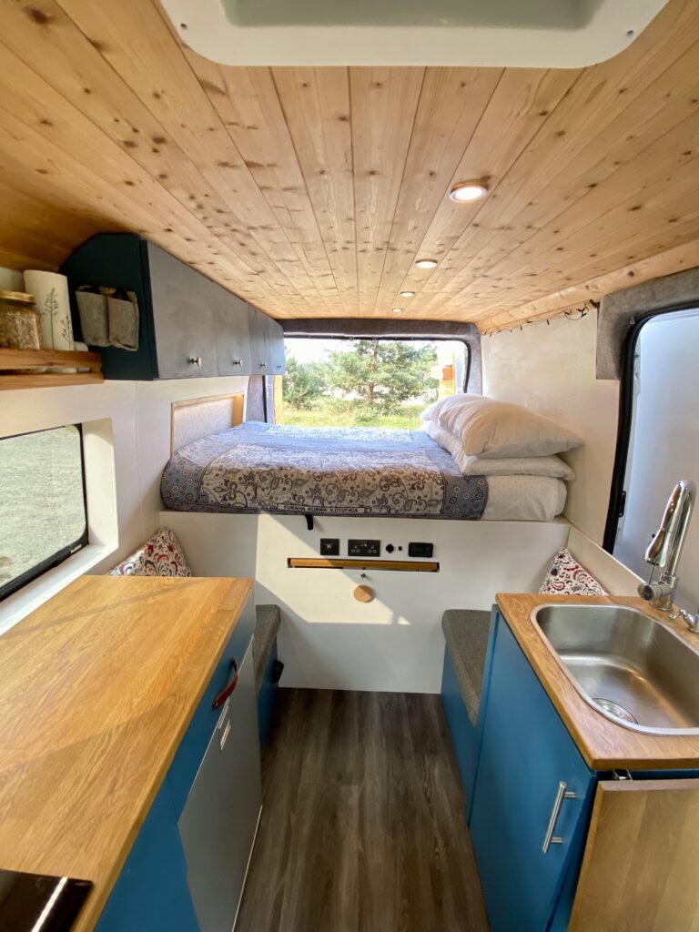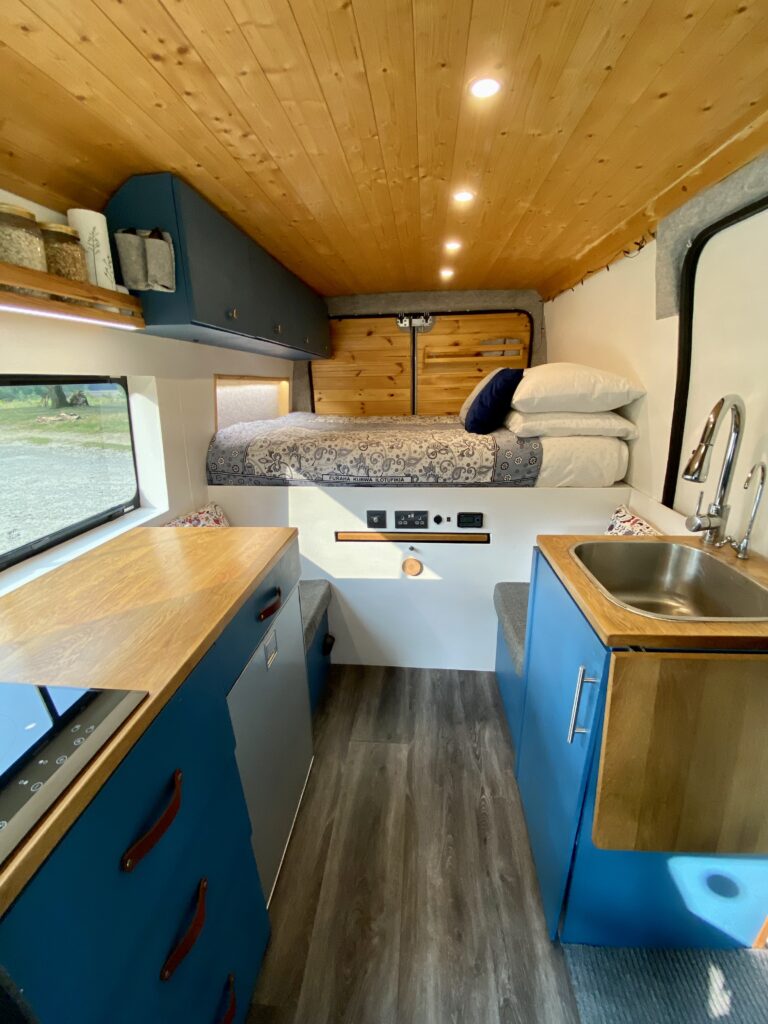 This is a fully off-grid compact campervan that will allow you to park up in the wilderness until you need more water and food! Largely thanks to the high-end solar electrical system and the ample storage space.