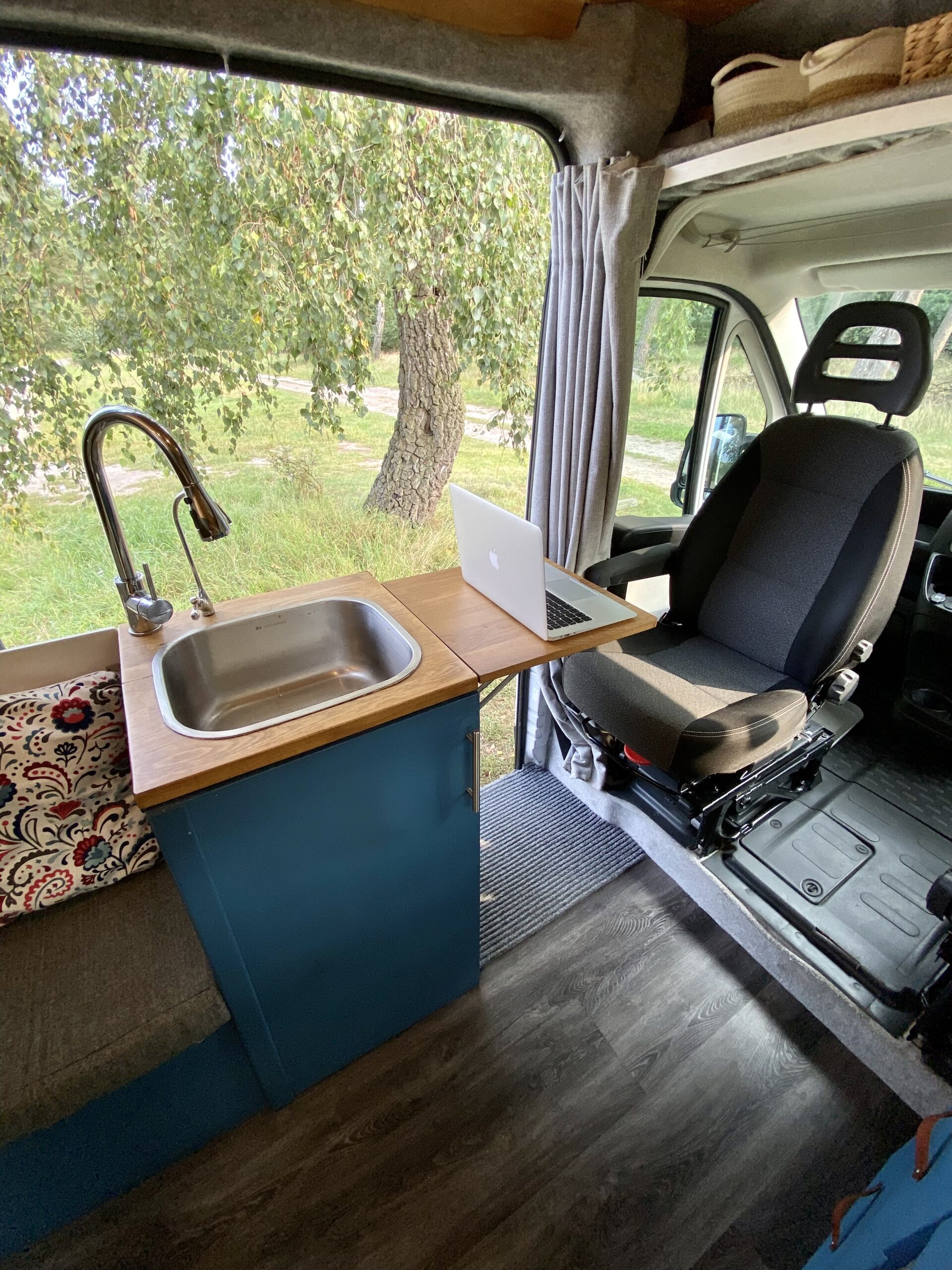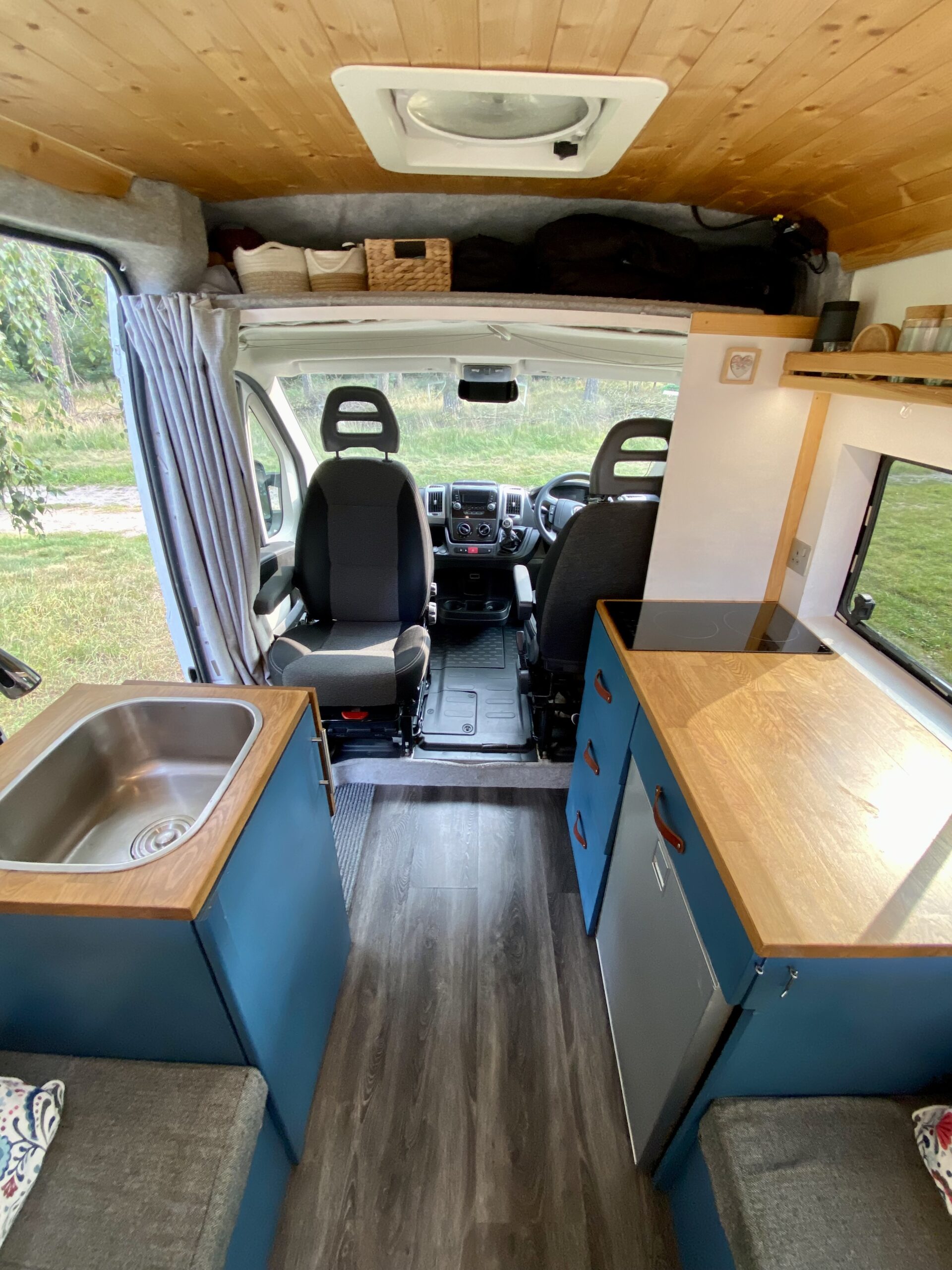 All important quick access to the cab, ideal for when it’s raining and you don’t want to open the sliding door, or just to reach through and hang a towel or dish cloth over the clothes line in cab. A blackout curtain easily separates the living space from the cab. (I would highlight cab access being essential if planning to live in the van long term and makes life much easier when the weather isn’t great).