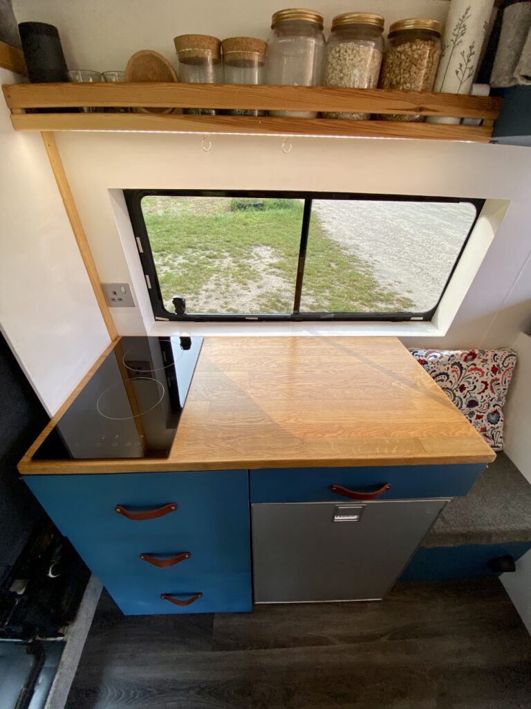 Built in induction hob, so no need to worry about refilling gas or turning it off when in transit. Making dinner or brewing coffee all from the power of the sun is just a wonderful feeling.