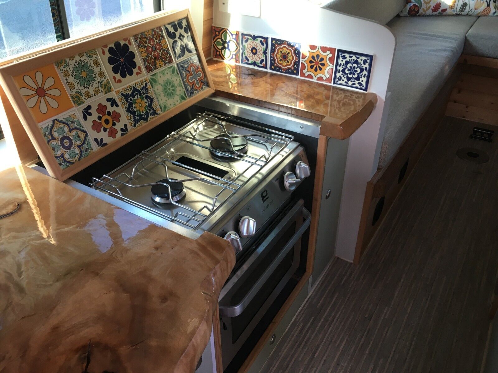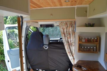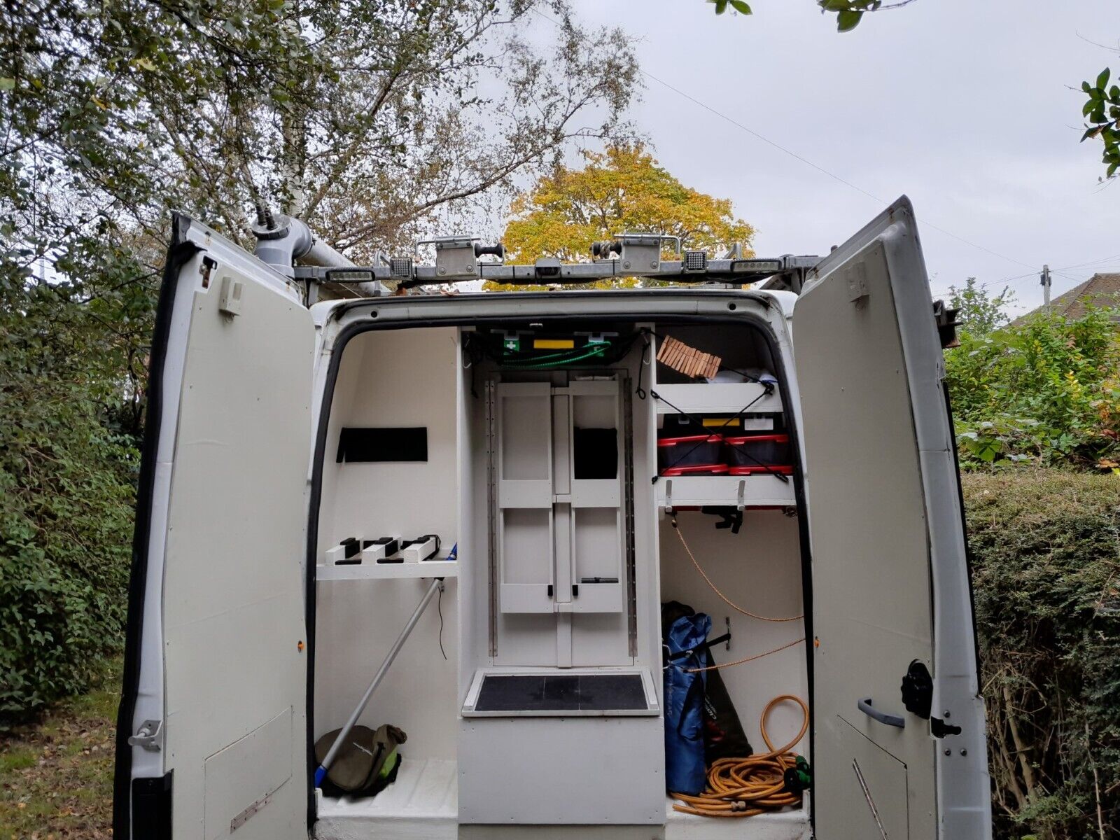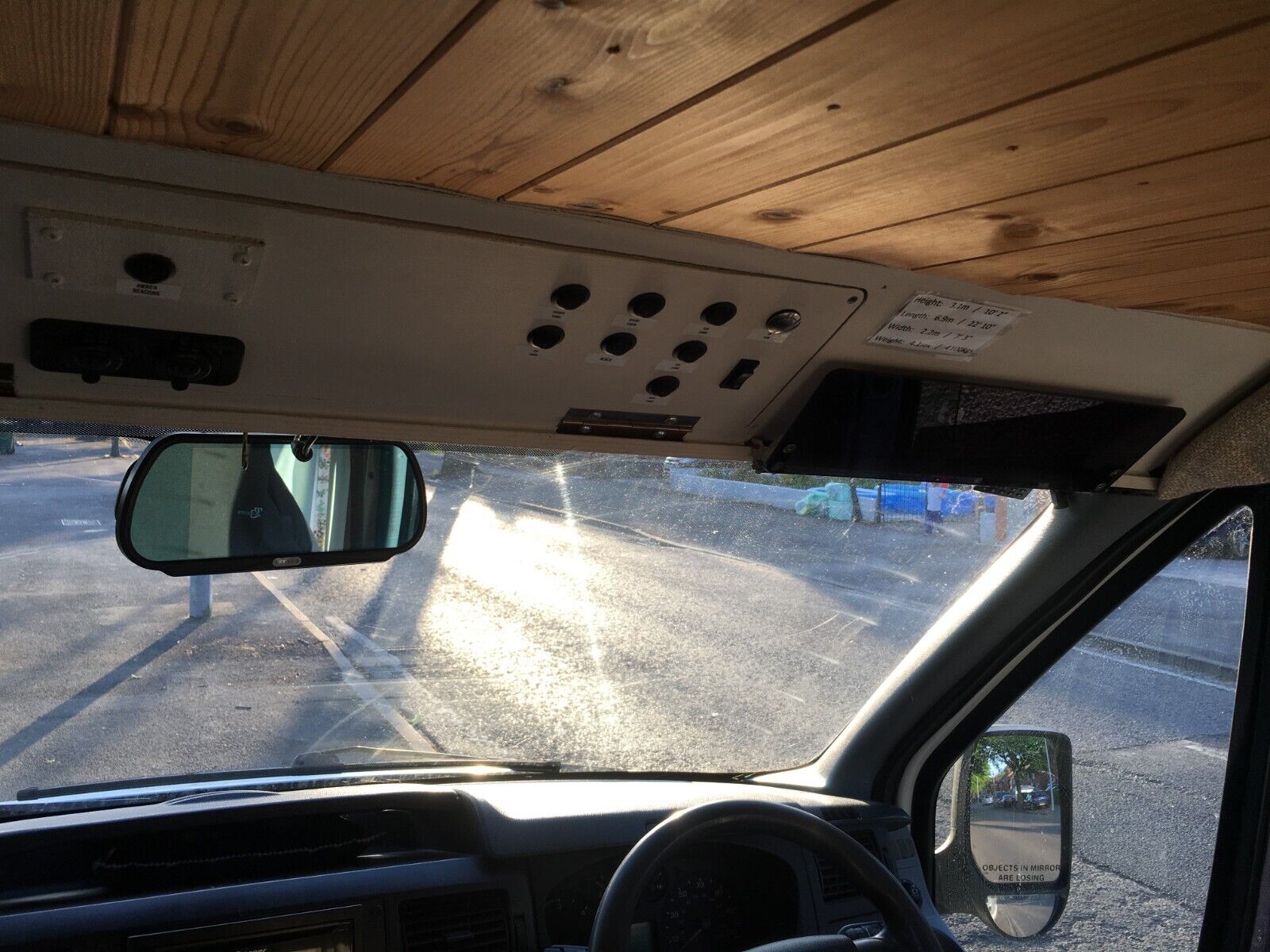 Safety was prime concern for the person who built this van from the drivers bulkhead , secure fixings throughout, venting for gas/heating CO2 smoke alarms, fire extinguisher, safety escape hatch.