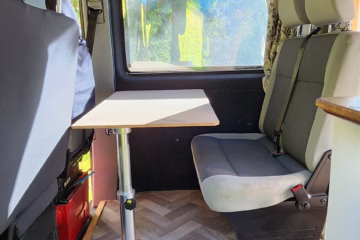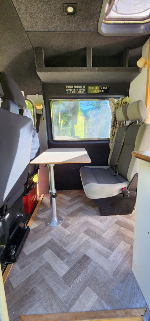 Front seat folds down and can have camp bunk stretcher erected or drop table down in front of rear seats for single children’s bed.