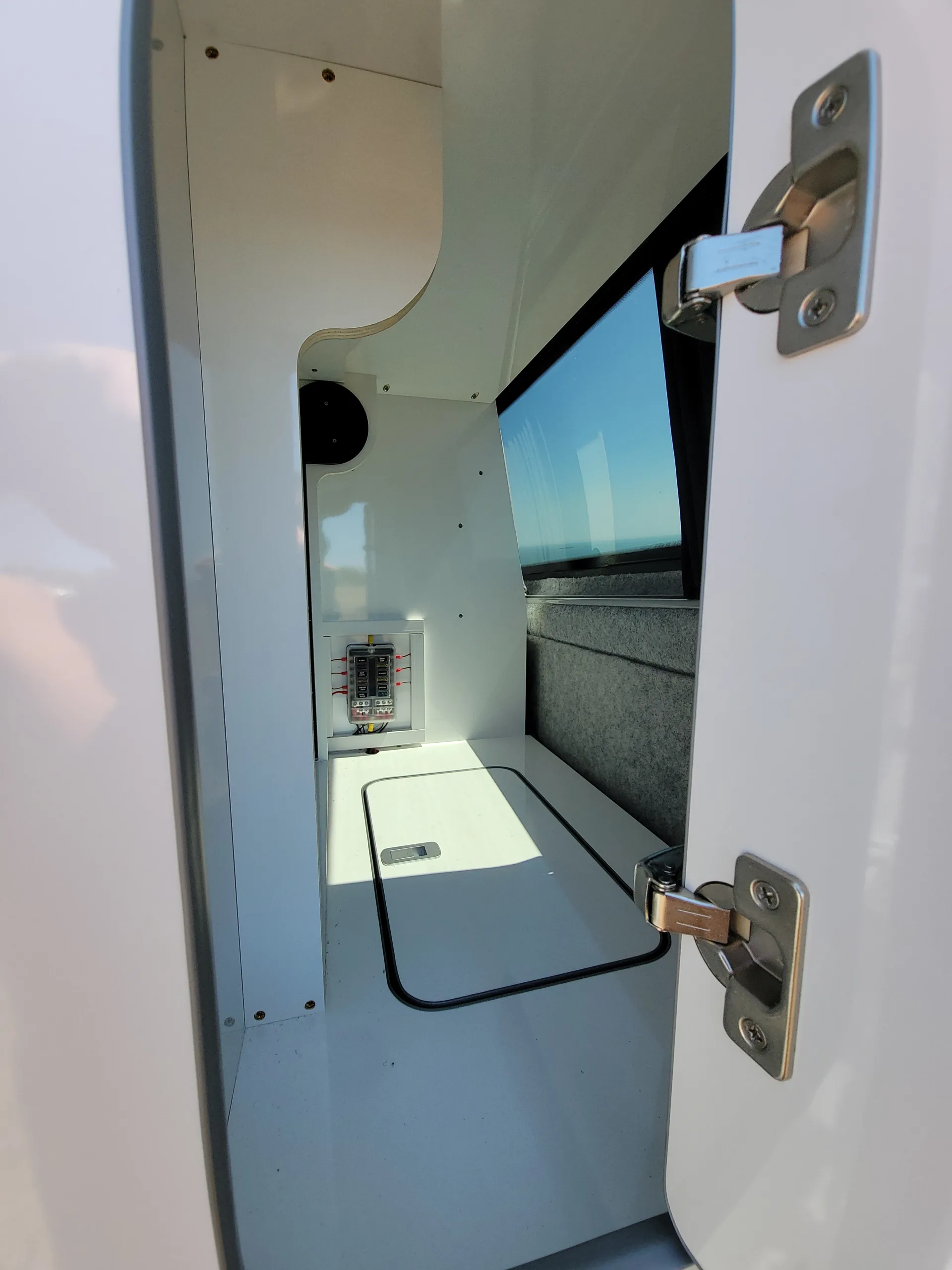 M1 tested rock and roll bed with belts, genuine matching seat fabric as the front seats and a gas strut so it opens up to seat position on its own