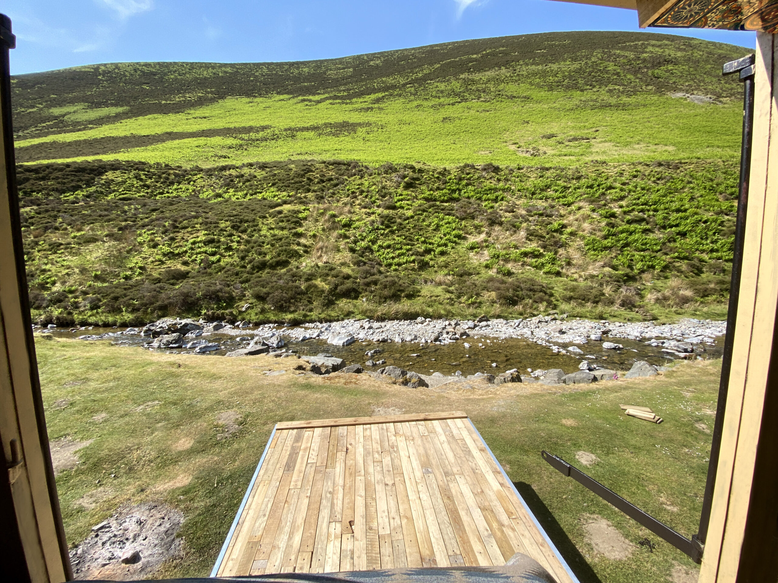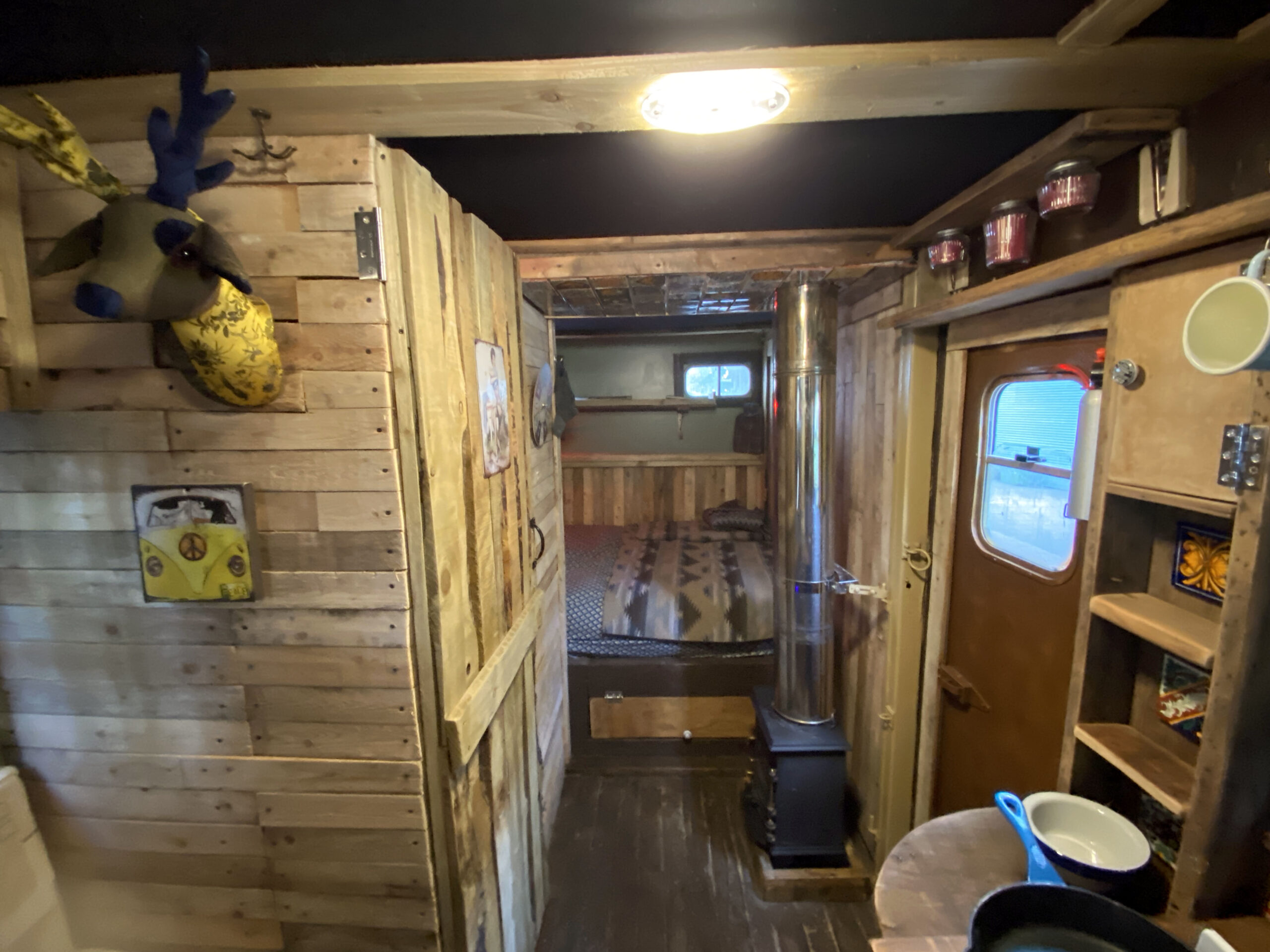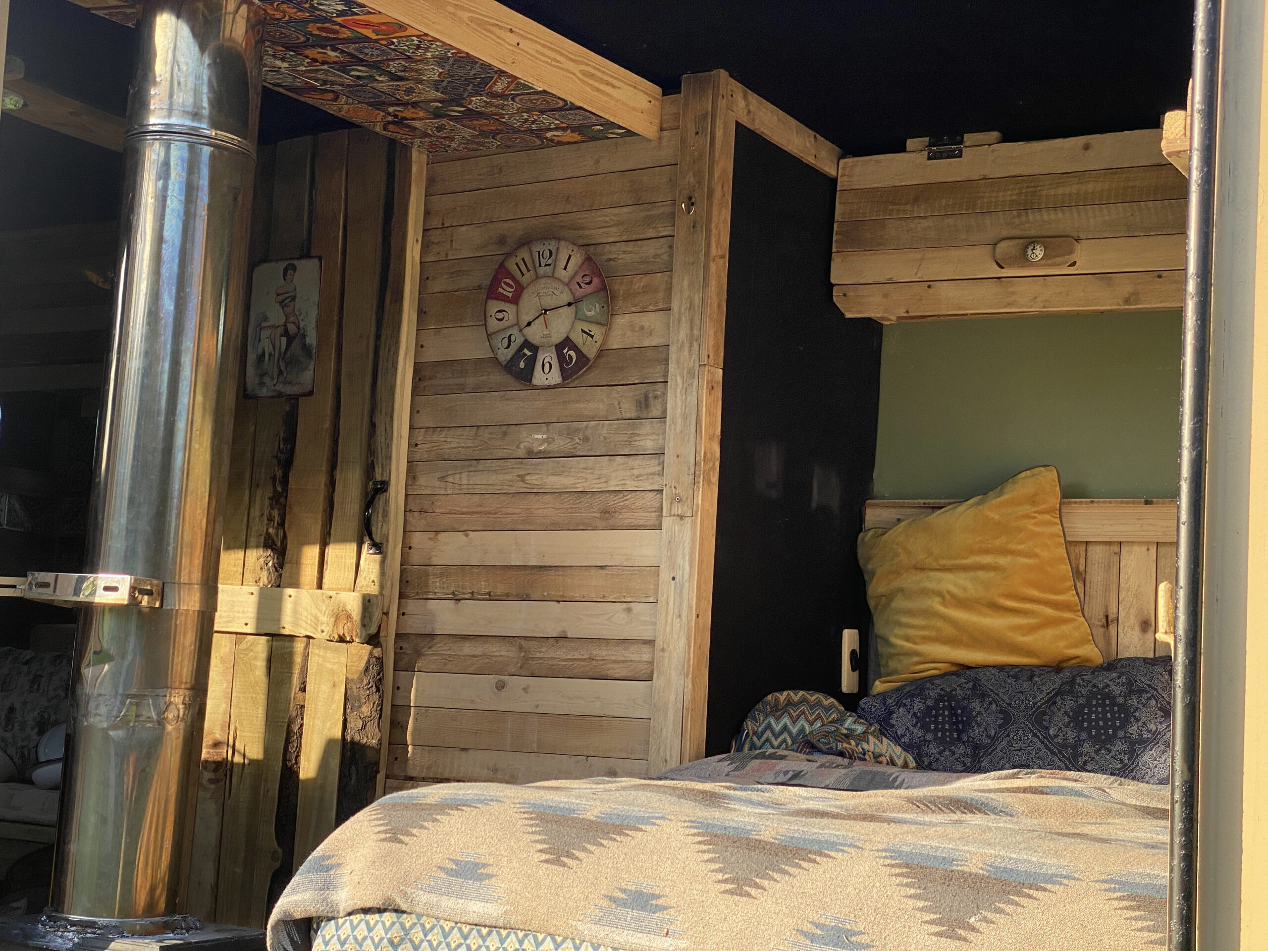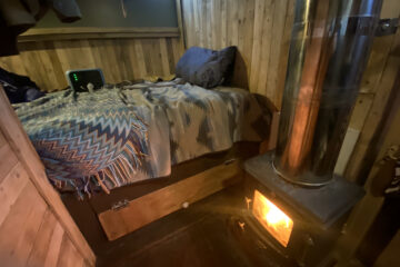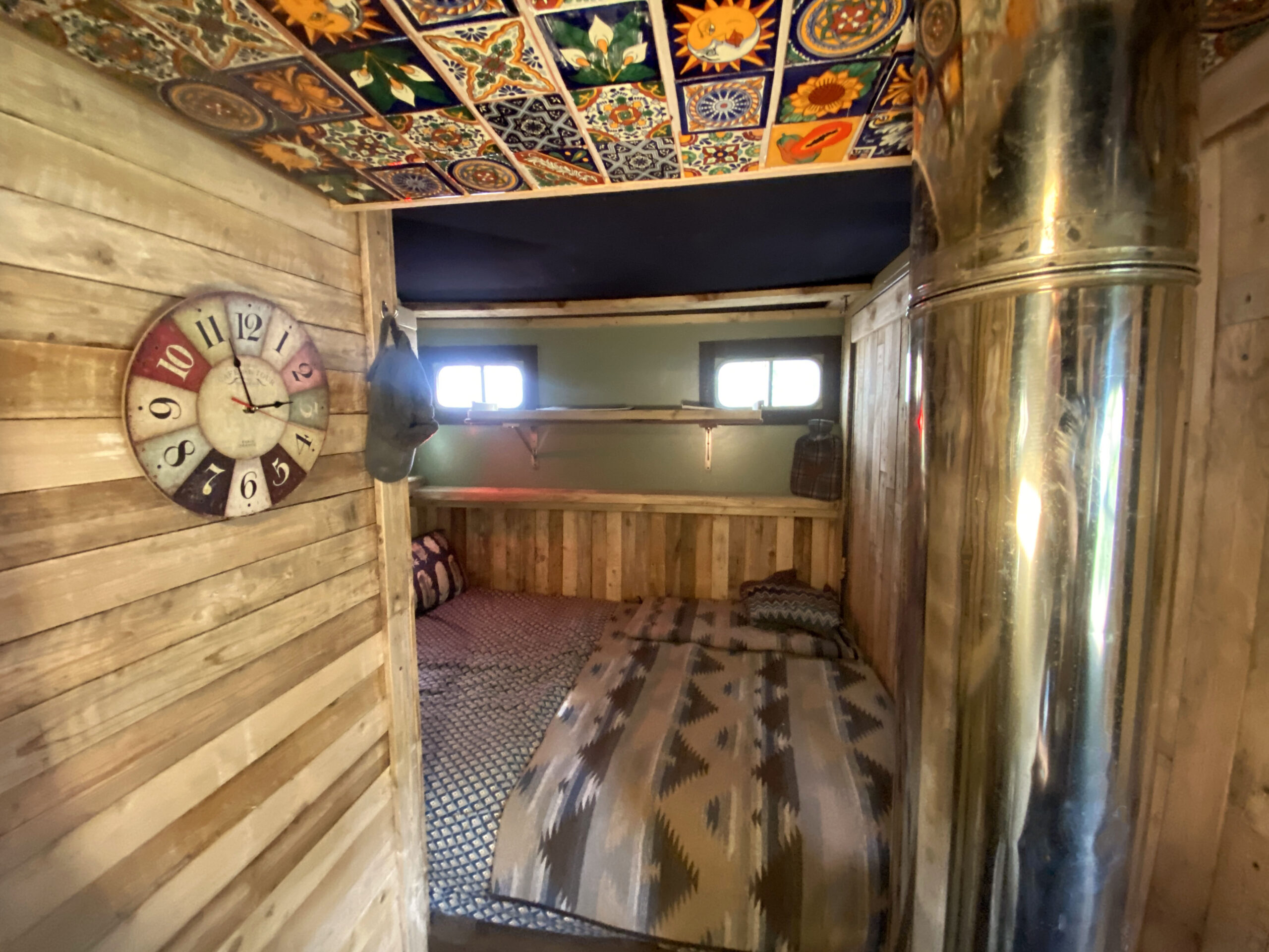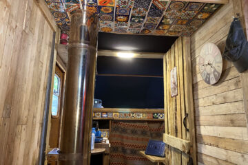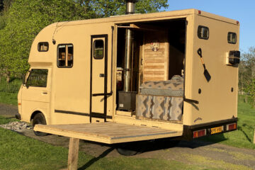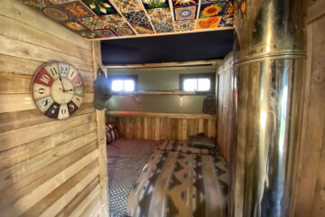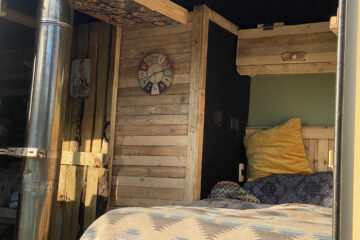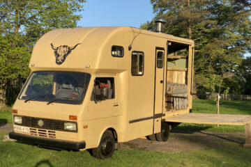 The wood-lined interior of this horsebox camper is crafted with love and care, using reclaimed wood from a 1920s church hall, providing a spacious and bespoke studio feel. The separate living and sleeping areas offer ample space to chill out and do your own thing. And let’s not forget the separate bathroom with a flush toilet for added convenience.