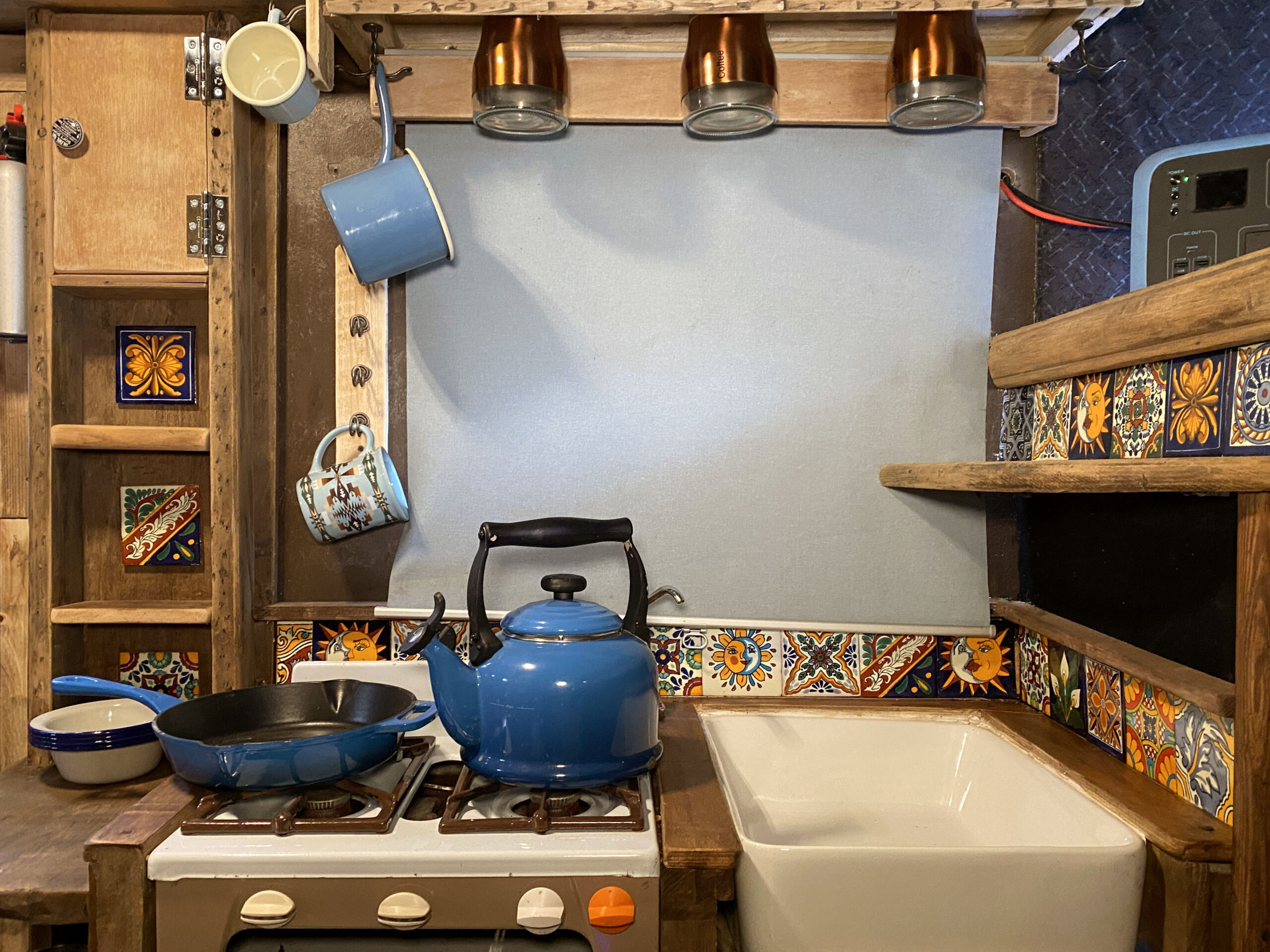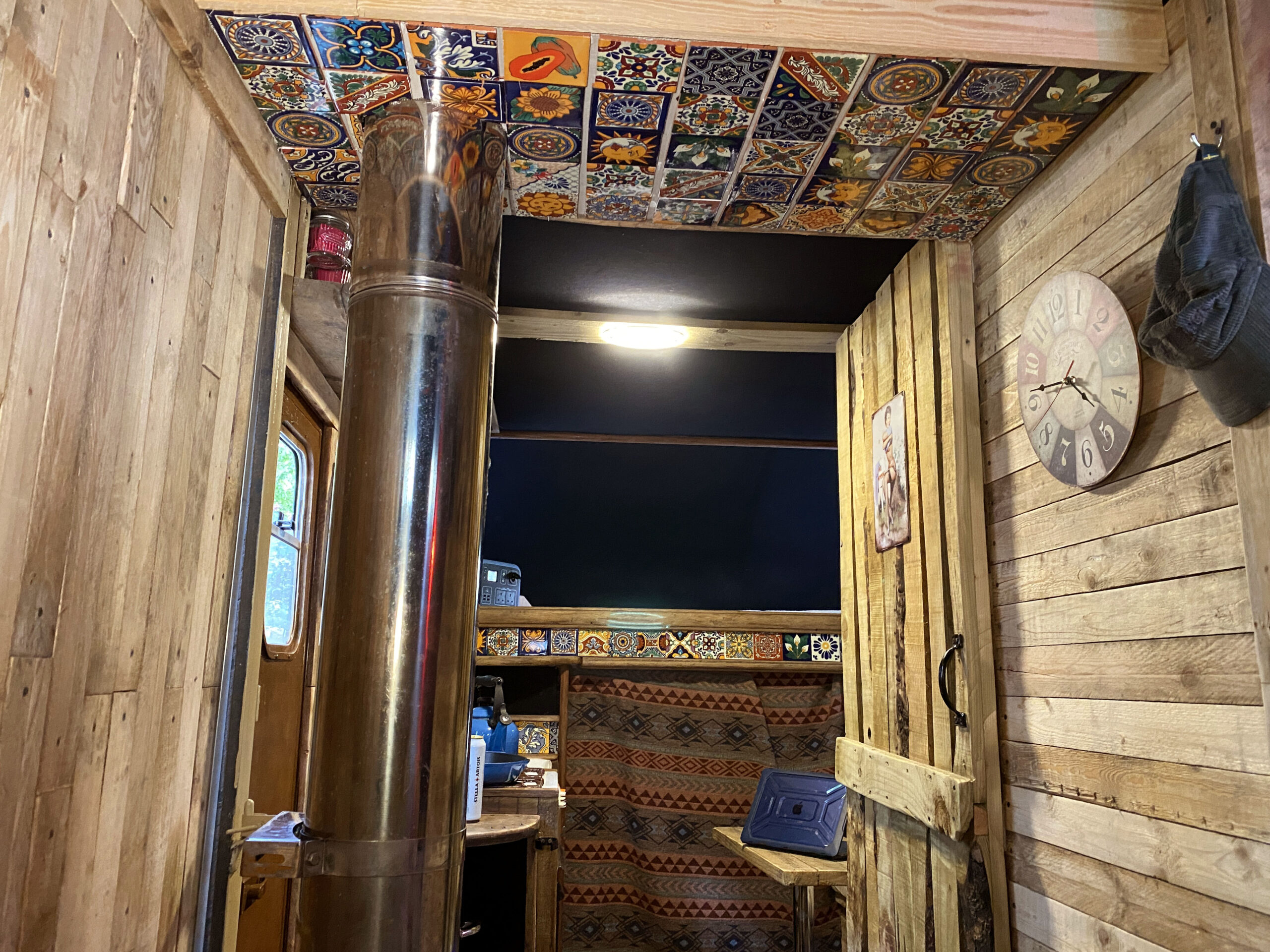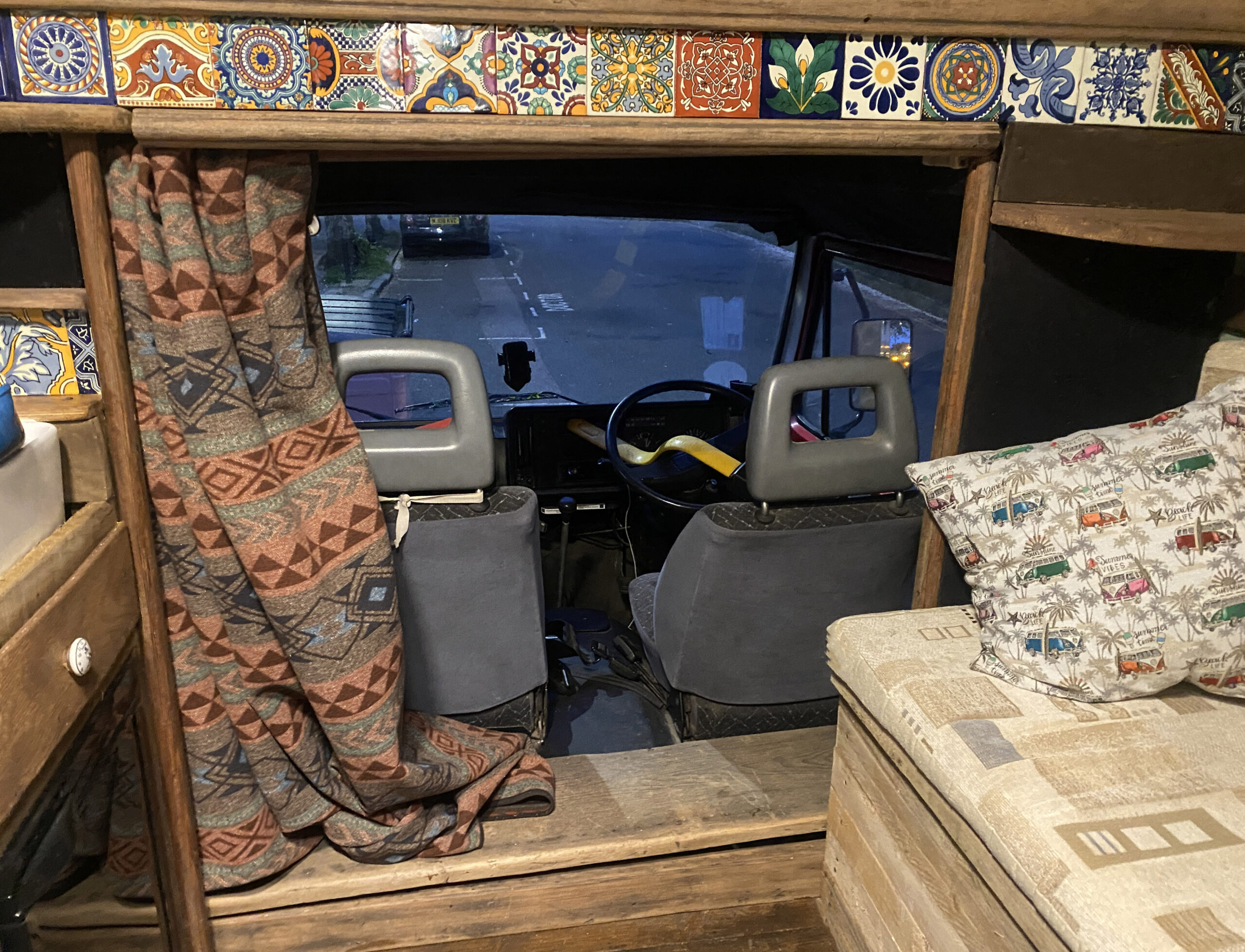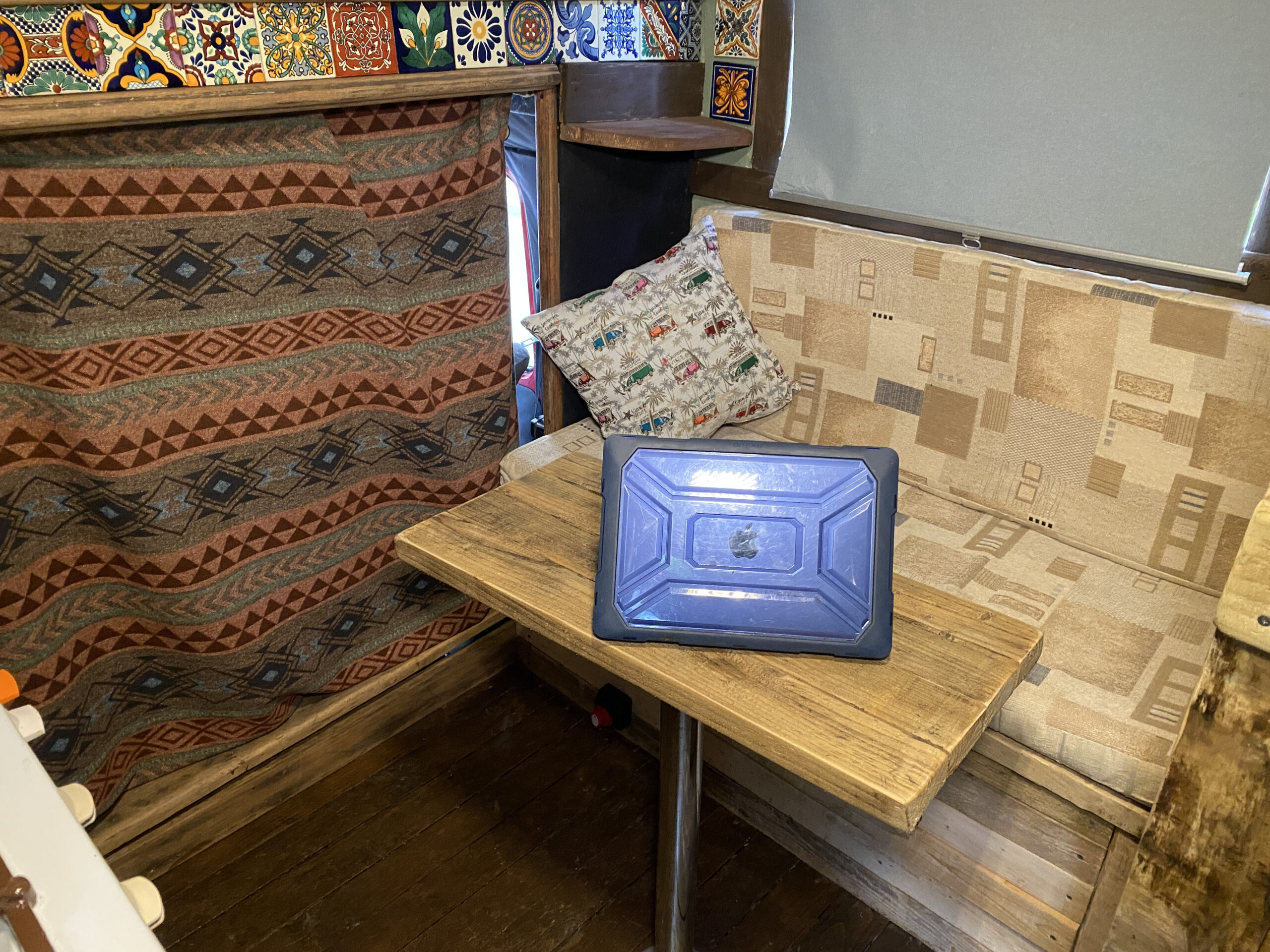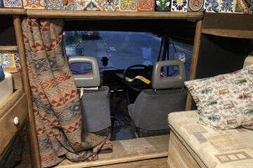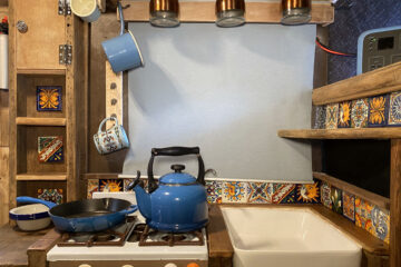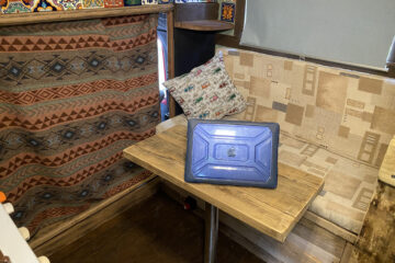 The van has a brand-new mattress still in the wrapper, and an over-the-cab double bed provides a comfortable sleeping space. Sleeps four. Underneath the bed is a large storage area, and a lockable outside storage locker is available for tools, etc. The gas bottle is accessed from its lockable outside locker too, and a real ceramic Belfast sink, handmade Mexican tiles, and solid oak floor add to the camper’s charm. A fixed table has been added with a take-off leg, making dining and working convenient. Sony Bluetooth stereo syncs automatically to your phone for playing tunes and taking calls. For those rainy days or chilled evenings.