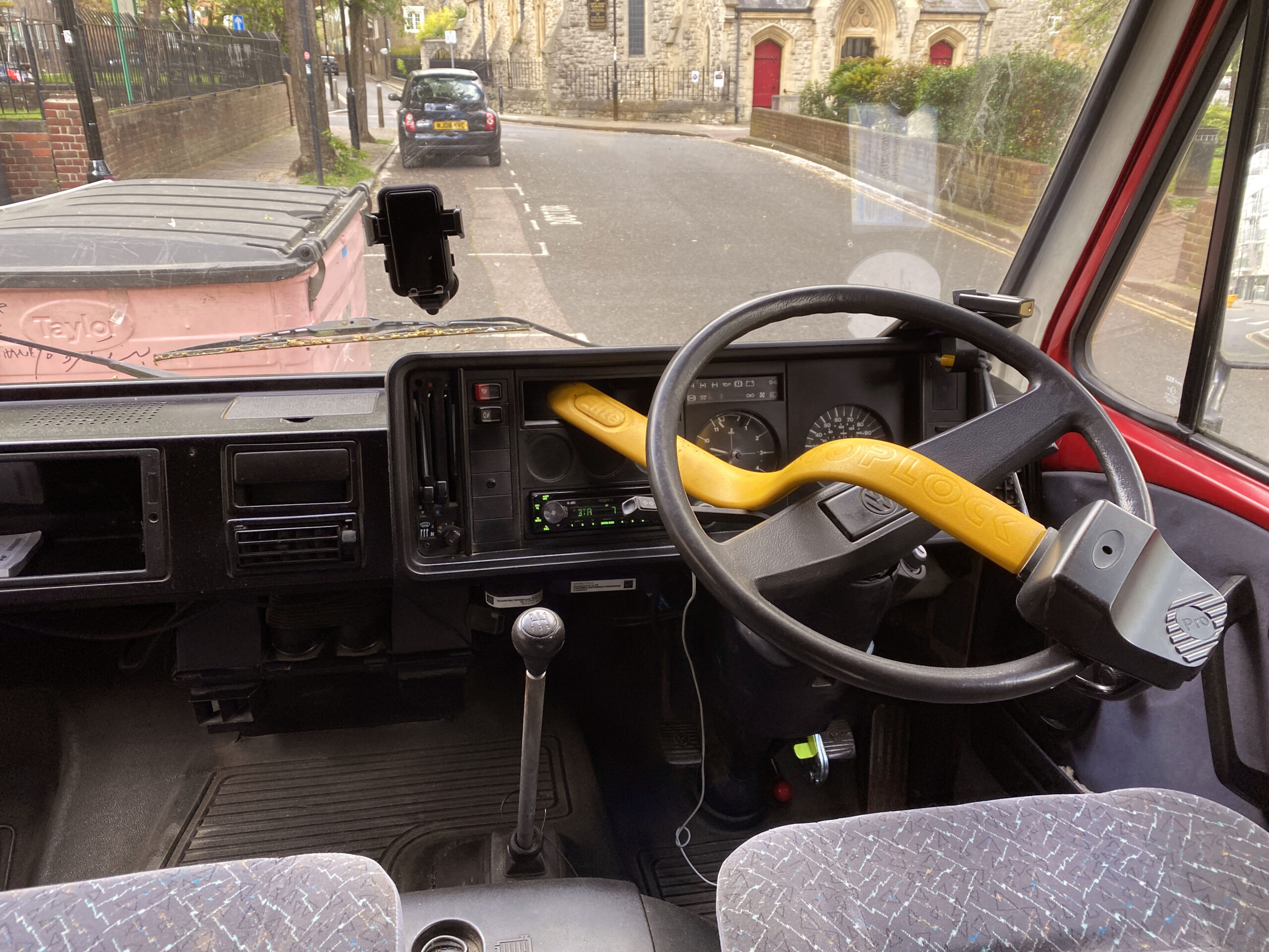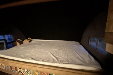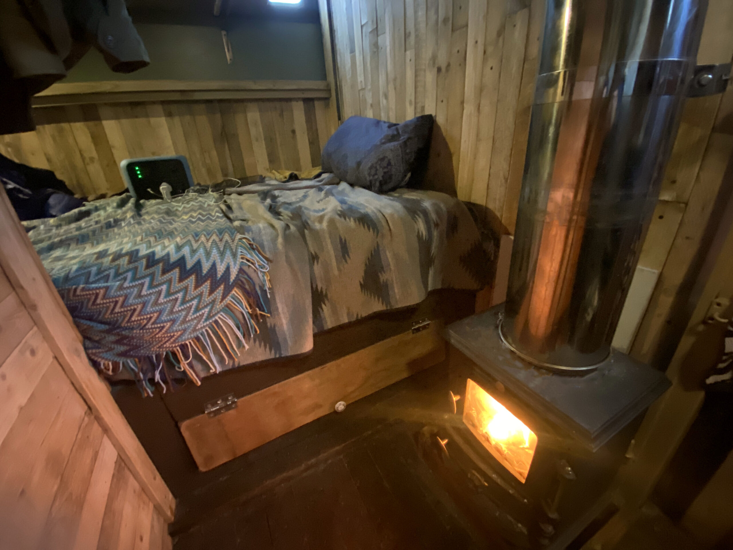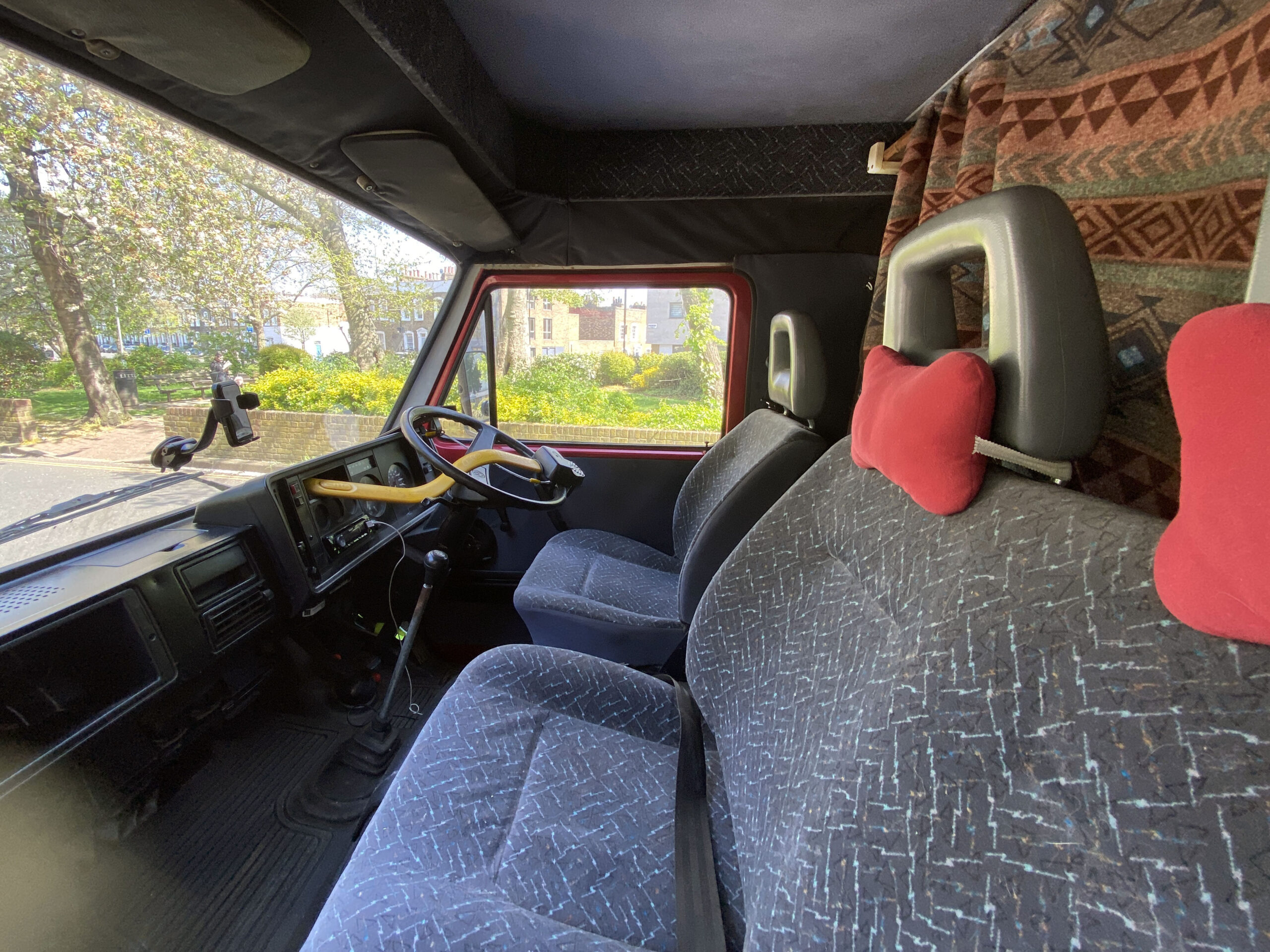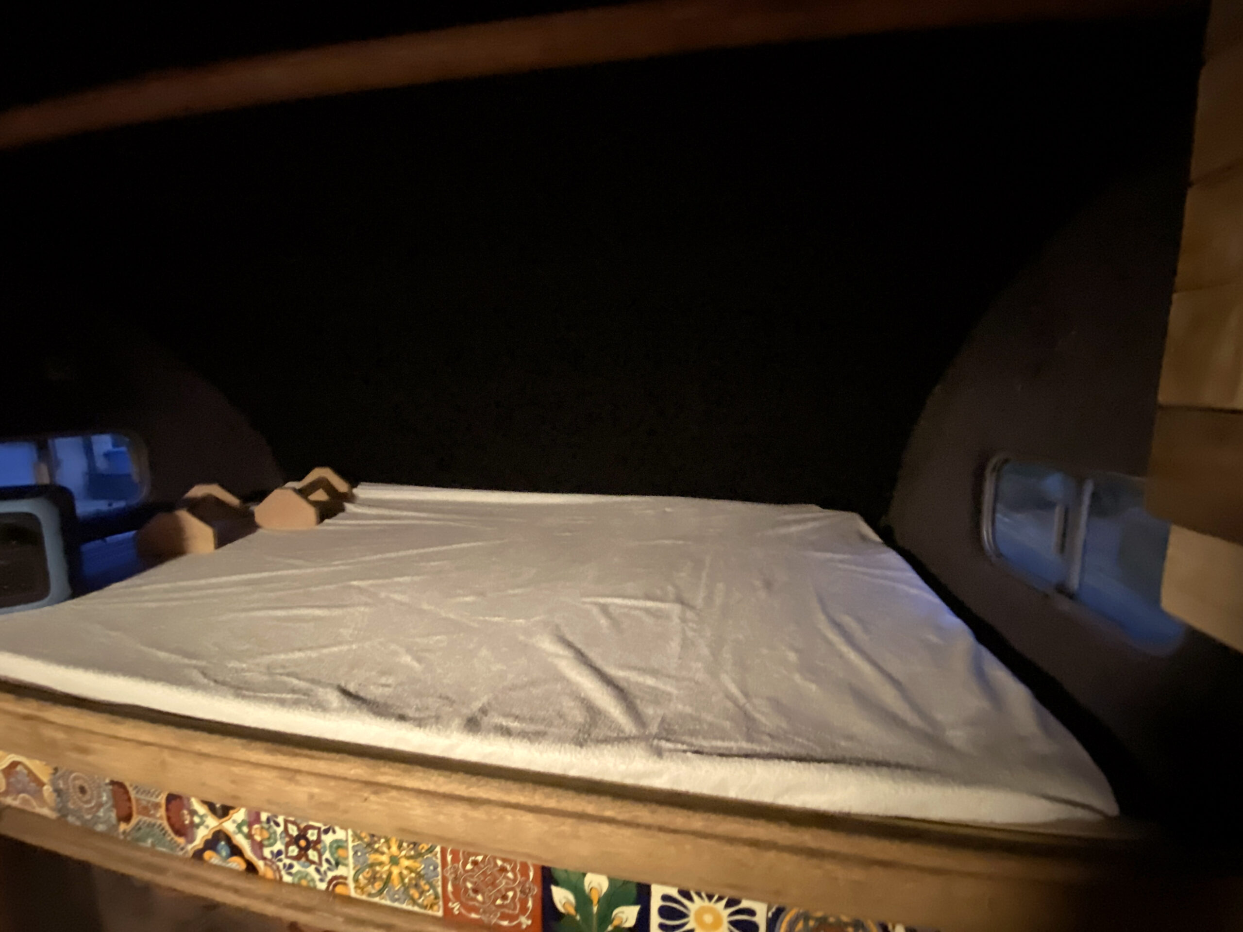 The van has a brand-new mattress still in the wrapper, and an over-the-cab double bed provides a comfortable sleeping space. Sleeps four. Underneath the bed is a large storage area, and a lockable outside storage locker is available for tools, etc. The gas bottle is accessed from its lockable outside locker too, and a real ceramic Belfast sink, handmade Mexican tiles, and solid oak floor add to the camper’s charm. A fixed table has been added with a take-off leg, making dining and working convenient. Sony Bluetooth stereo syncs automatically to your phone for playing tunes and taking calls. For those rainy days or chilled evenings.