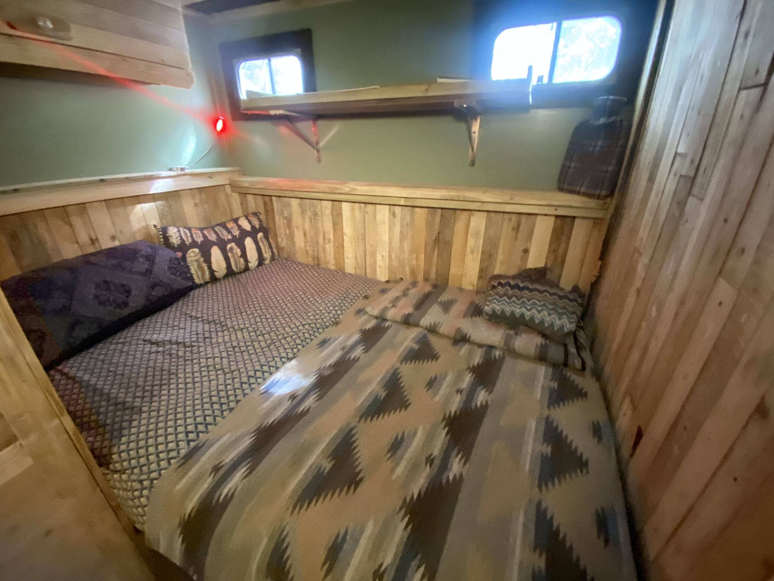 With seven windows, heaps of light, and a 12V LED feature lighting system with recessed ceiling lights that can glow blue at night, “Woody” creates a calming and relaxing atmosphere. Additionally, the reading light in the bedroom and USB ports at the bed and 12V control box run off the leisure battery, allowing you to stay connected even while off-grid.