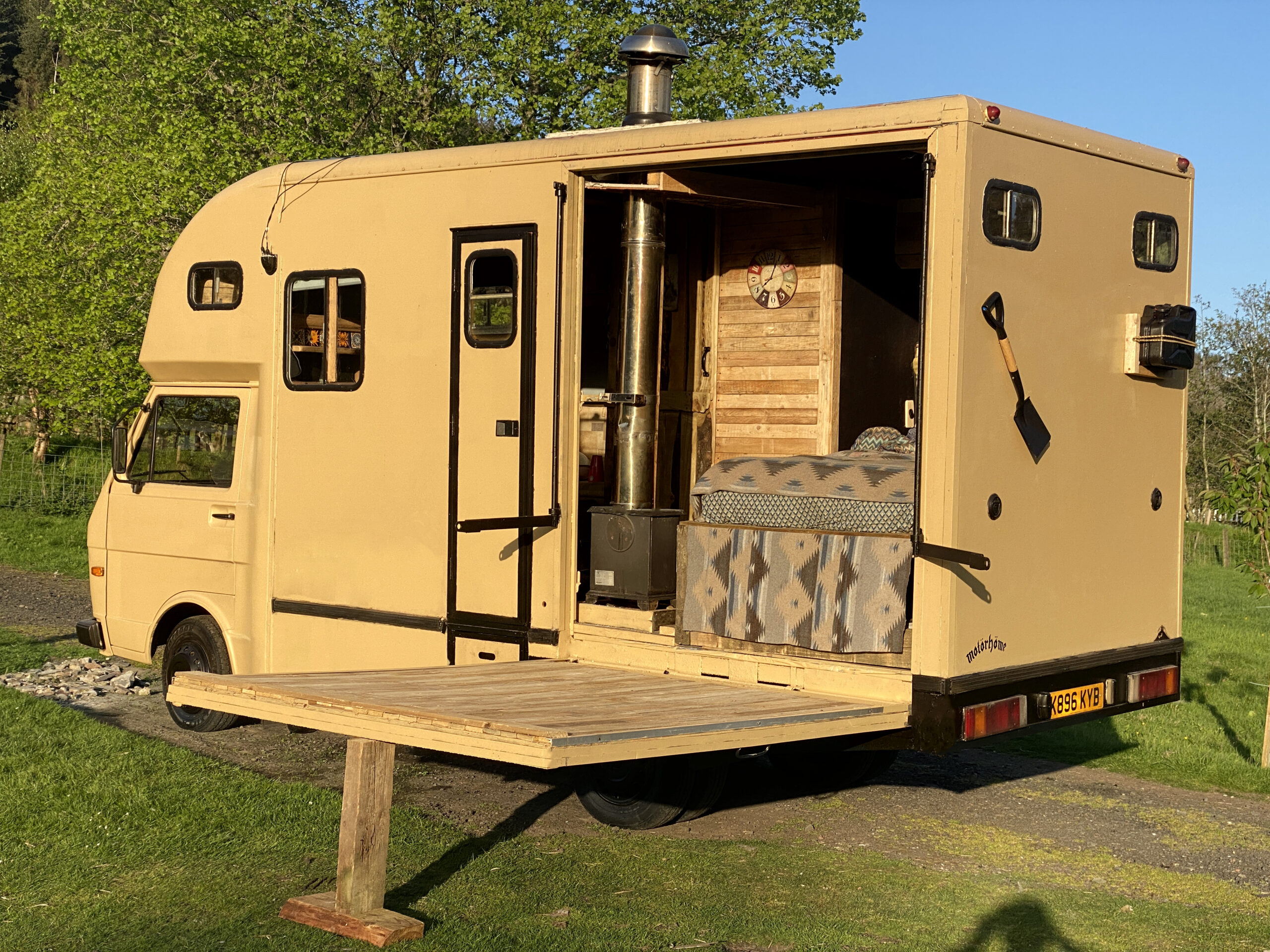 Experience the ultimate off-grid living with “Woody” – a beautifully converted VW LT horsebox with power steering that exudes a “log cabin” style. This camper van is perfect for Adventurous couples seeking a weekend getaway or a week-long adventure to escape from the hustle and bustle of city life. It is also an ideal option for those who want to escape the cost of living crisis and enjoy free electricity and cheap gas. Full-time living was what she was built for and festivals in mind. With “Woody,” changing scenery has never been easier. Guaranteed to make you feel like you’re in your own log cabin in the woods.