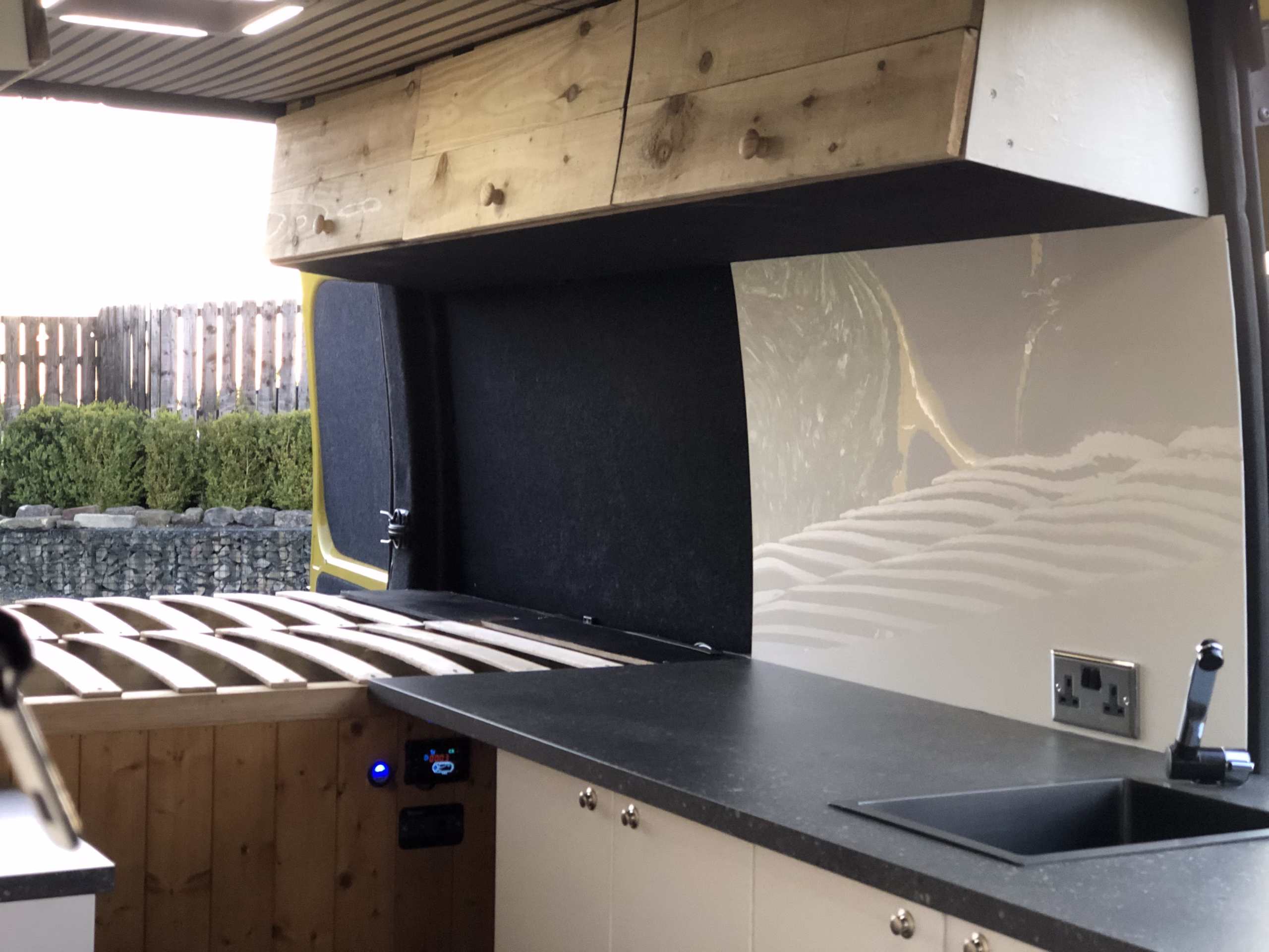 It comes with off-grid capability with a 120 w solar panel running through a MPPT solar charge controller into an entry level leisure battery. It also has a 230v hook up also with two twin plug sockets and these plugs will automatically activate either through the hook up system or via the 2000w Renogy invertor if youβre off-grid.