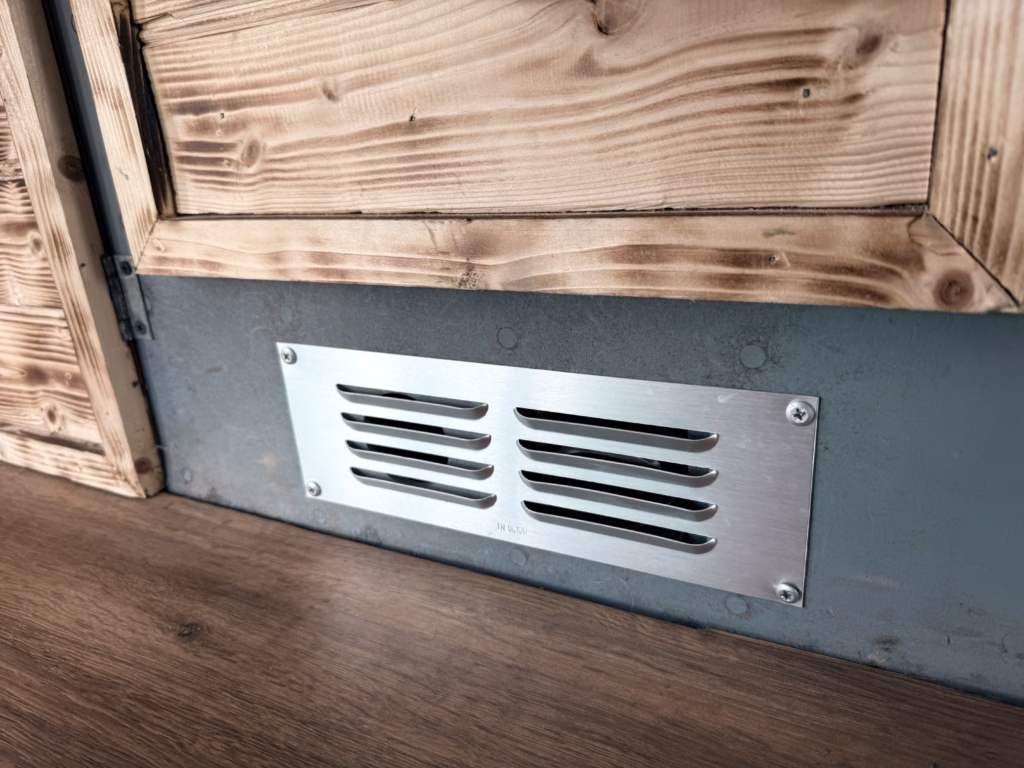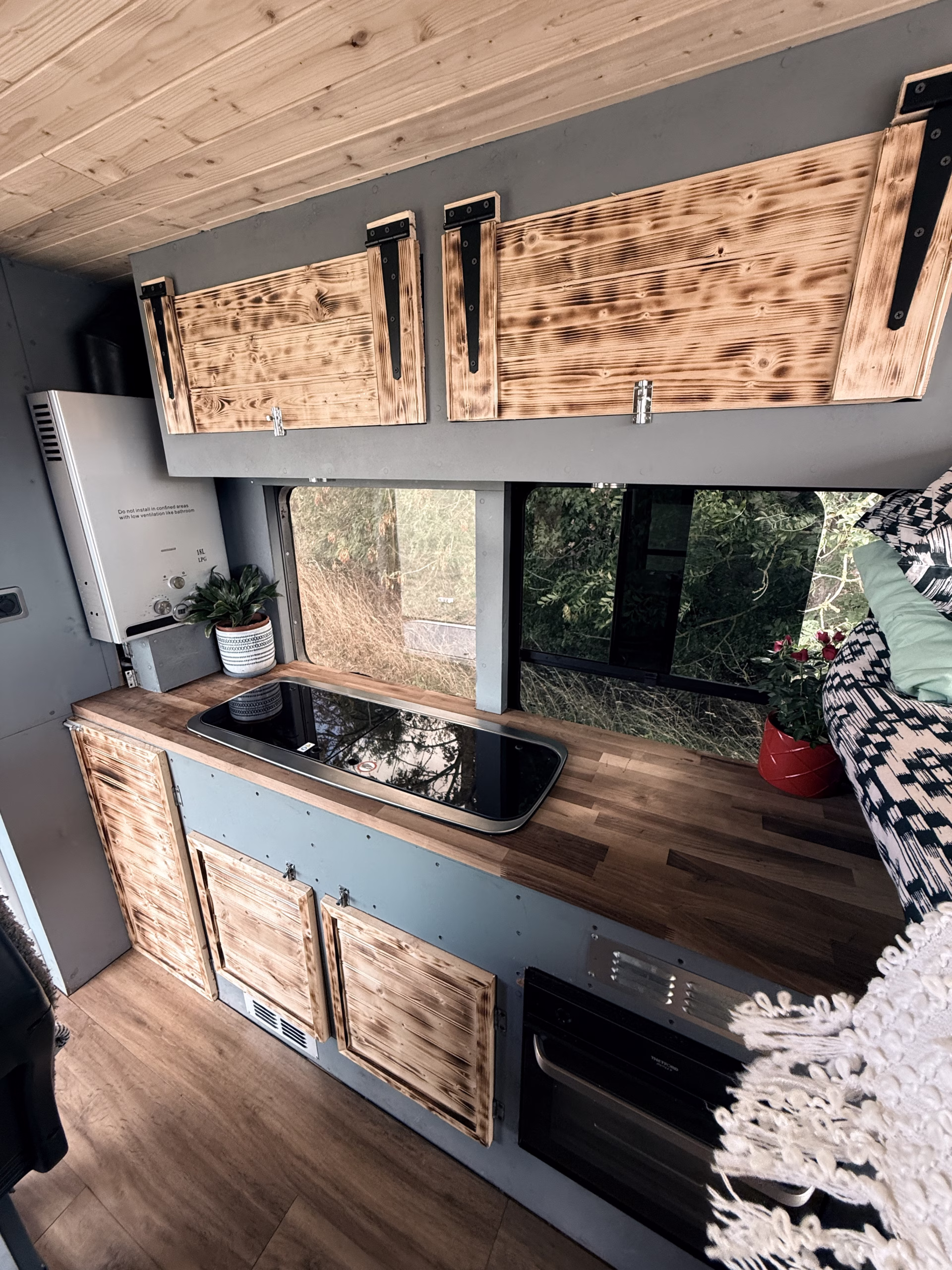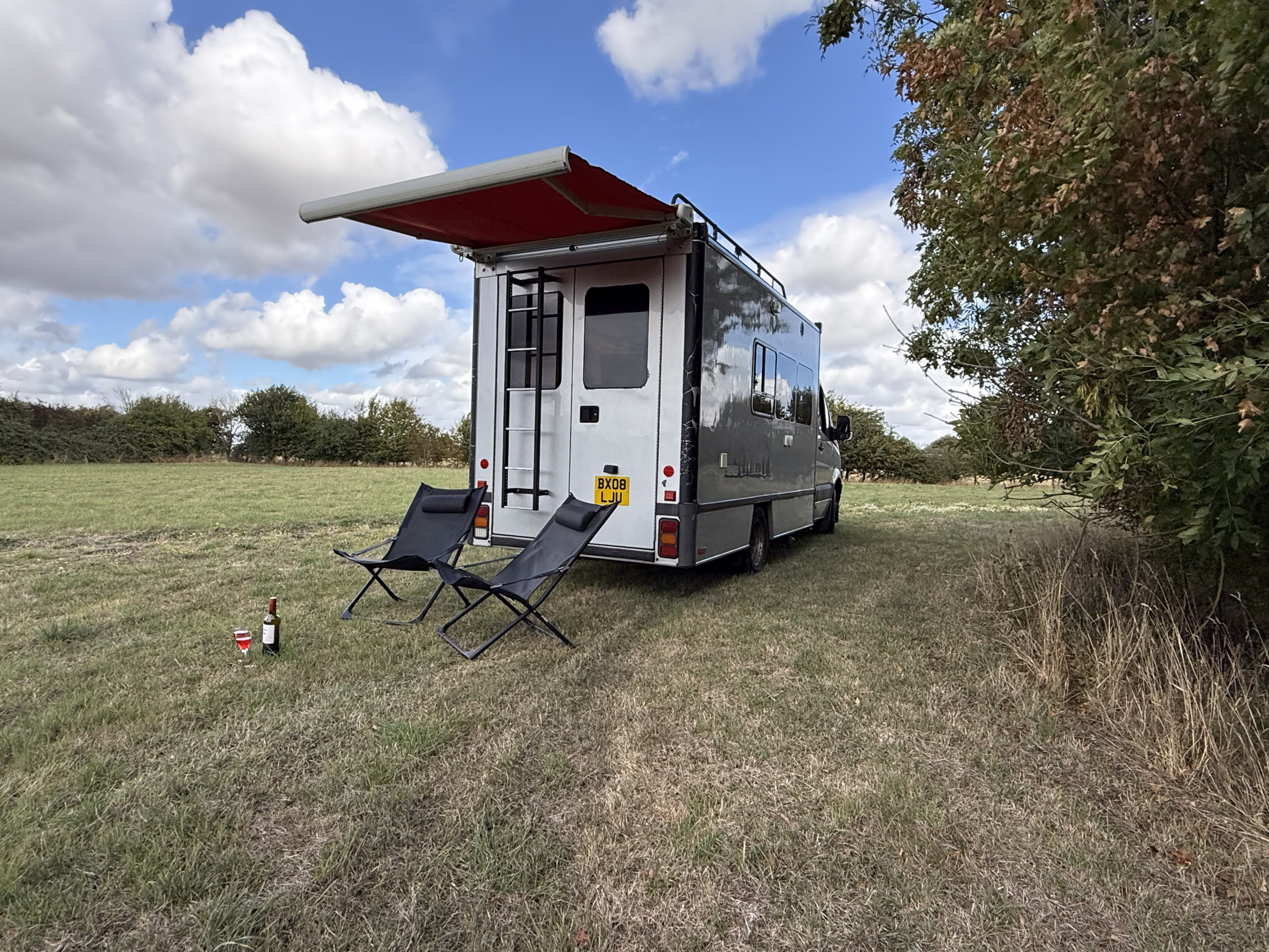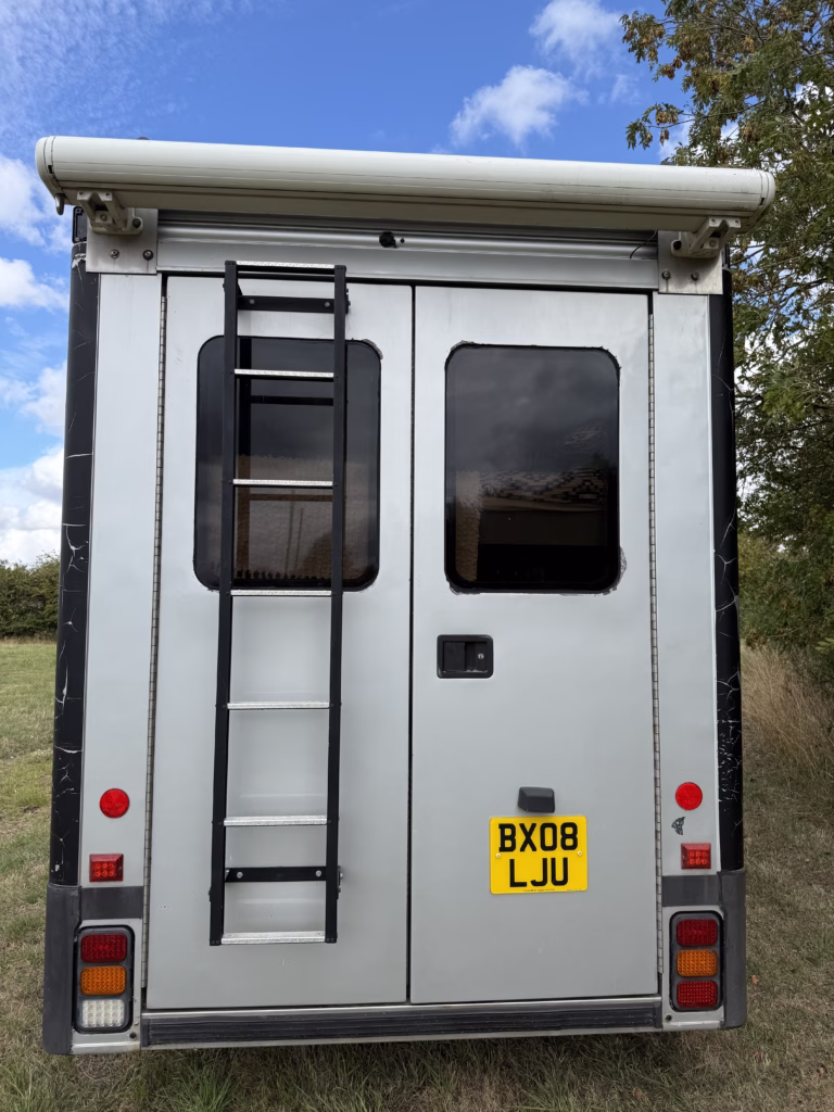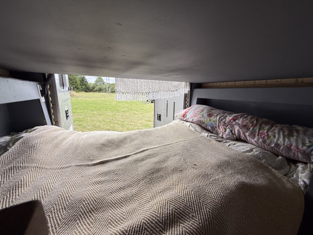 The kitchen / galley has a gas oven, and twin hobs and plenty of space to cool full meals prepared on the open road using artisan food shops and farm shops to make this part of life outdoors . The rear barn doors allow great views whether enjoying a cup of tea in bed or dining Alfresco in the dining area with a wind out awning for shade or shelter.
