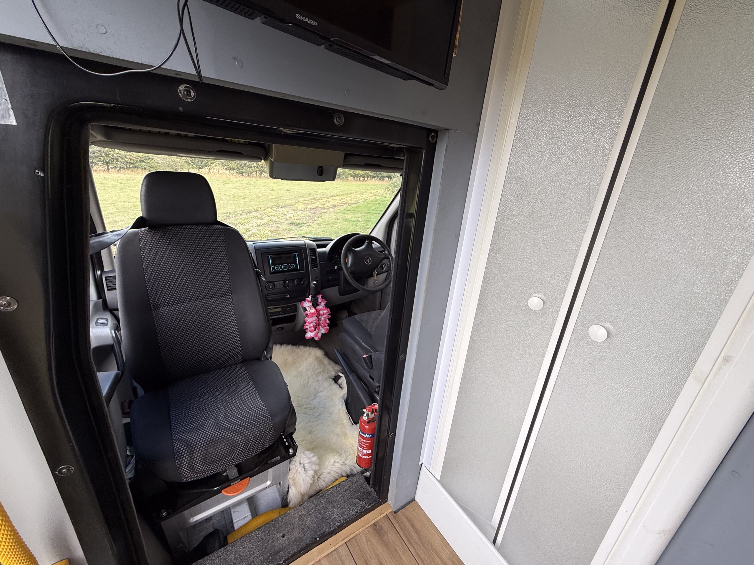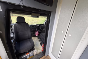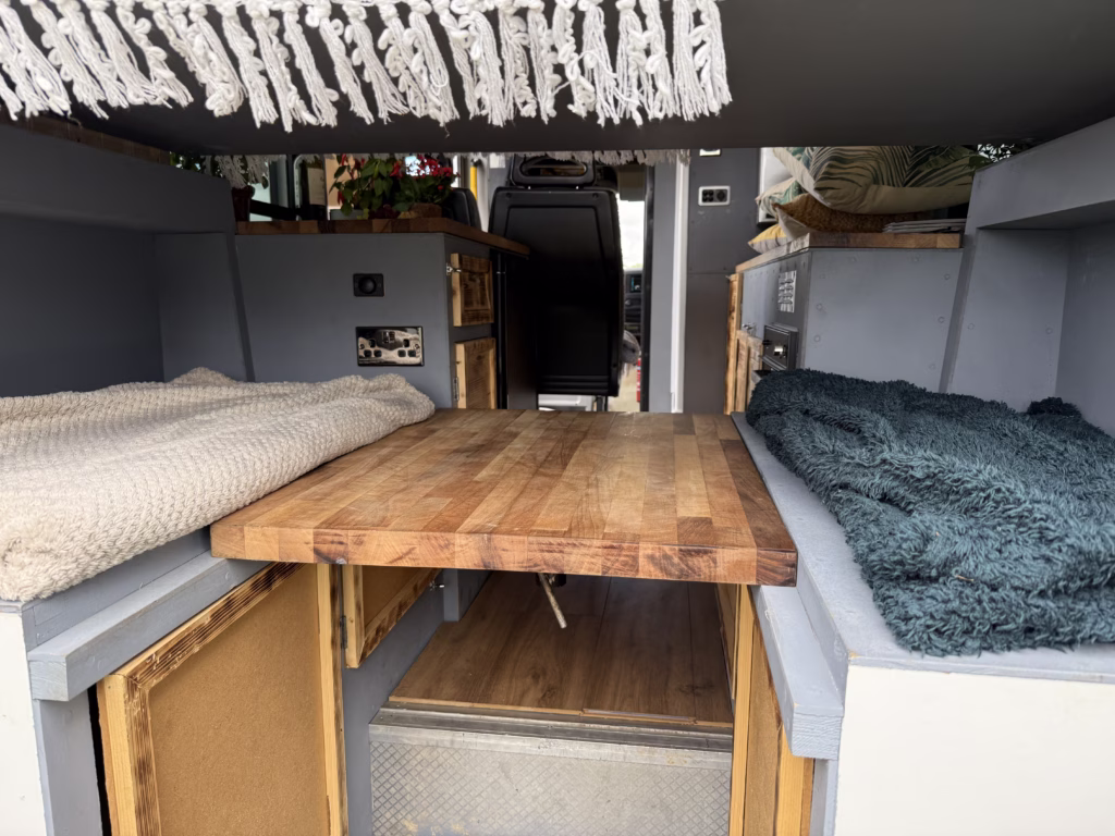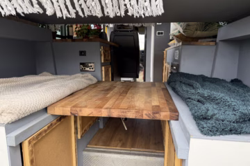 The bed area is raised to allow a comfortable double bed or double bunk for children etc with 4 belted seats, two in the back and the two front seats. With the bed raised 4 people can sit comfortably in the back dining area with a rotating and removal solid wood table, plus the 2 belted middle seats meaning more space for hosting. The passenger seat can be rotated as a captains chair to allow space inside that is very flexible.