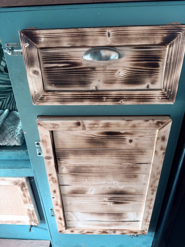◦ Burnt wood effect door panels, laminate flooring & panelling