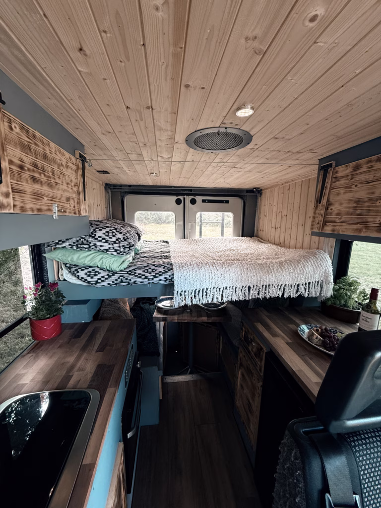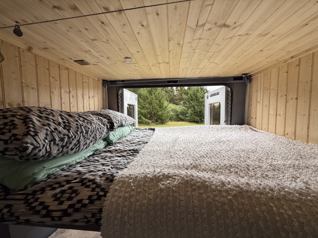 A winch down double bed on foam mattress from the ceiling in the rear section of the van, when winched up the camper van offers alfresco dining in the rear section, second kids beds or adults under the main double bed. neat and confortable