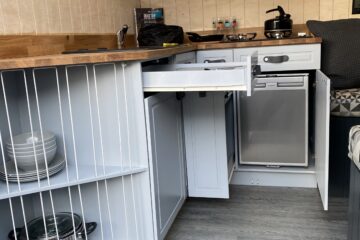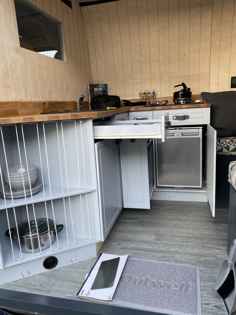 The kitchen units contain 1 large cupboard, 1 drawer and 1 pantry cupboard. The other 2 cupboards contain the wastewater tank and the fridge. All cupboards are fitted with latches to stop opening when moving.