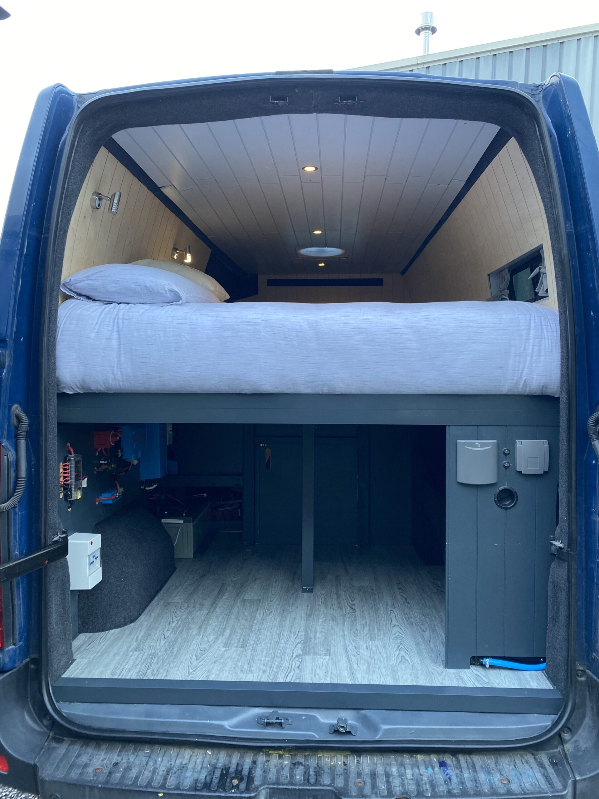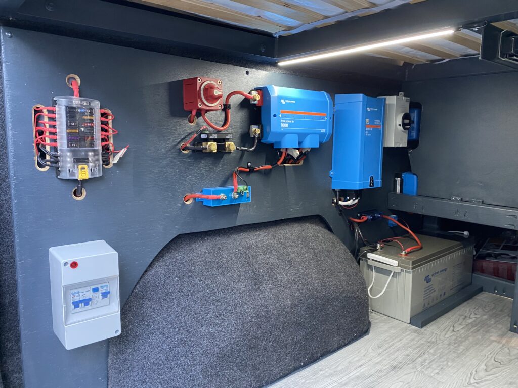 The conversion was completed by myself and my partner, to a high standard with premium materials used. It has been designed to be as lightweight as possible whilst not compromising on the spec. The van is fully capable of off-grid living and all gas and electrics have been installed and signed off by qualified engineers for which I can provide contact details and invoices along with photographs throughout. The original electrical specification was carried out by a well-renowned company who provided wiring diagrams, fuse calculations and all cables, fixings and other items used. The van has been tested to ensure all elements work but aside from that all elements are brand-new with receipts. The van floor was done using battens, Celotex boarding, 12mm ply and then heavy duty altro vinyl flooring. The walls and ceiling have been constructed with Dodo soundproof dead mats, Celotex boards and recycled plastic insulation and battens with vapour barrier on top before routered 6mm birch ply was fixed to the battens. The screws could easily be filled and the area painted if desired. The log of photos shows this process as well as all the wiring within conduit behind the vapour barrier.