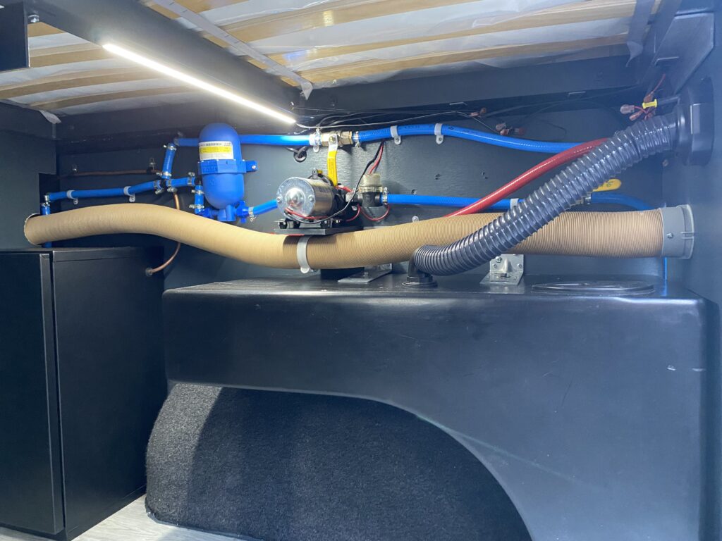 Under bench storage on one side where a toilet could be kept with access to the Trauma boiler the other side
