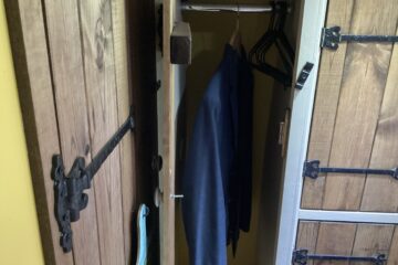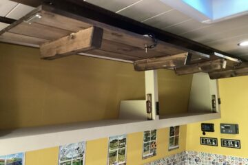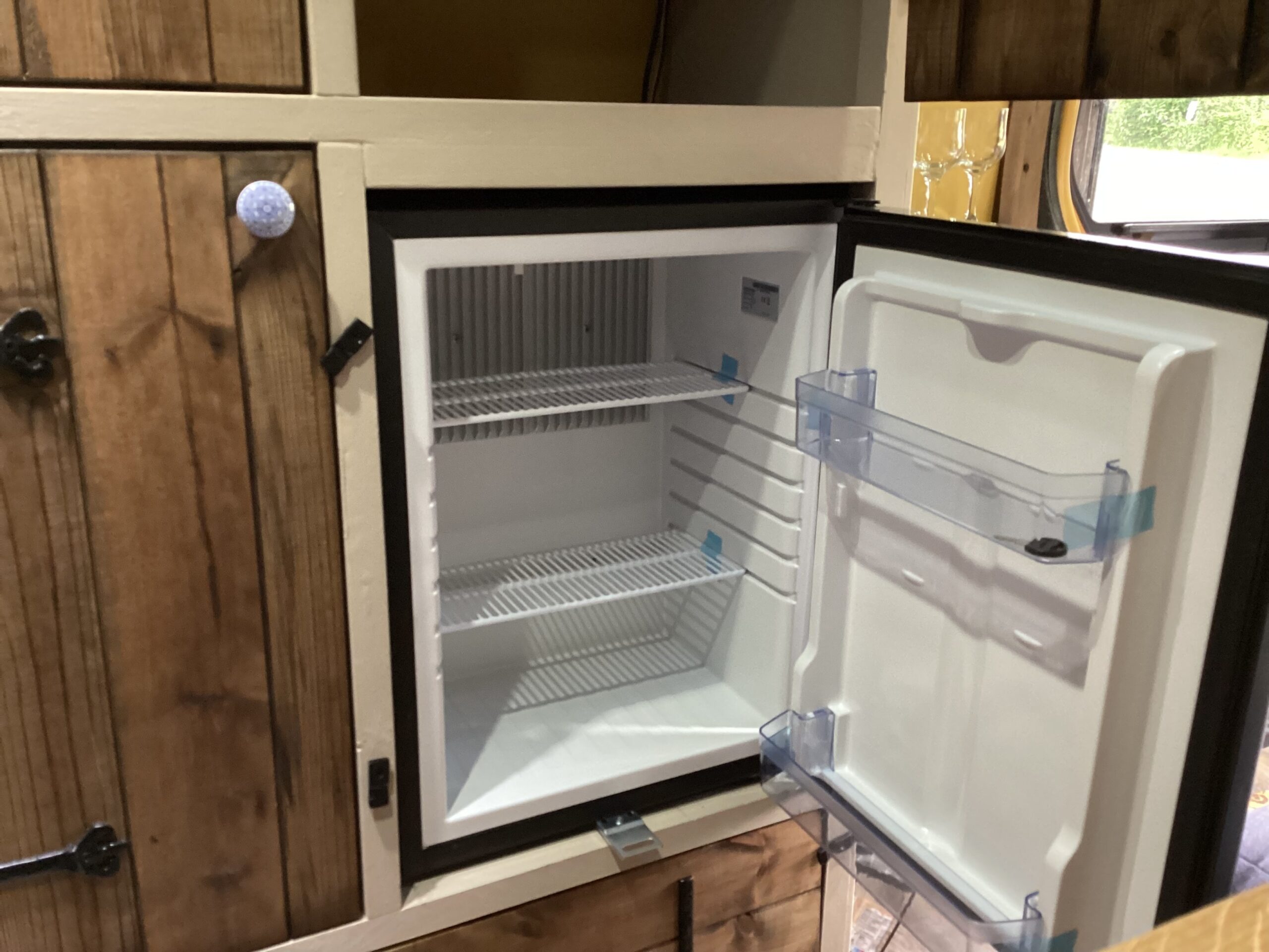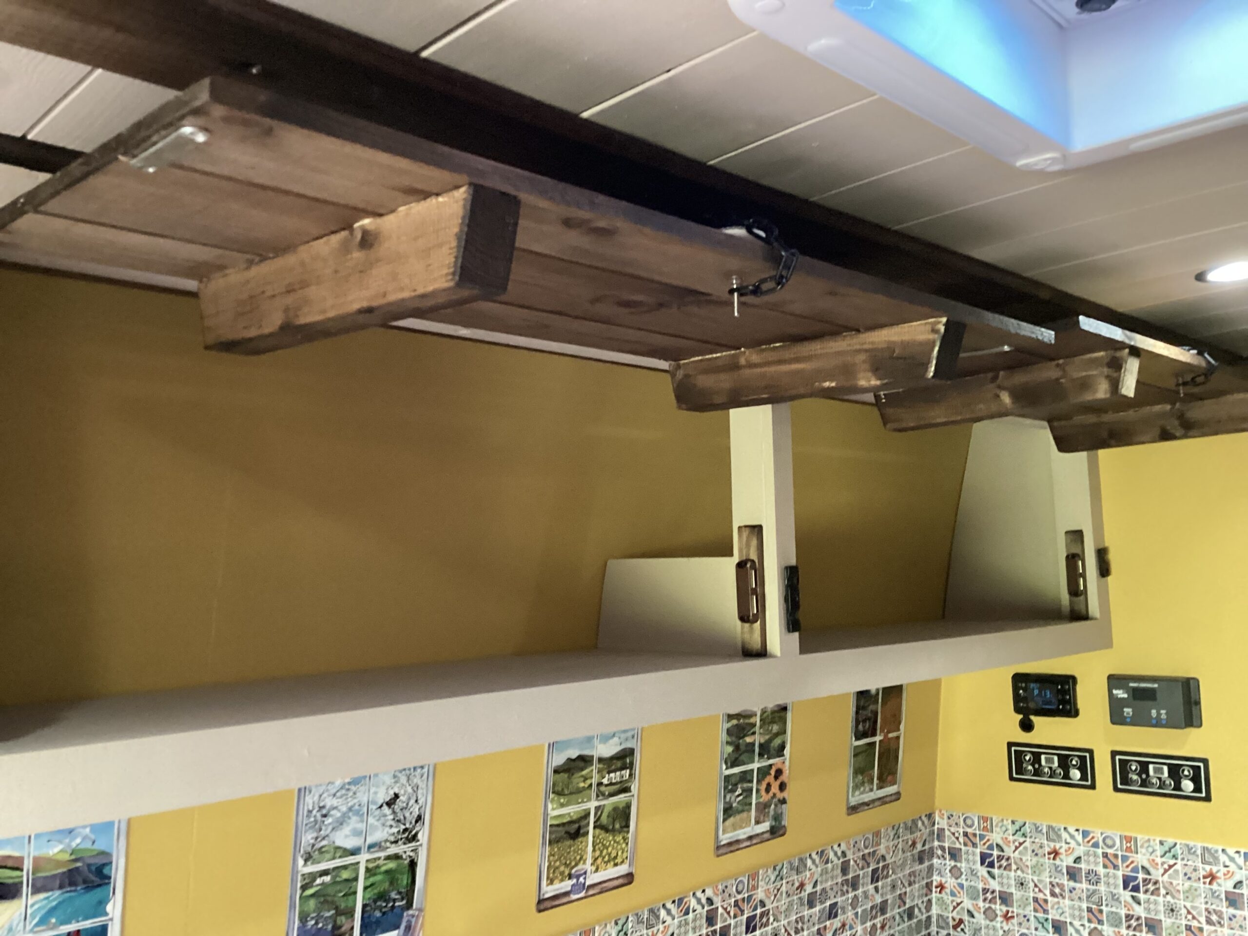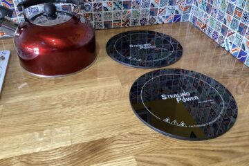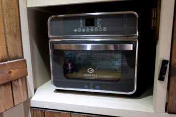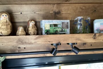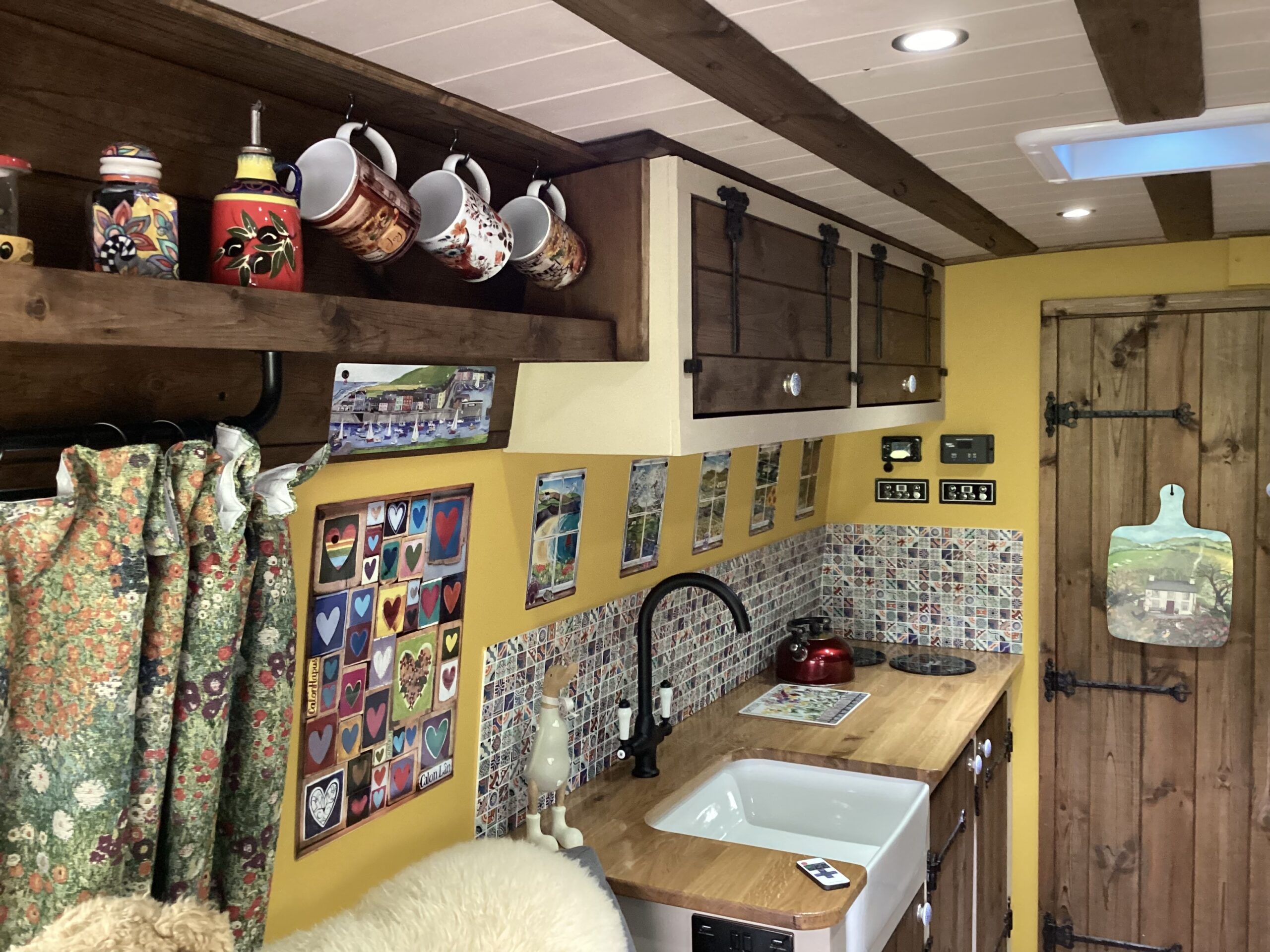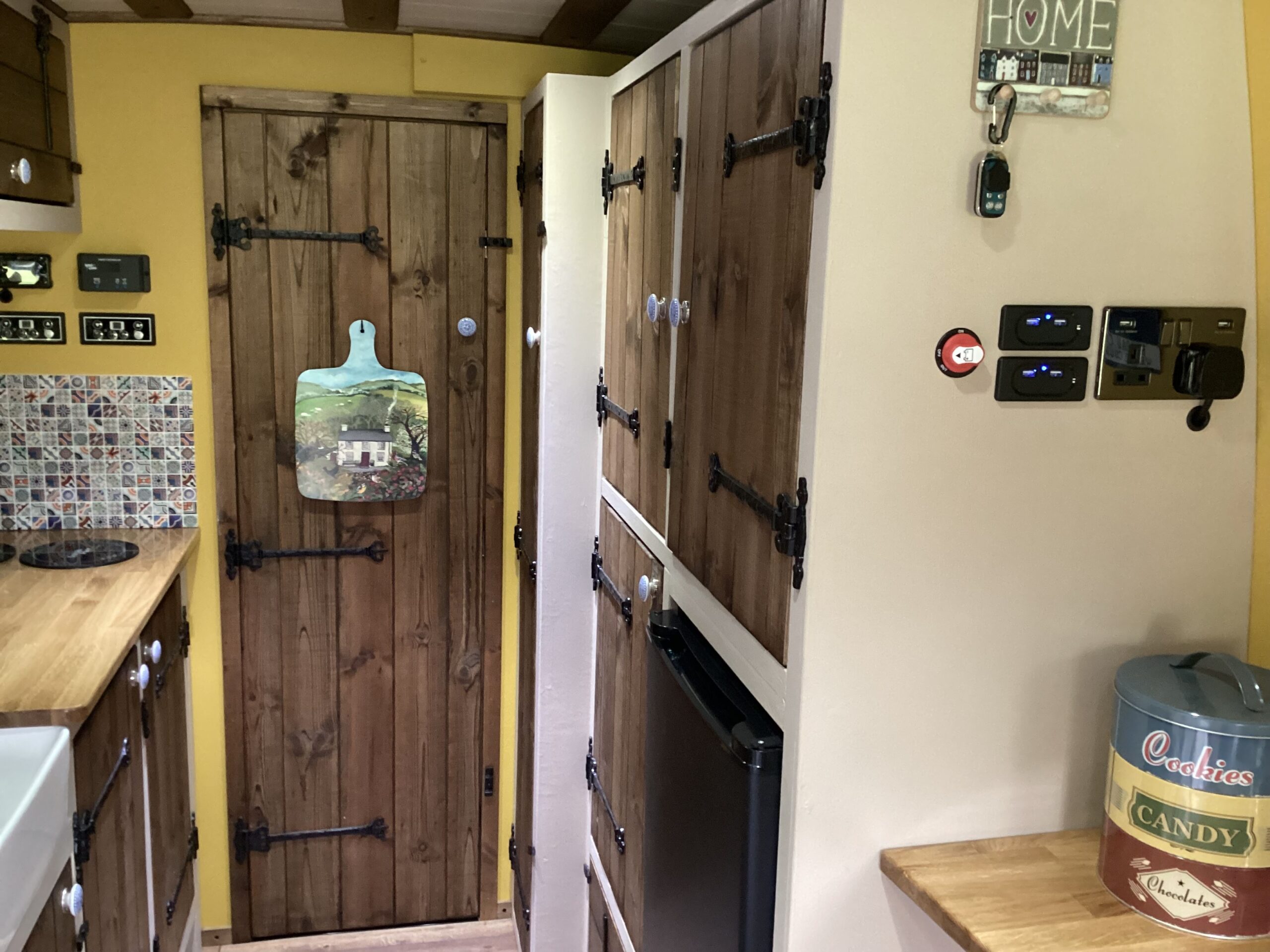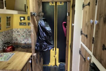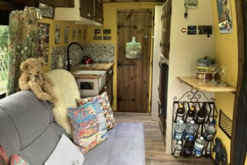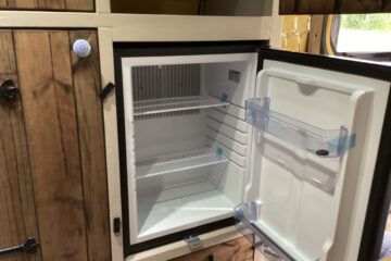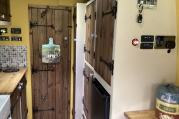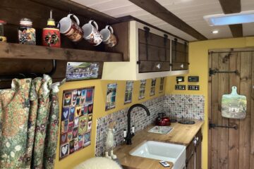 Country style kitchen complete with butler sink, oak worktop, 2 induction hobs, 240/12v absorption (silent) fridge and a retro mini oven/air fryer. Roof vent with built in light and two way fan. A beautiful 12 bottle wine rack which will also fit 2 Lt bottles. With plenty of cupboard space. Foldable, height adjustable bamboo table which can be used inside or outside.