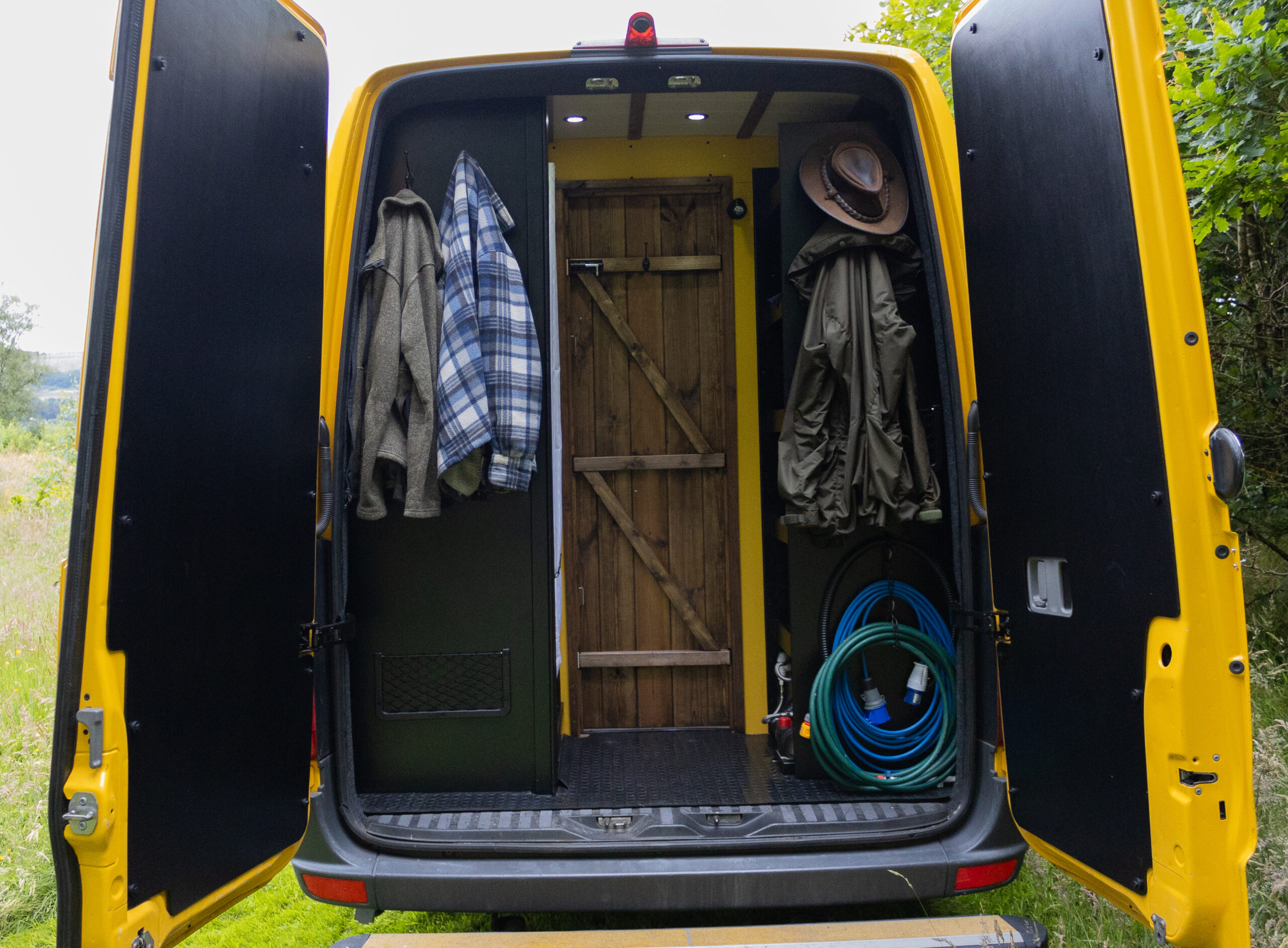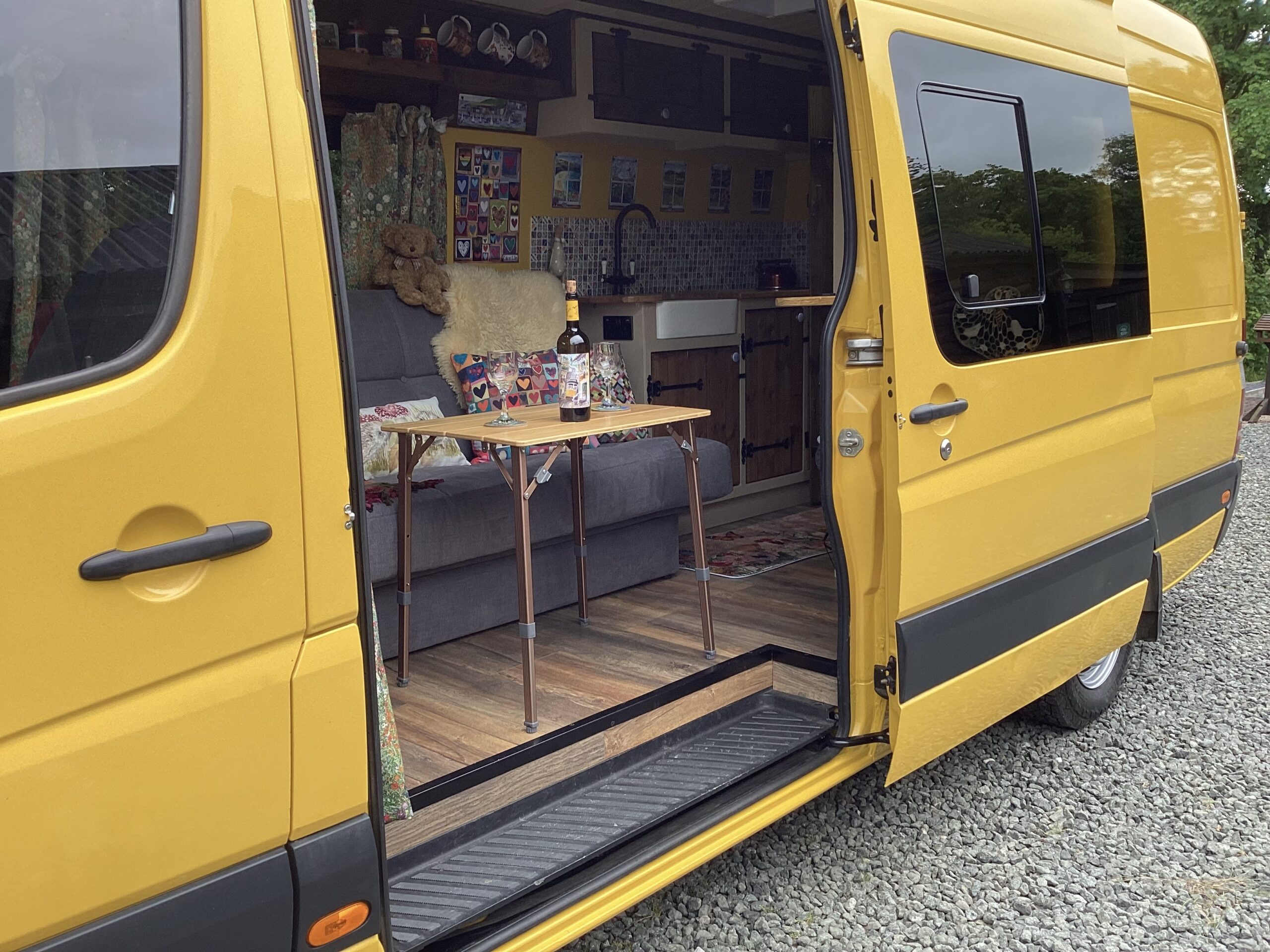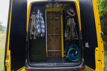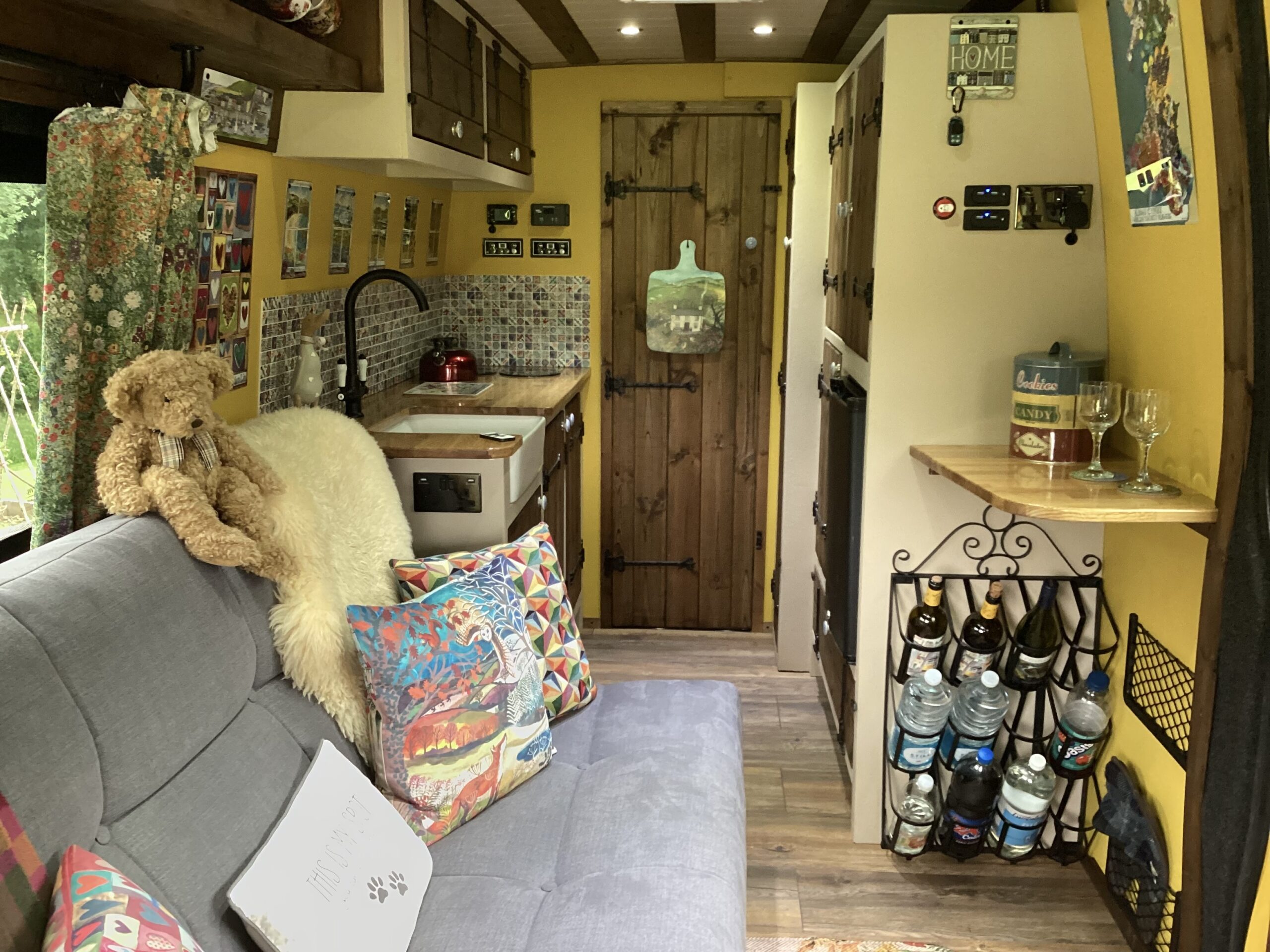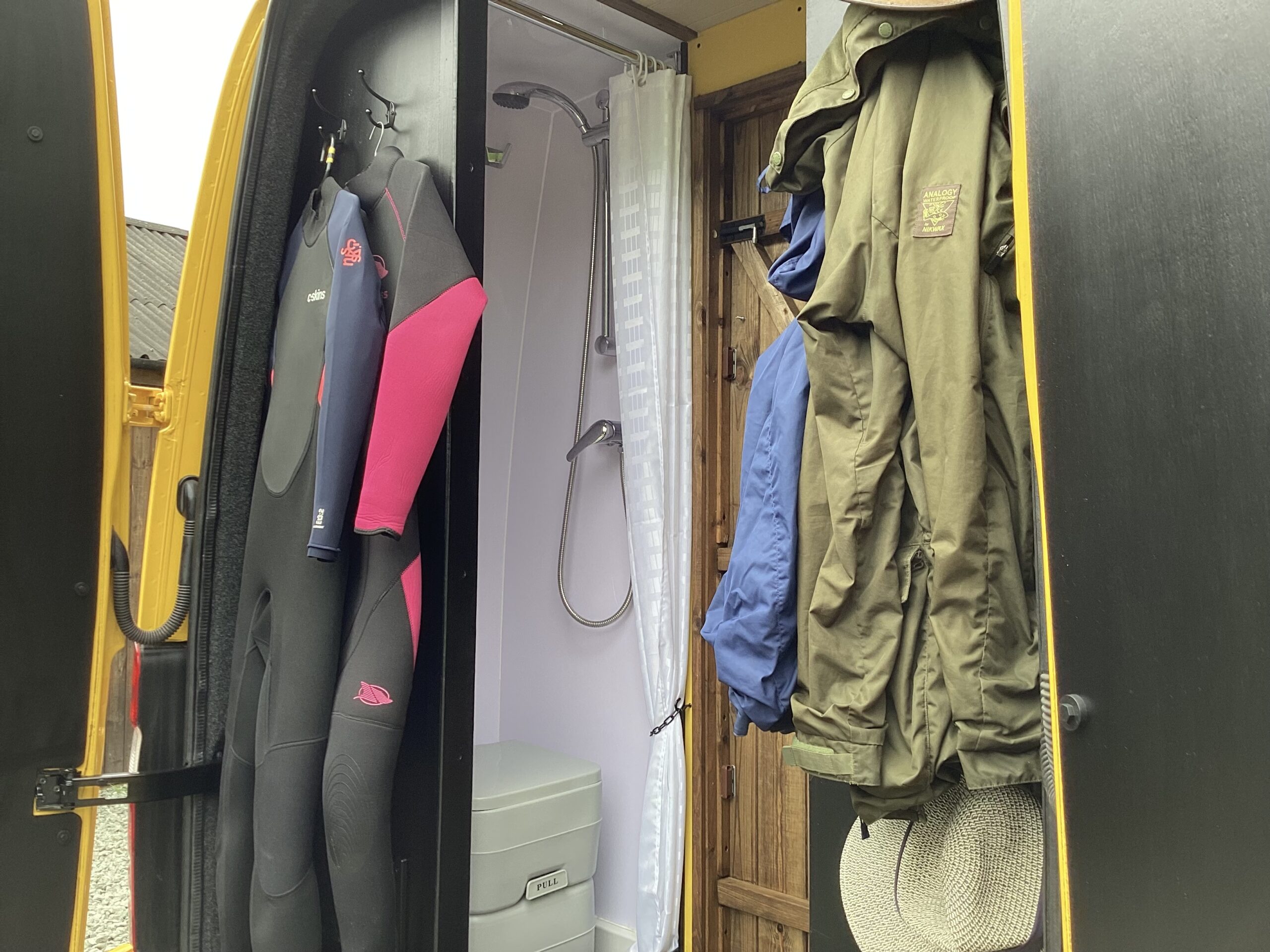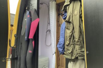 The layout of the van has been designed so two people can comfortably live within the space without falling over each other, whilst being able to take in the scenery from the comfort of the sofa. A separate shower/toilet/storage room being at the back of the van gives privacy and useful space for wet coats, boots etc.
