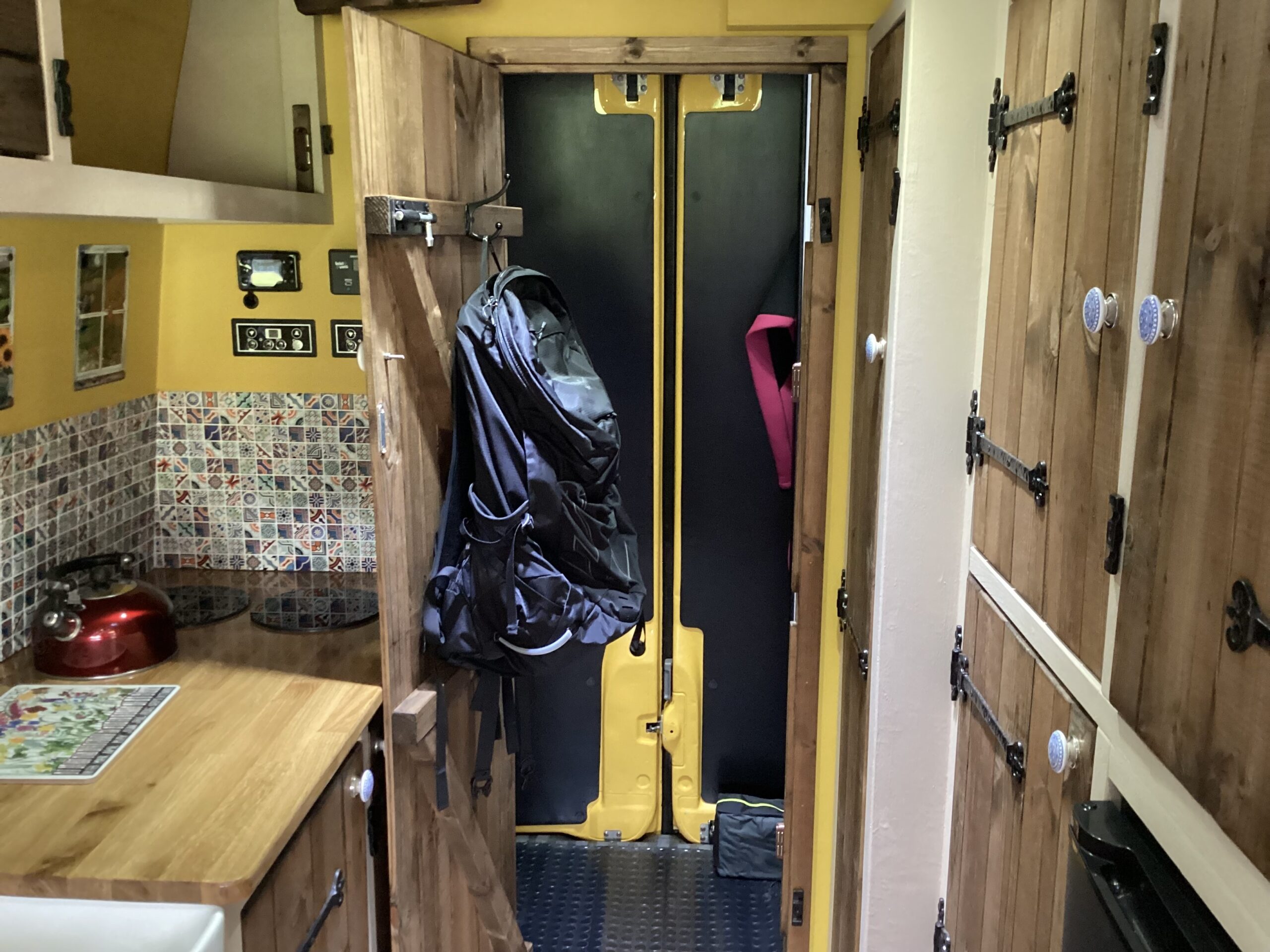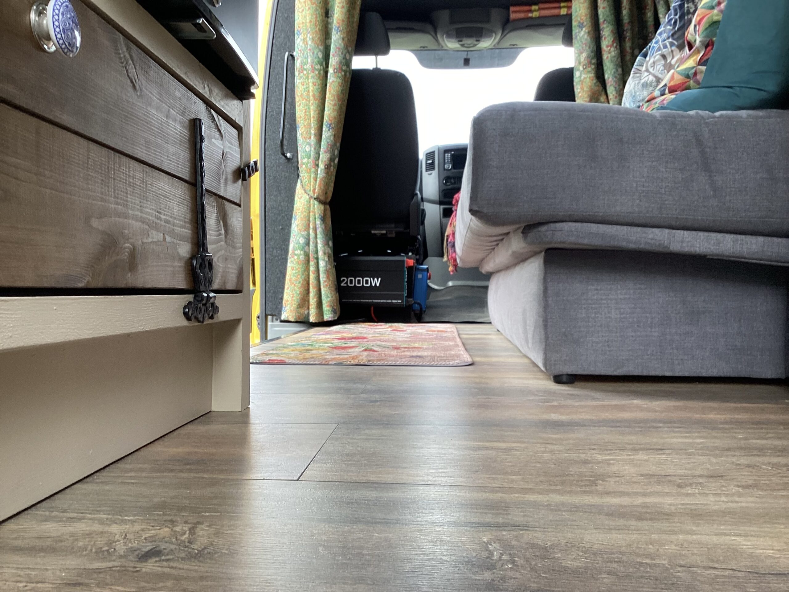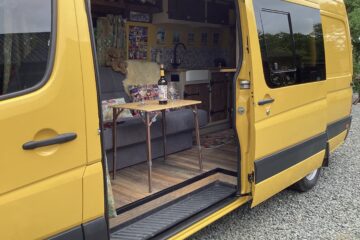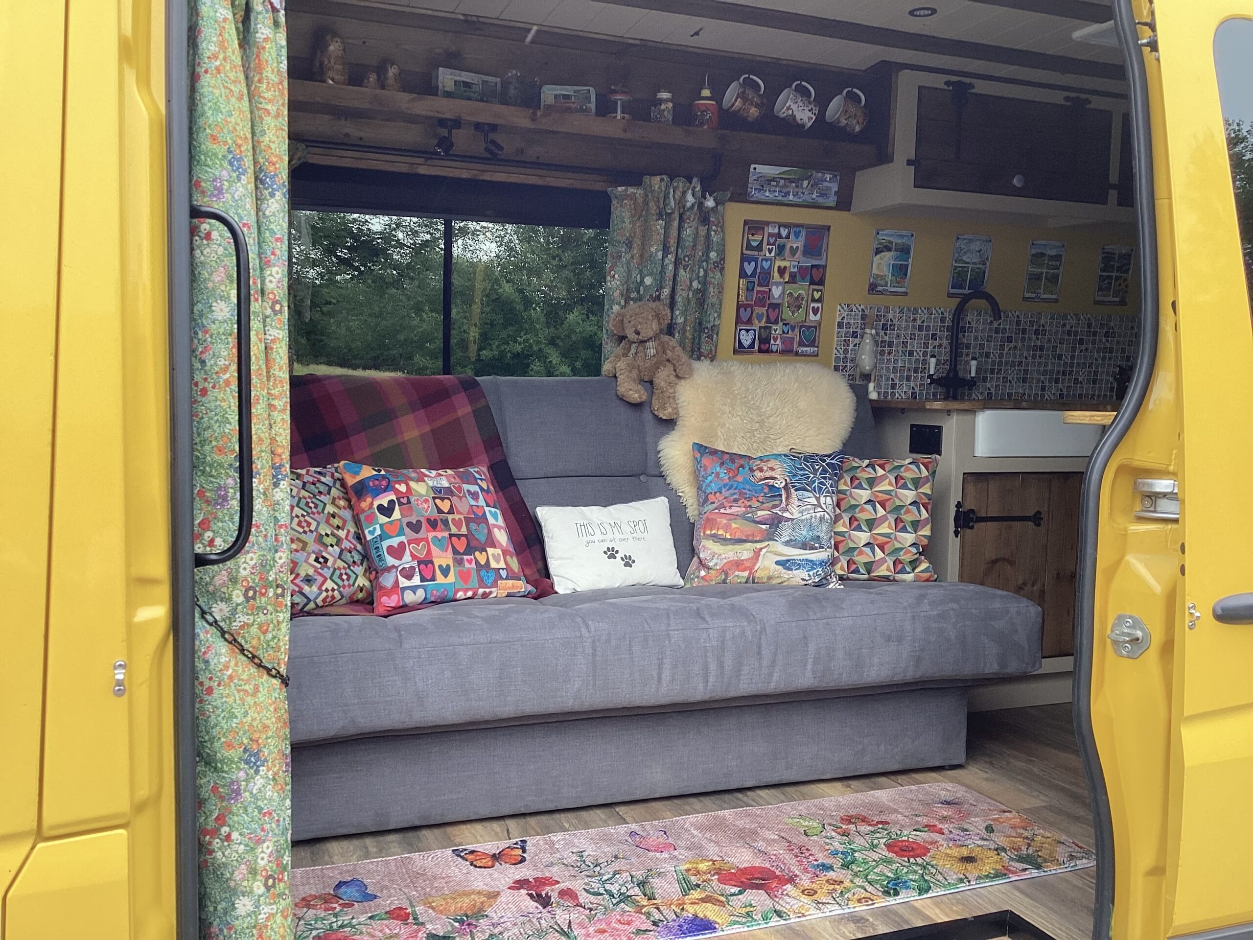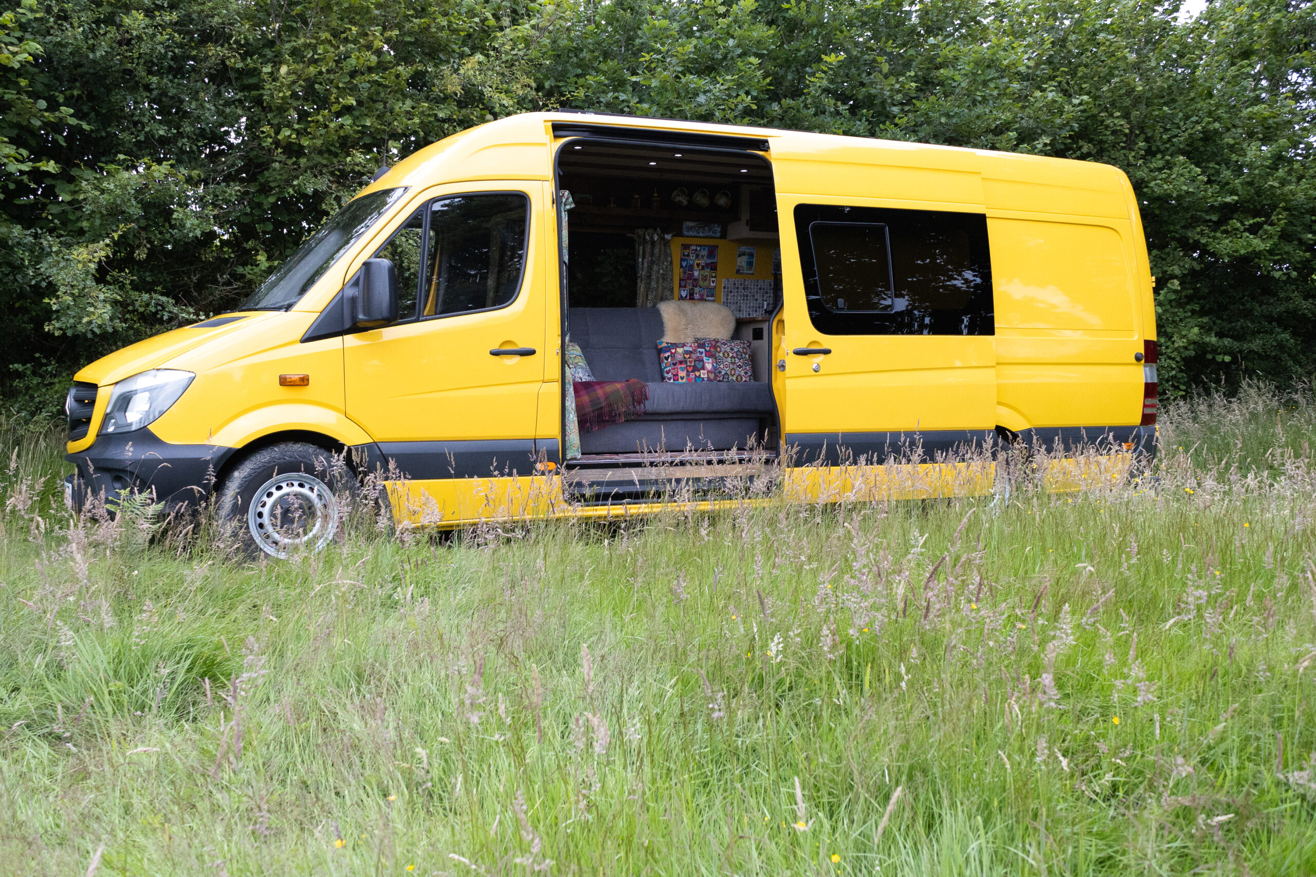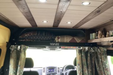 The layout of the van has been designed so two people can comfortably live within the space without falling over each other, whilst being able to take in the scenery from the comfort of the sofa. A separate shower/toilet/storage room being at the back of the van gives privacy and useful space for wet coats, boots etc.
