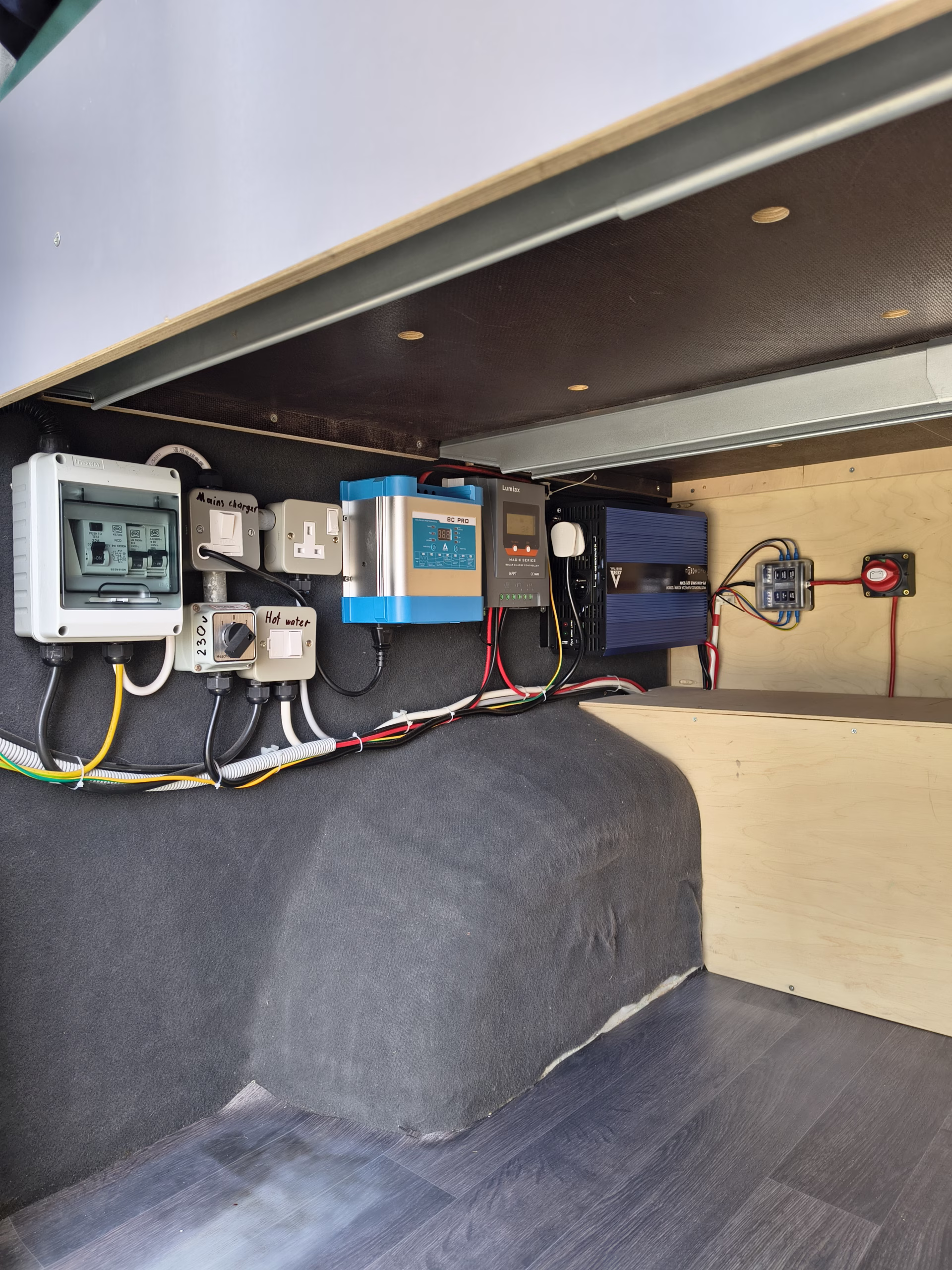 Solar panel – 300w panel, connected to a double pole isolator switch so that it can be turned off, this then leads to the MPPT solar charge controller which then links to the battery