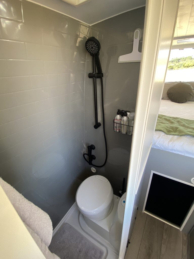 – 100L water fresh, 75L grey. Hot & cold water system to kitchen sink, shower and external shower hose (for dog washing). Also plumbed toilet flush.