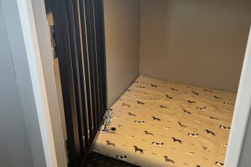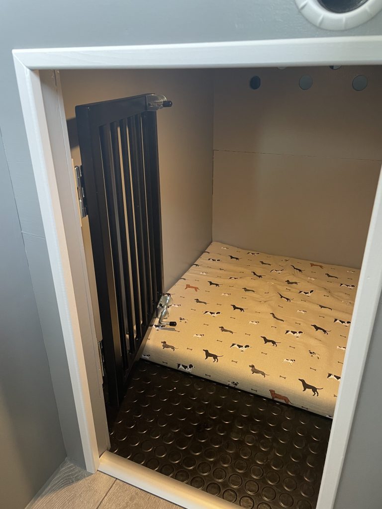 – Secure under bed dog crate with rubber matting, mattress and steel welded door.