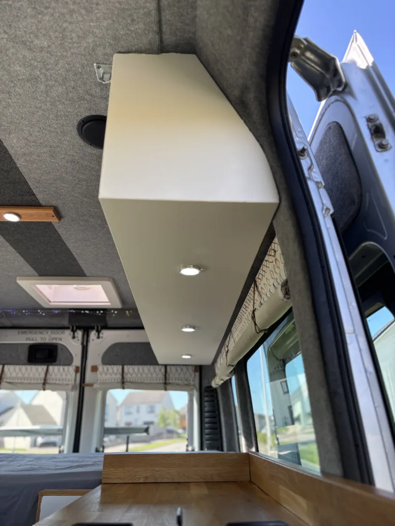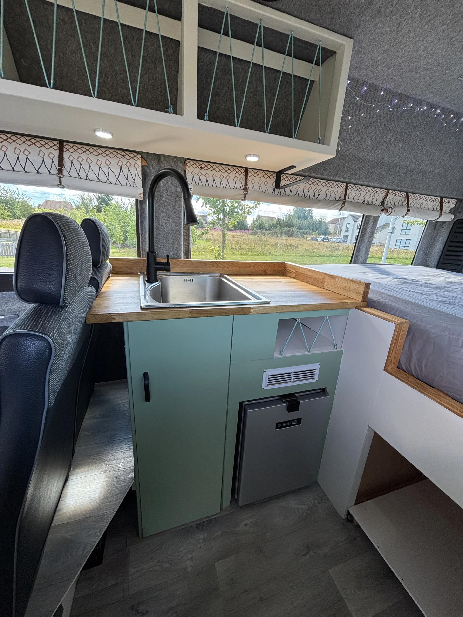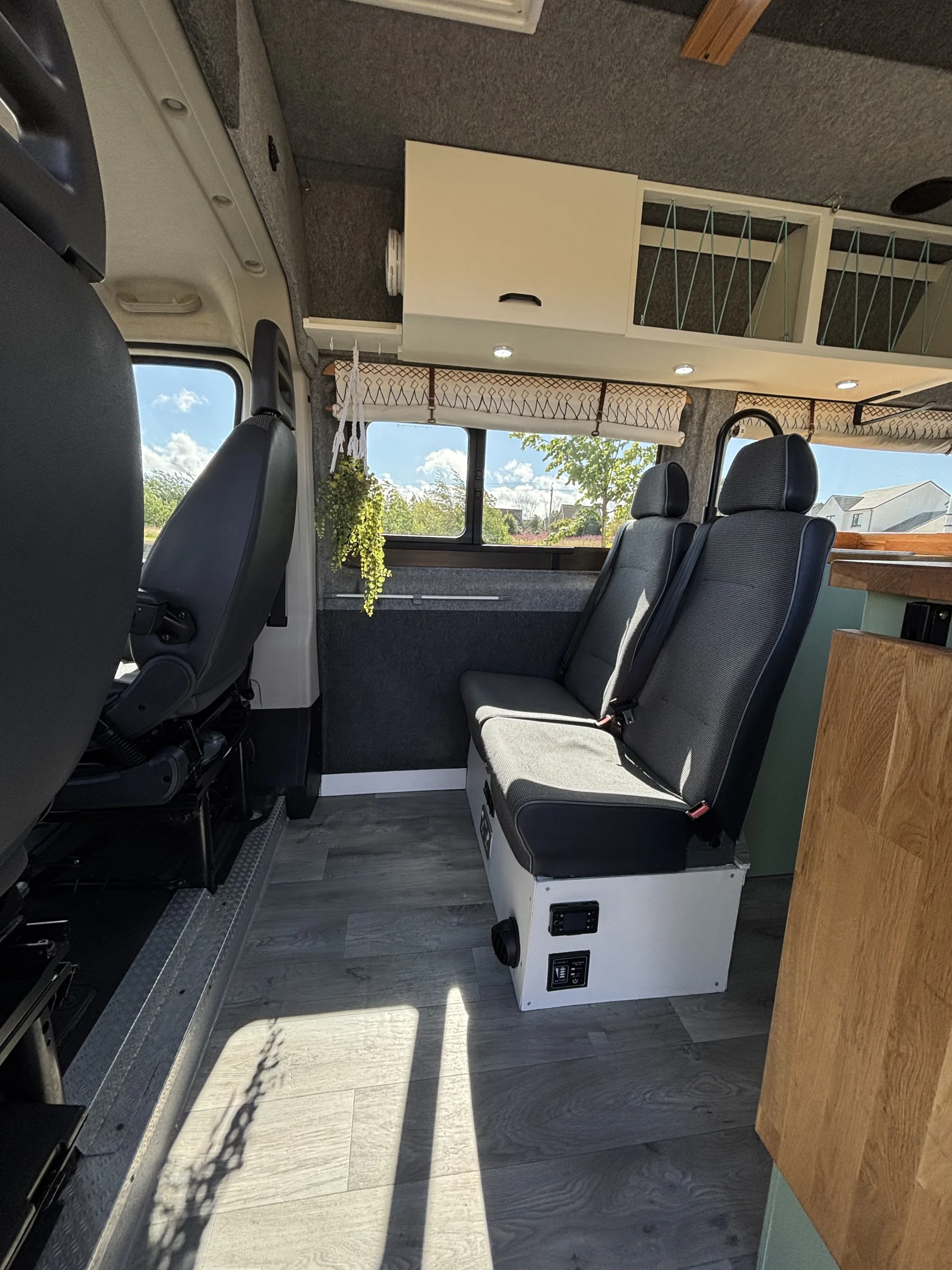 2 bunkbeds can be attached over the front seats. They go one on top of each other. Can hold up to 70kg per person. These will be included with the sale of the van.