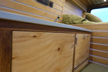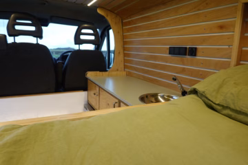 The van has been fully insulated using a combination of Celotex rigid board and recycled plastic insulation, finished with a full vapour barrier for year-round comfort. All furniture is hand-built using quality lightweight materials, creating a clean, minimal and durable interior throughout.