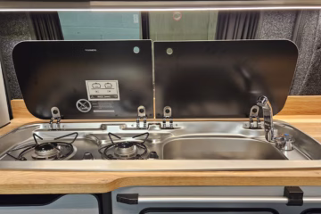 > Integrated Dometic gas hob & cold water sink with slow-close glass lids