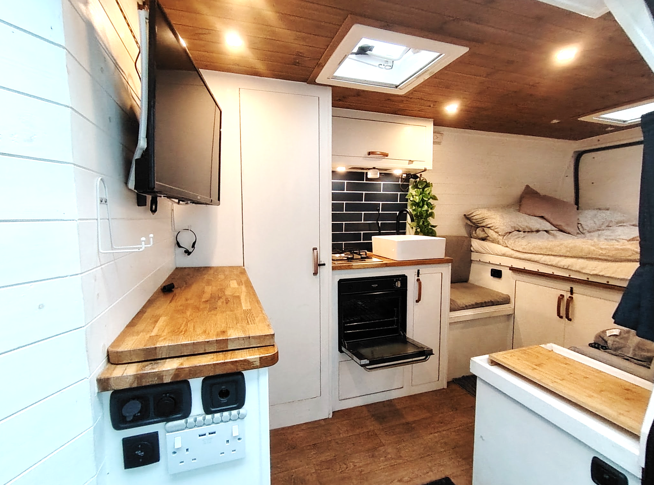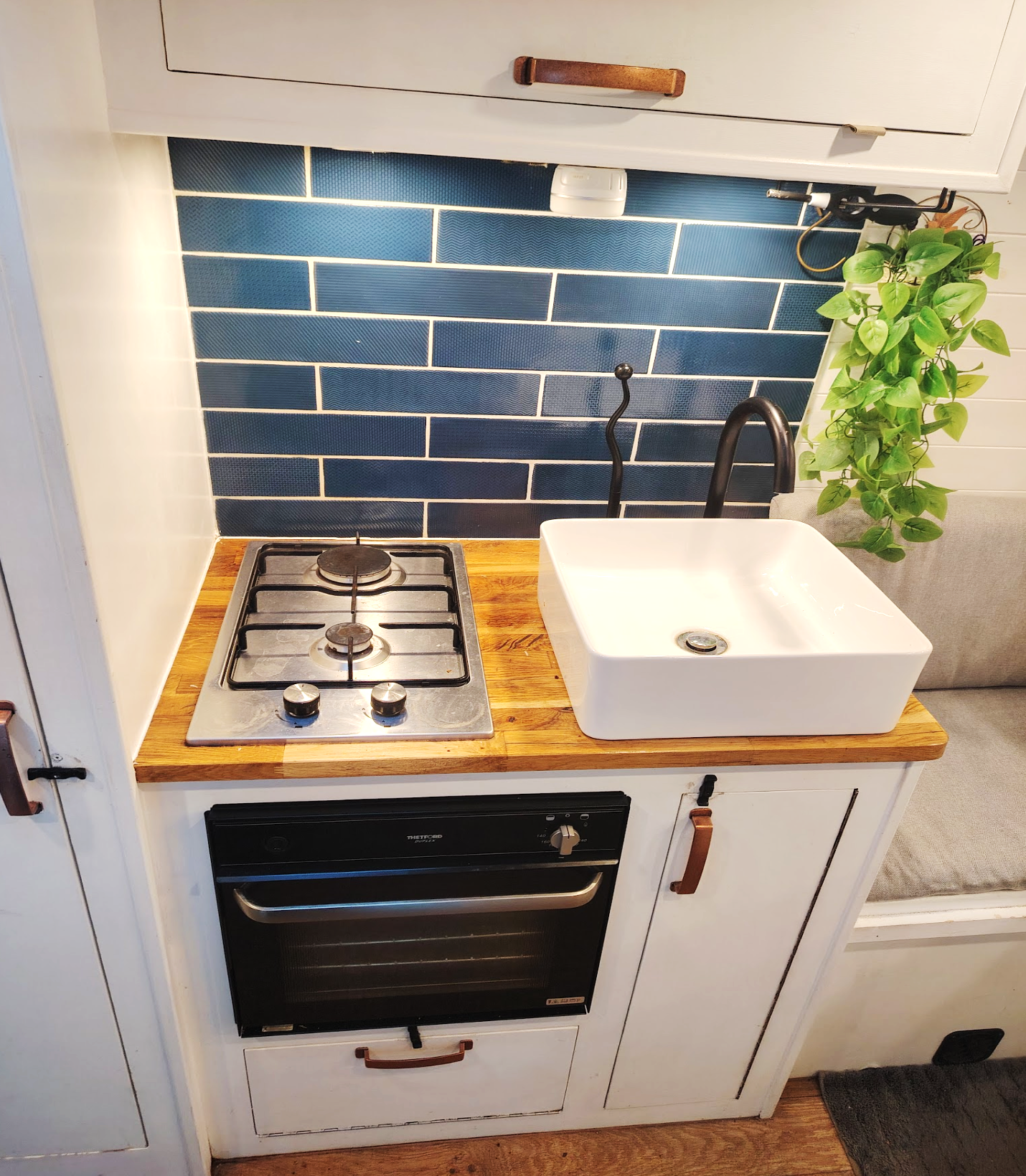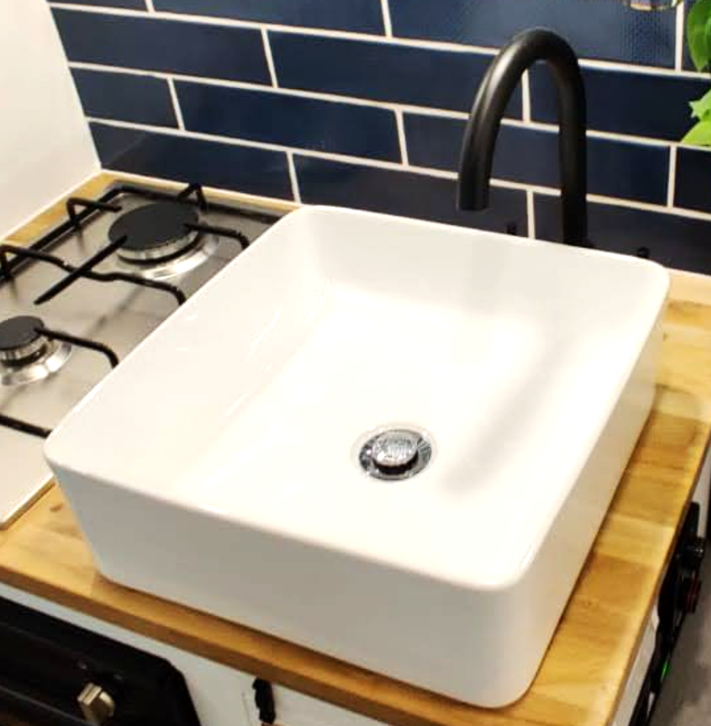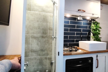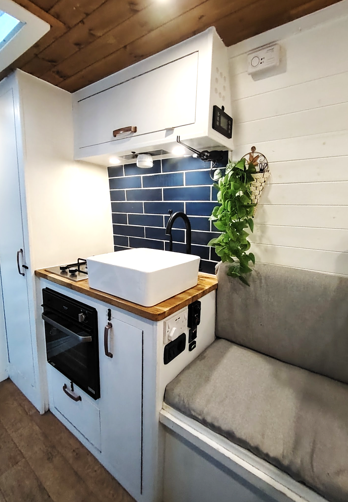 The kitchen area is equipped with a full range of appliances, including a fridge/freezer, gas oven, grill, and hob. A gas water heater supplies hot running water to both the shower and the custom low-profile ceramic sink and tap. Additional space for meal preparation is provided with the fold-out desk space which acts as a dual-purpose work / food prep area. Additionally, there is diesel-powered air heating and cooling from the main tank, ensuring comfort in all weather conditions.
